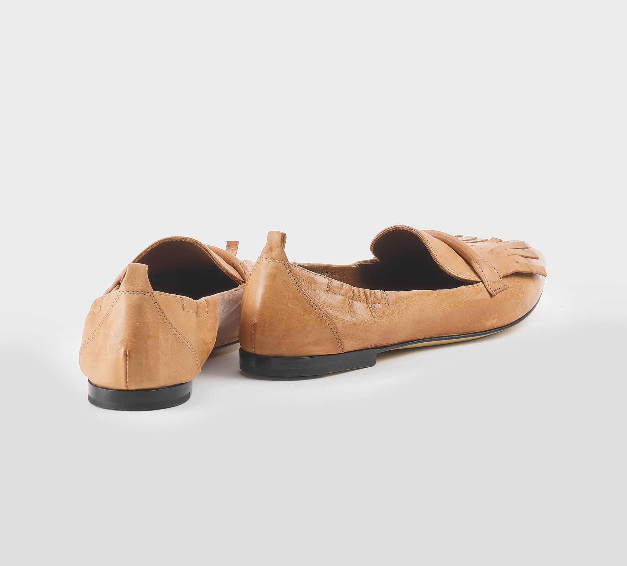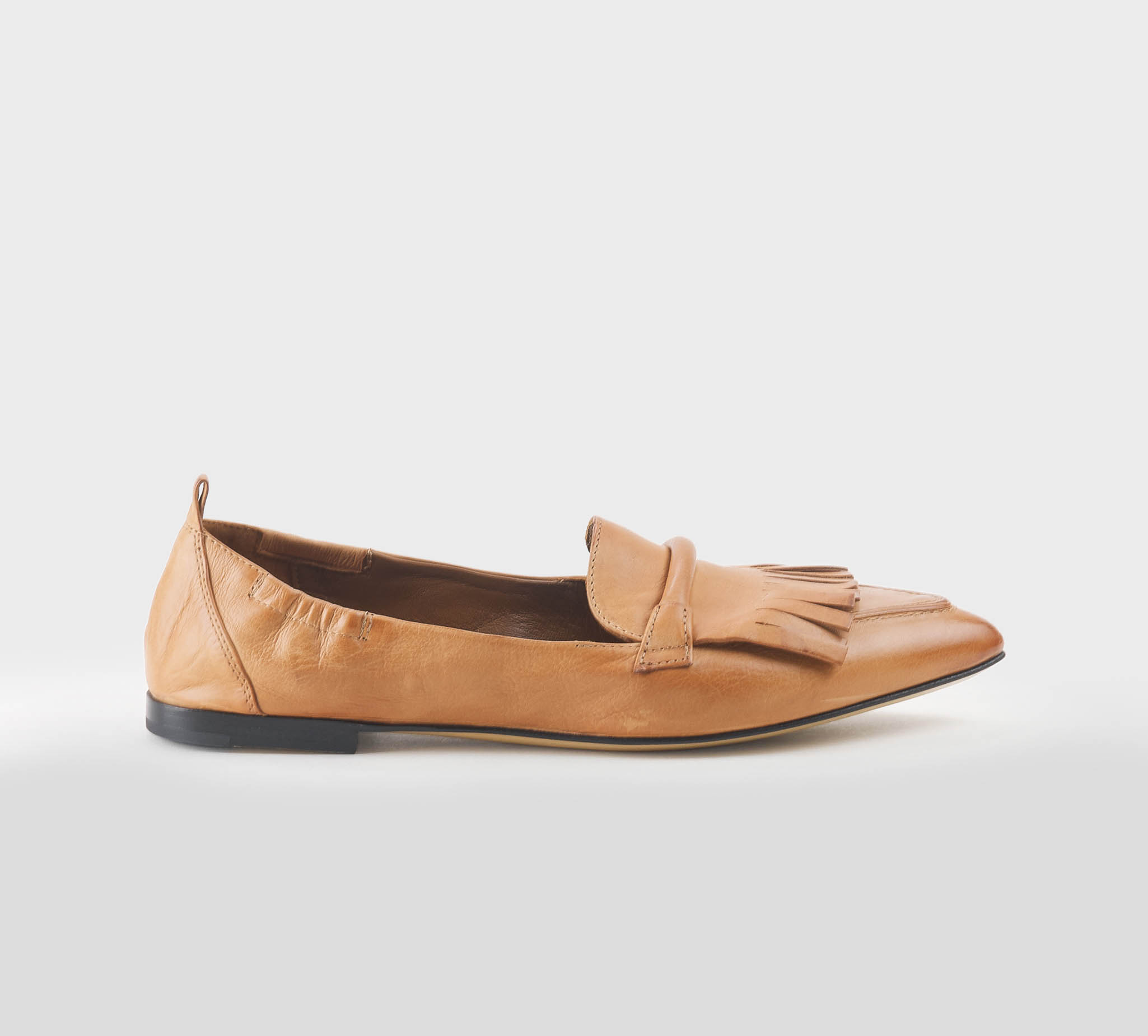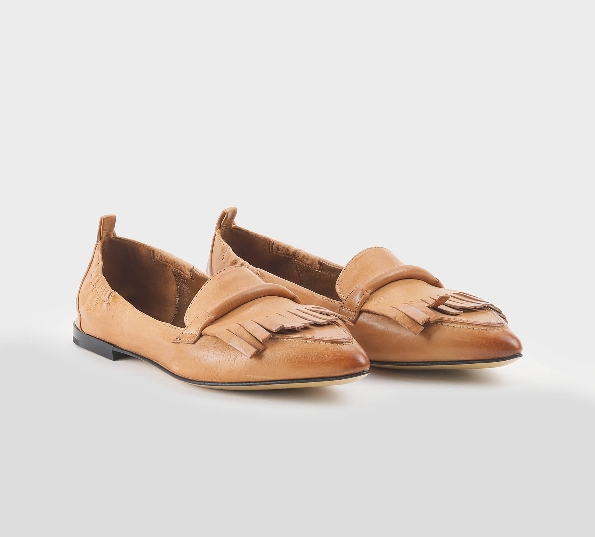 Mocaassino frange in pelle toffee -tacco cm 1,5 -calzata regolare Fondo cuoio Made in Italy ss 26