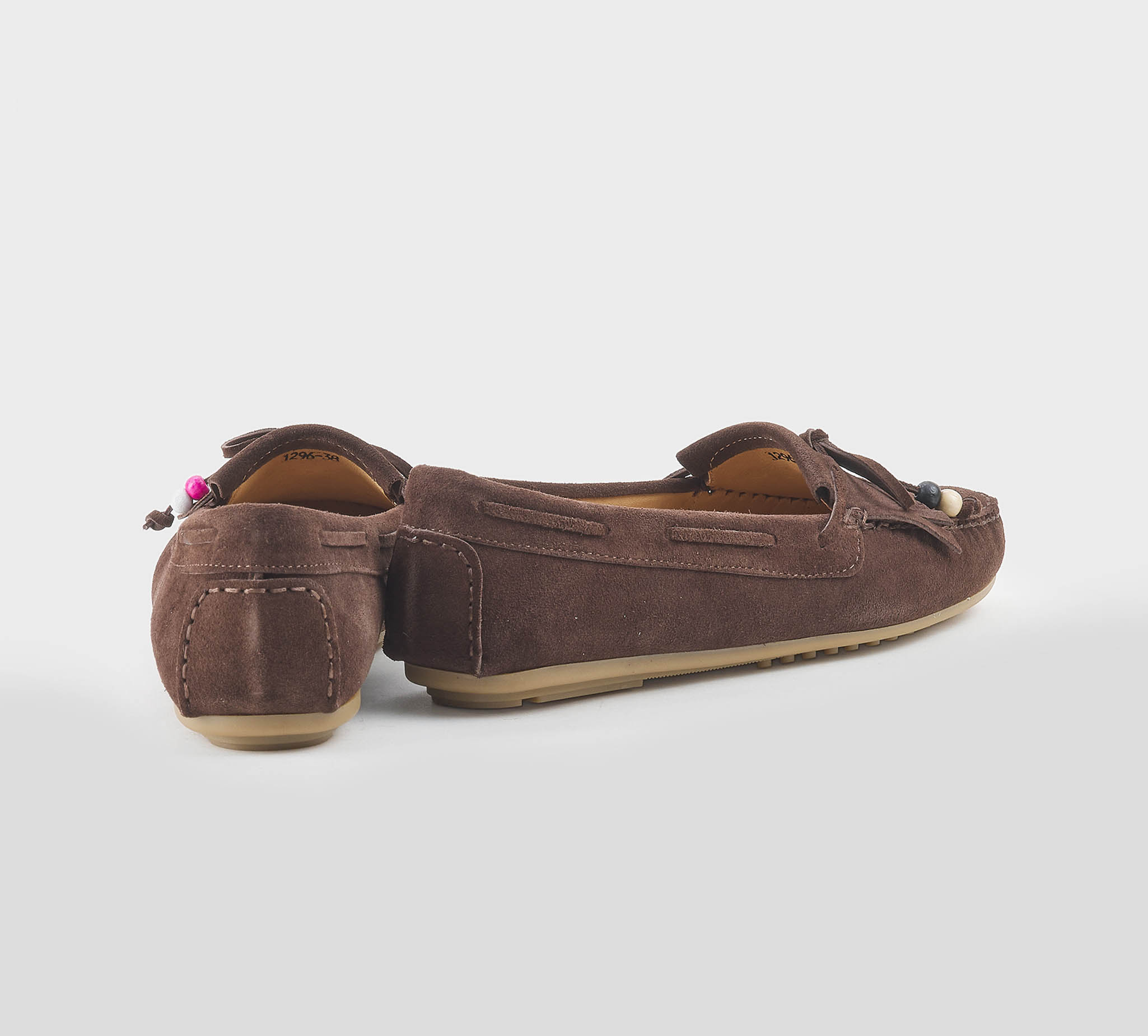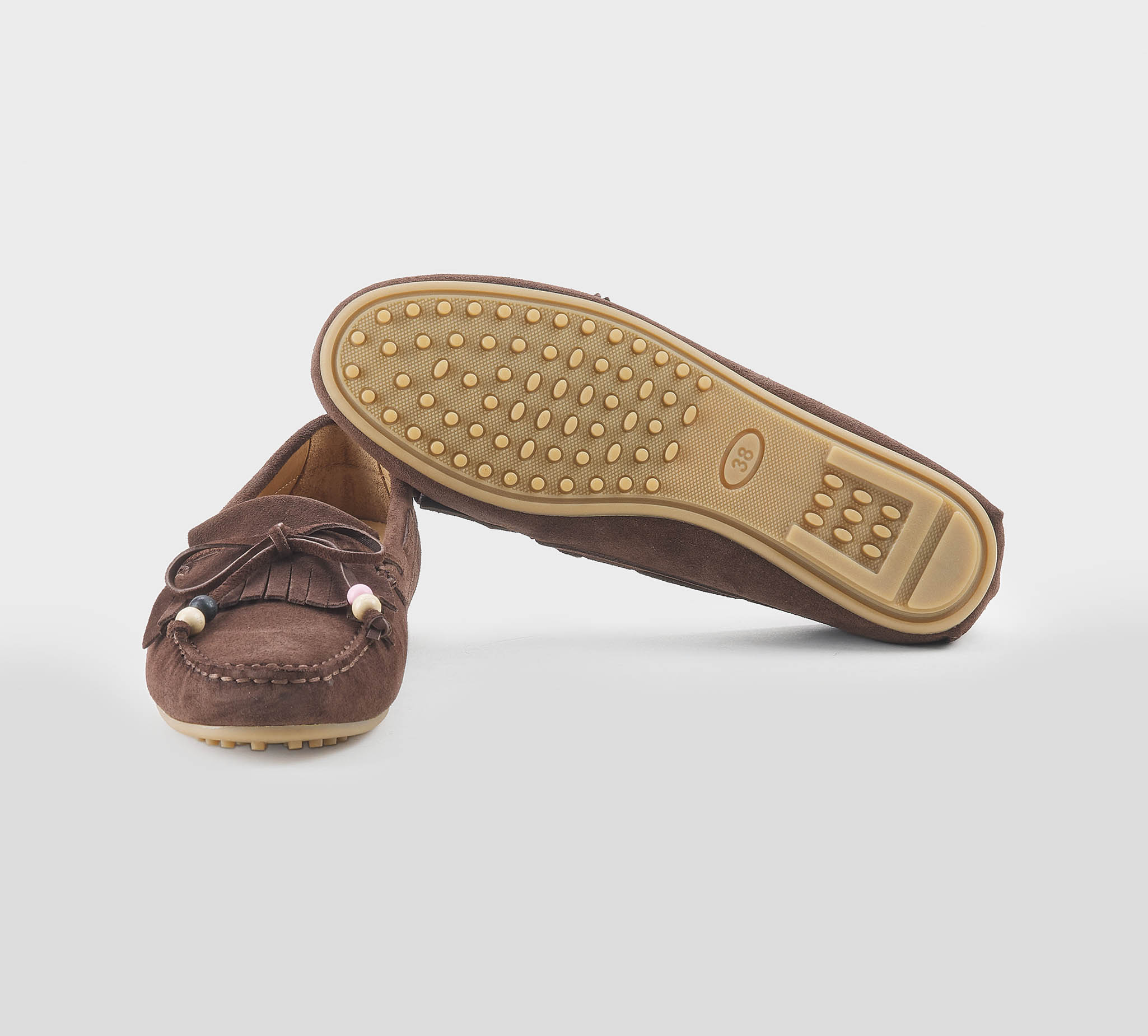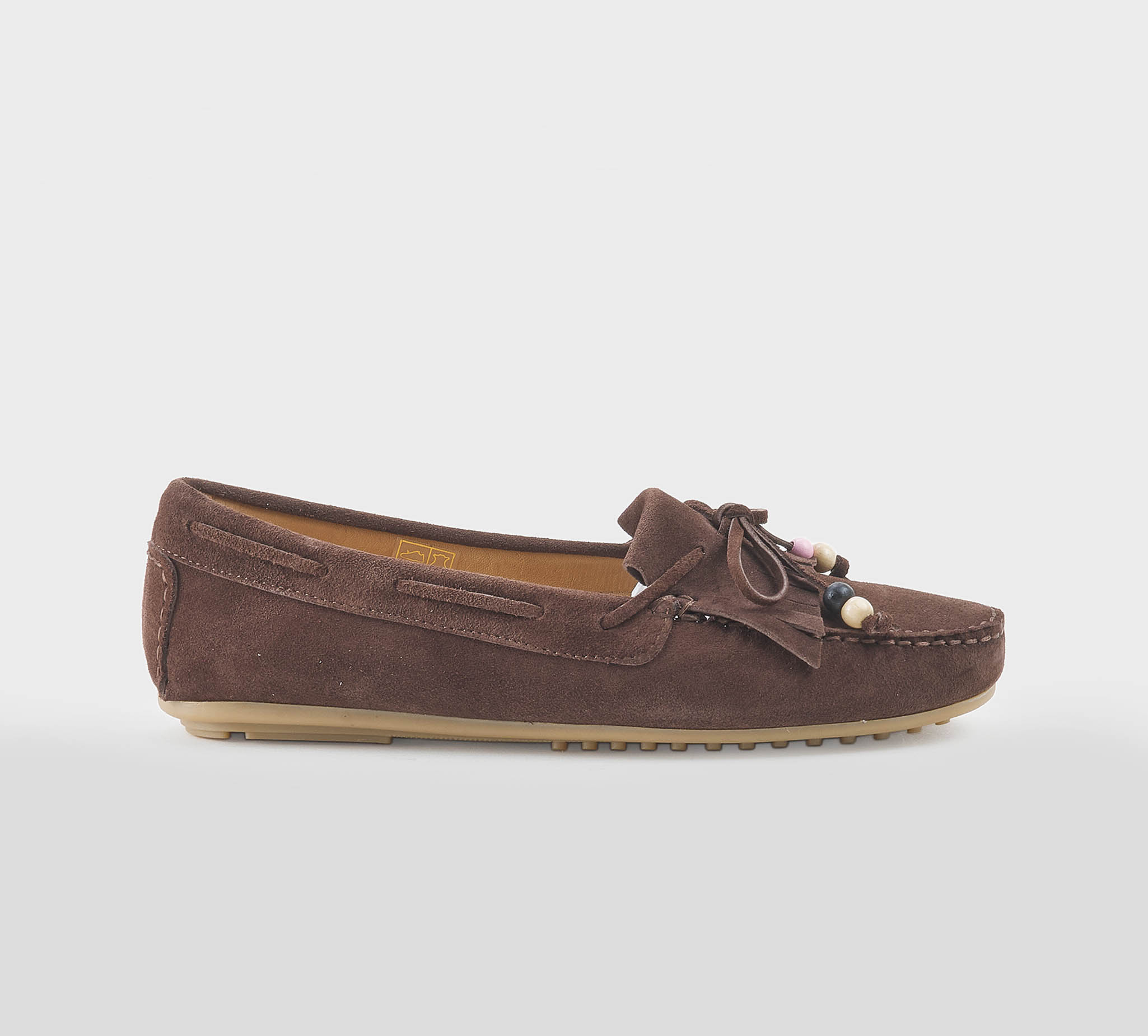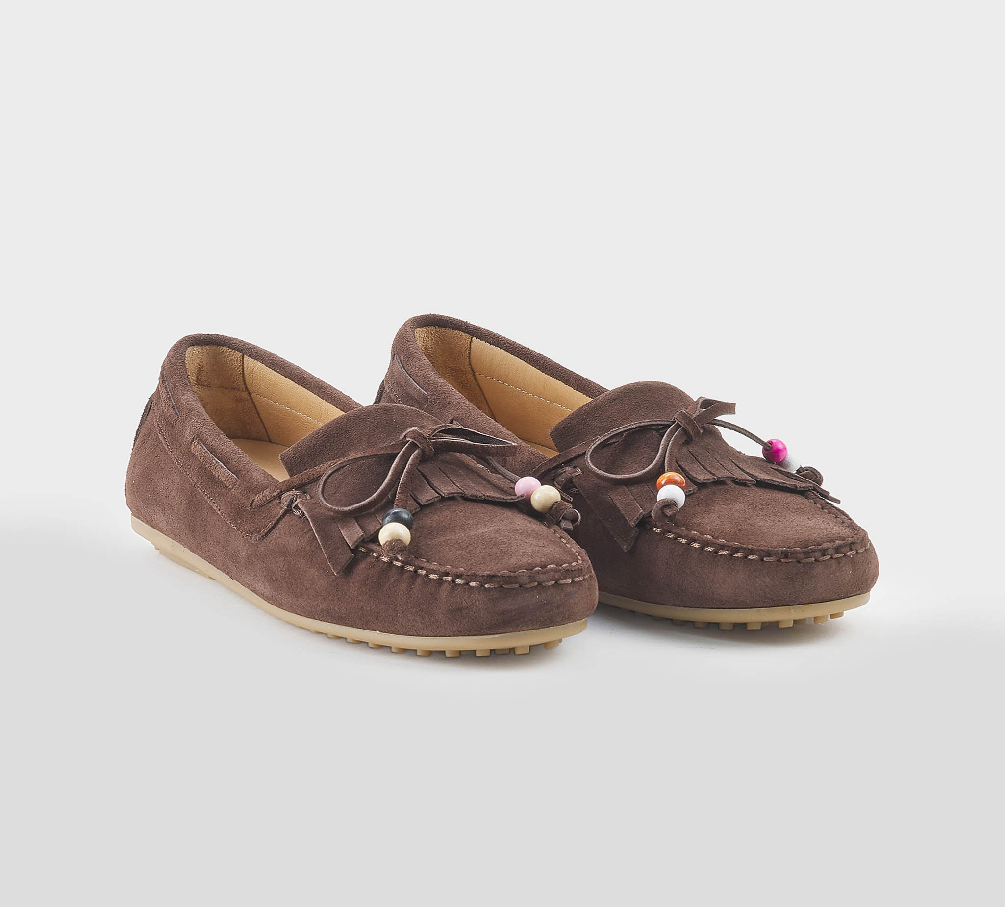 Mocassino frange in camoscio marrone -perline colorate -calzata scarsa Fondo gomma SS 26