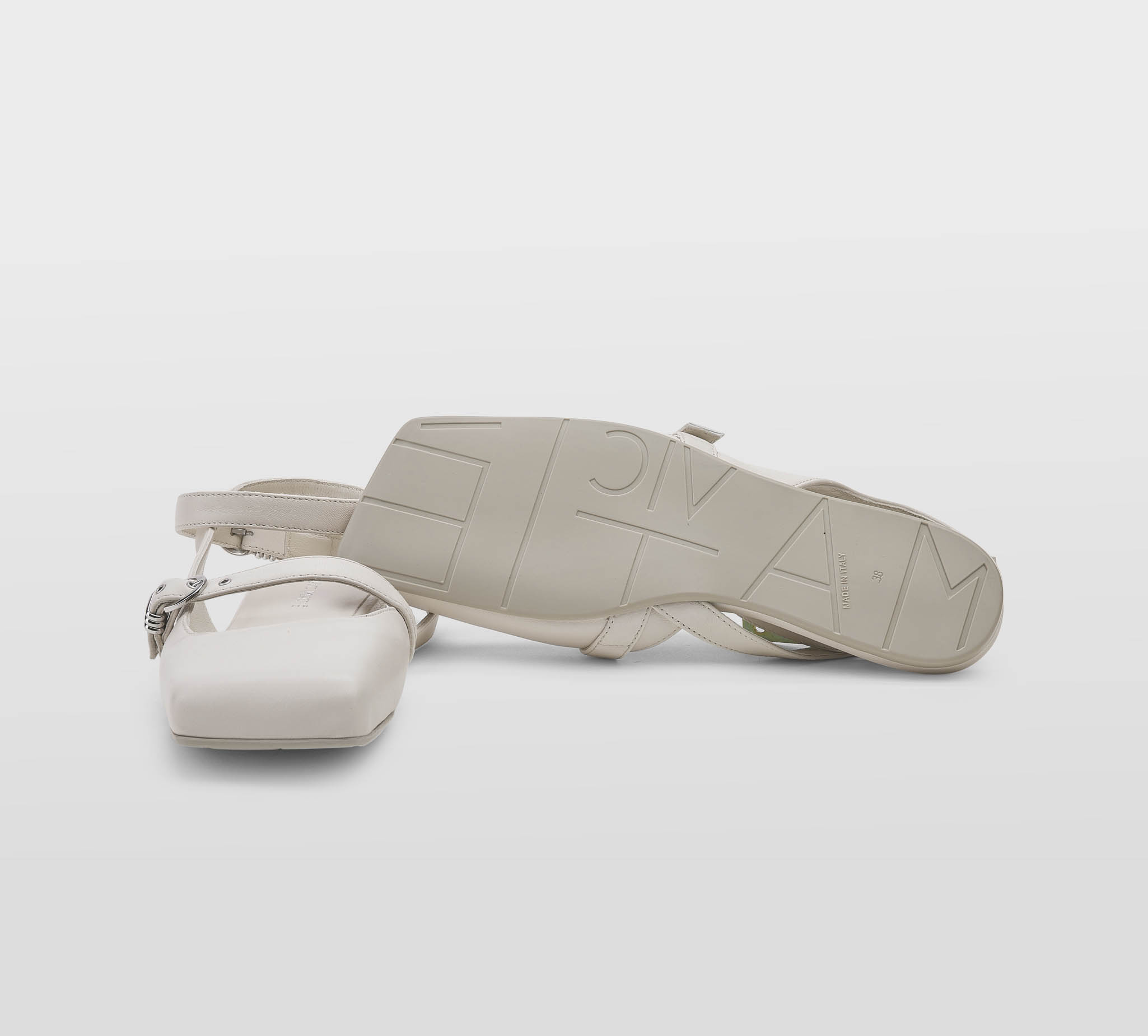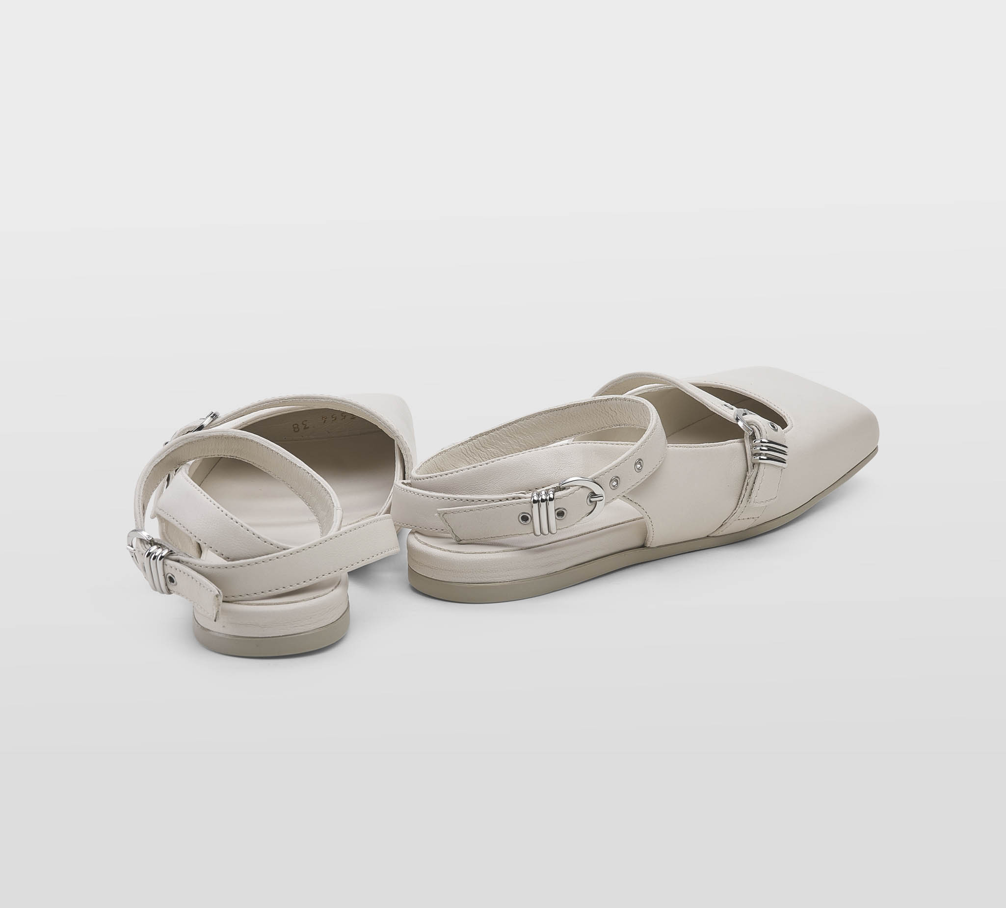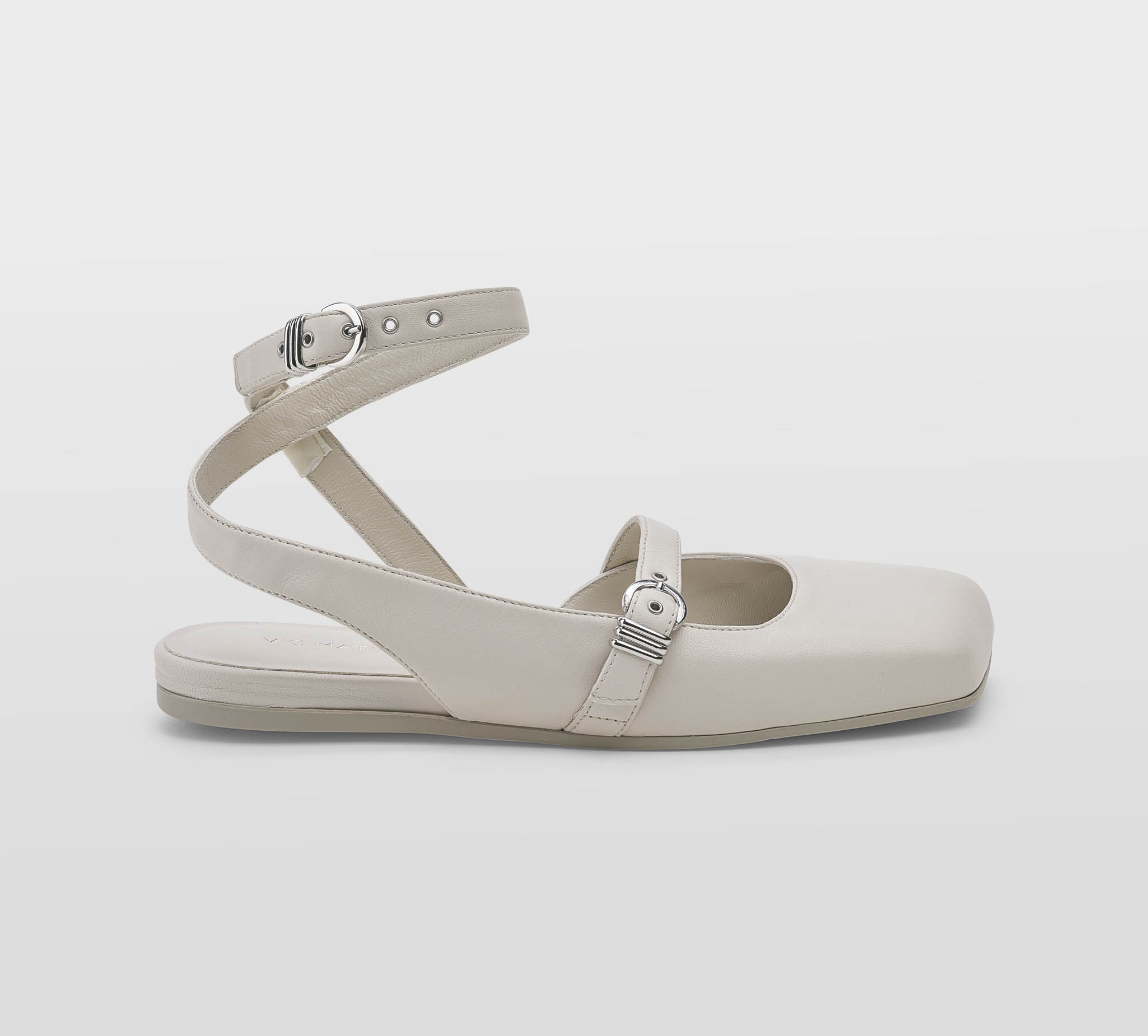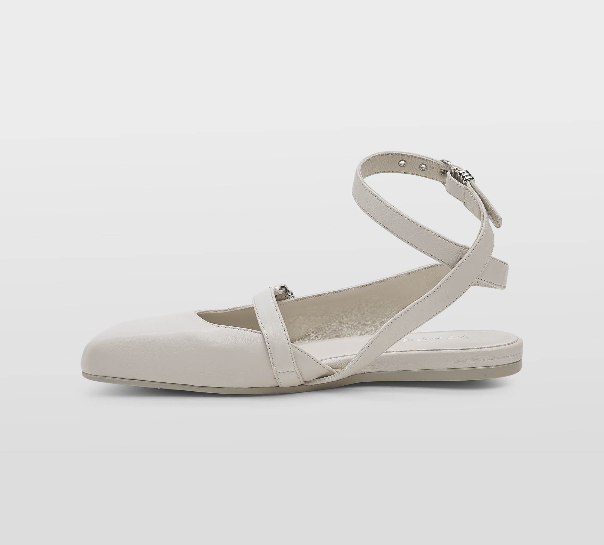 Ballerina pelle gesso -punta quadra -cinturino incrociato alla caviglia -fibbiette argento -plantare con zeppina -calzata regolare Fondo gomma Made in Italy,dust bag inclusa SS 25