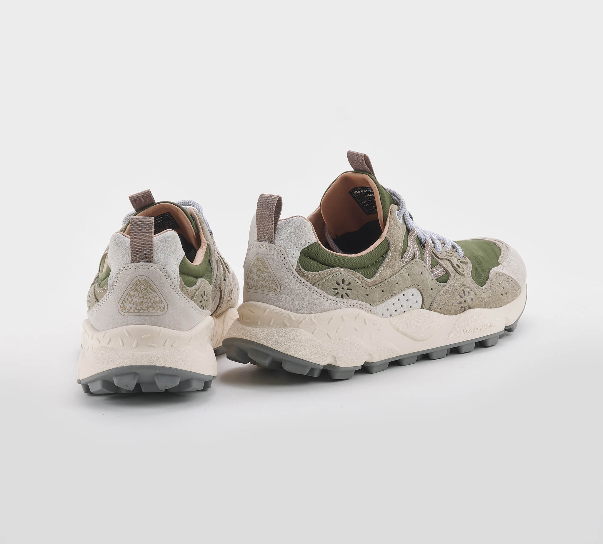 Sneakers Running tessuto tecnico militare -inserti tessuto tecnico giallo -inserti camoscio tortra,salvia -laccio bainco nero -calzata regolare Fondo gomma Made in Italy SS 26