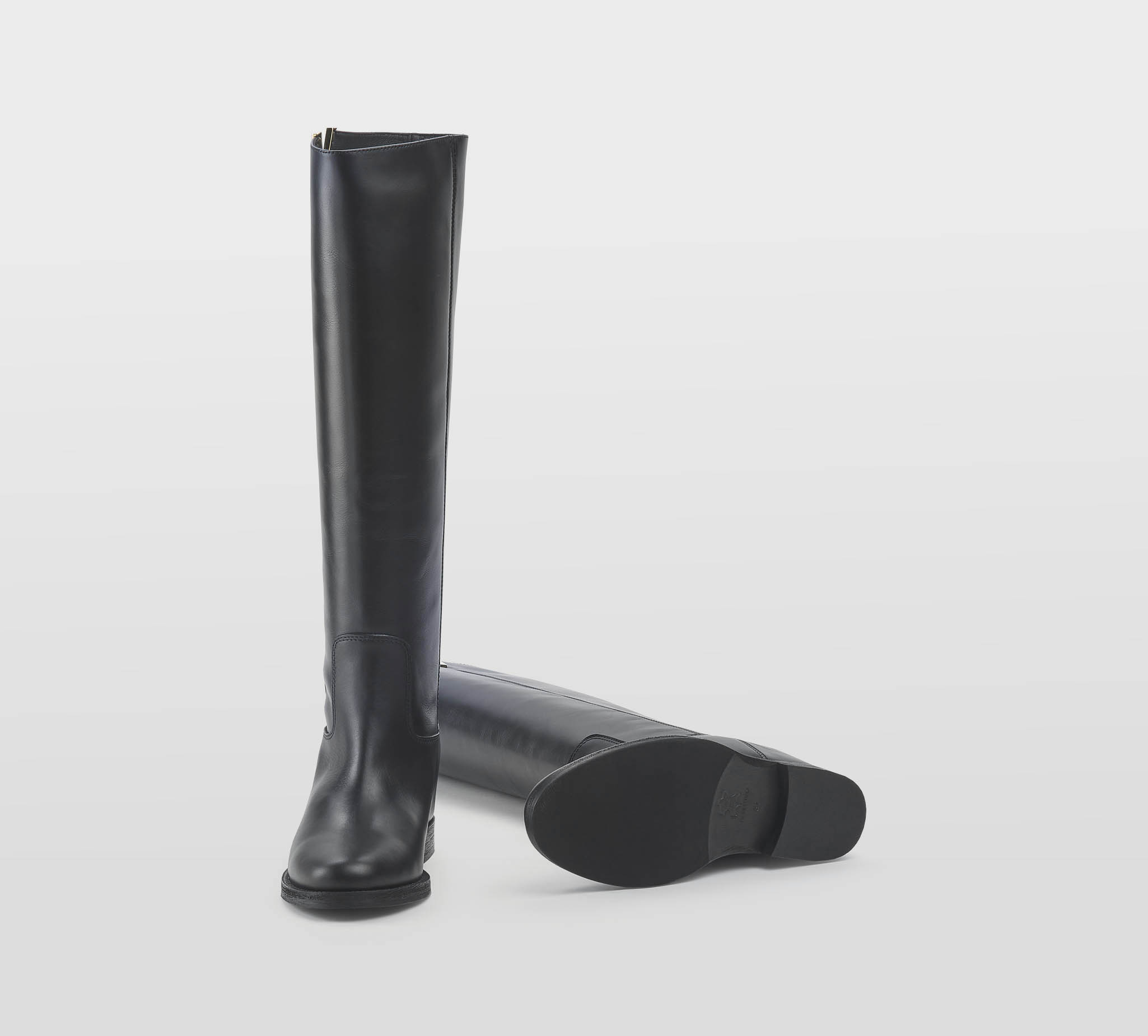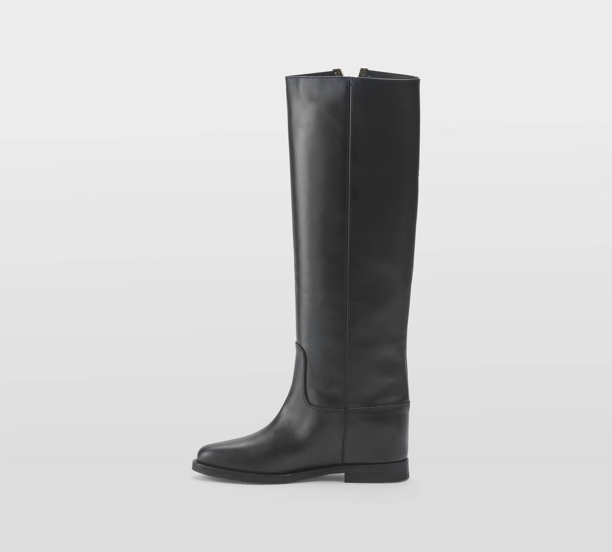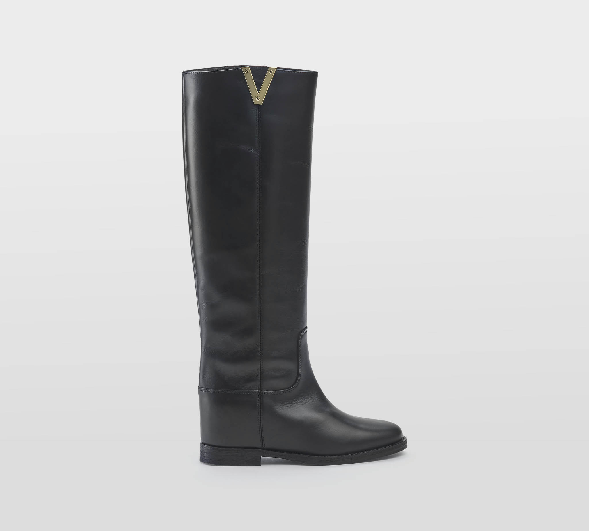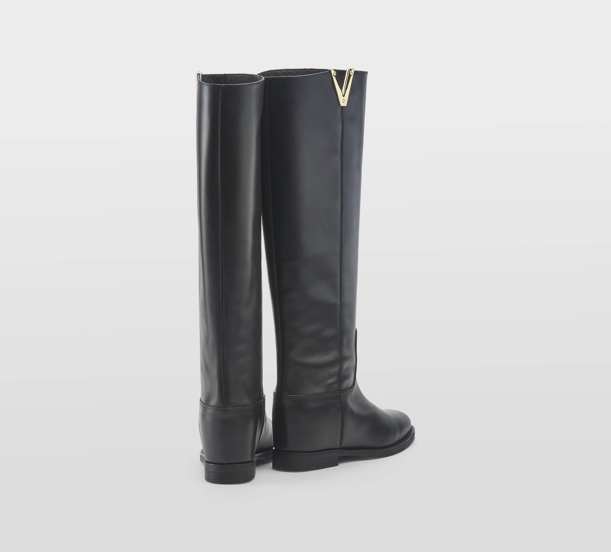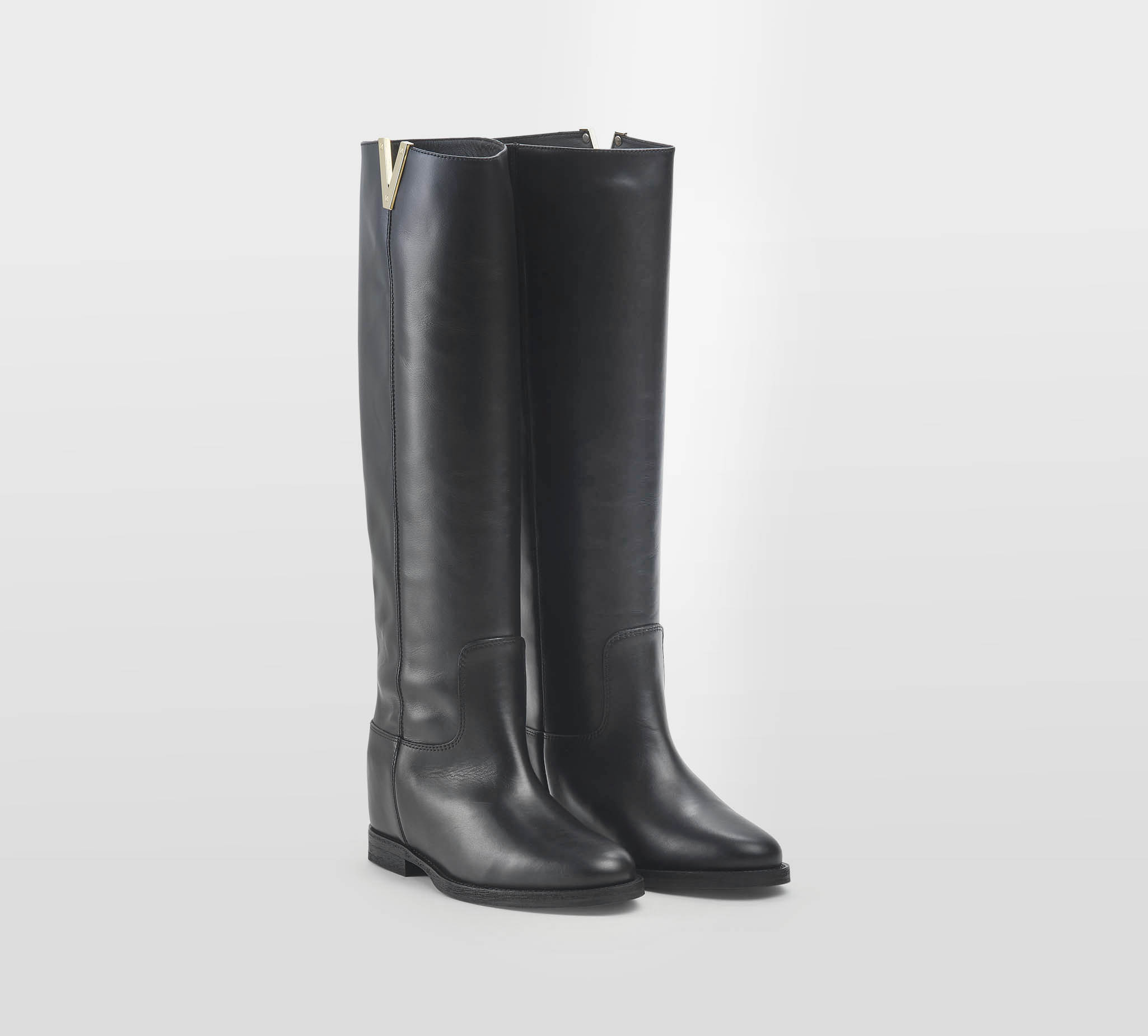 Stivale cavallerizzo pelle nero – V oro -zeppa interna cm 4,5 -gambale a tubo cm 42 -tacco cm 2 -fondo cuoio con mezza gomma -calzata regolare Made in Italy Dust bag inclusa. FW 25