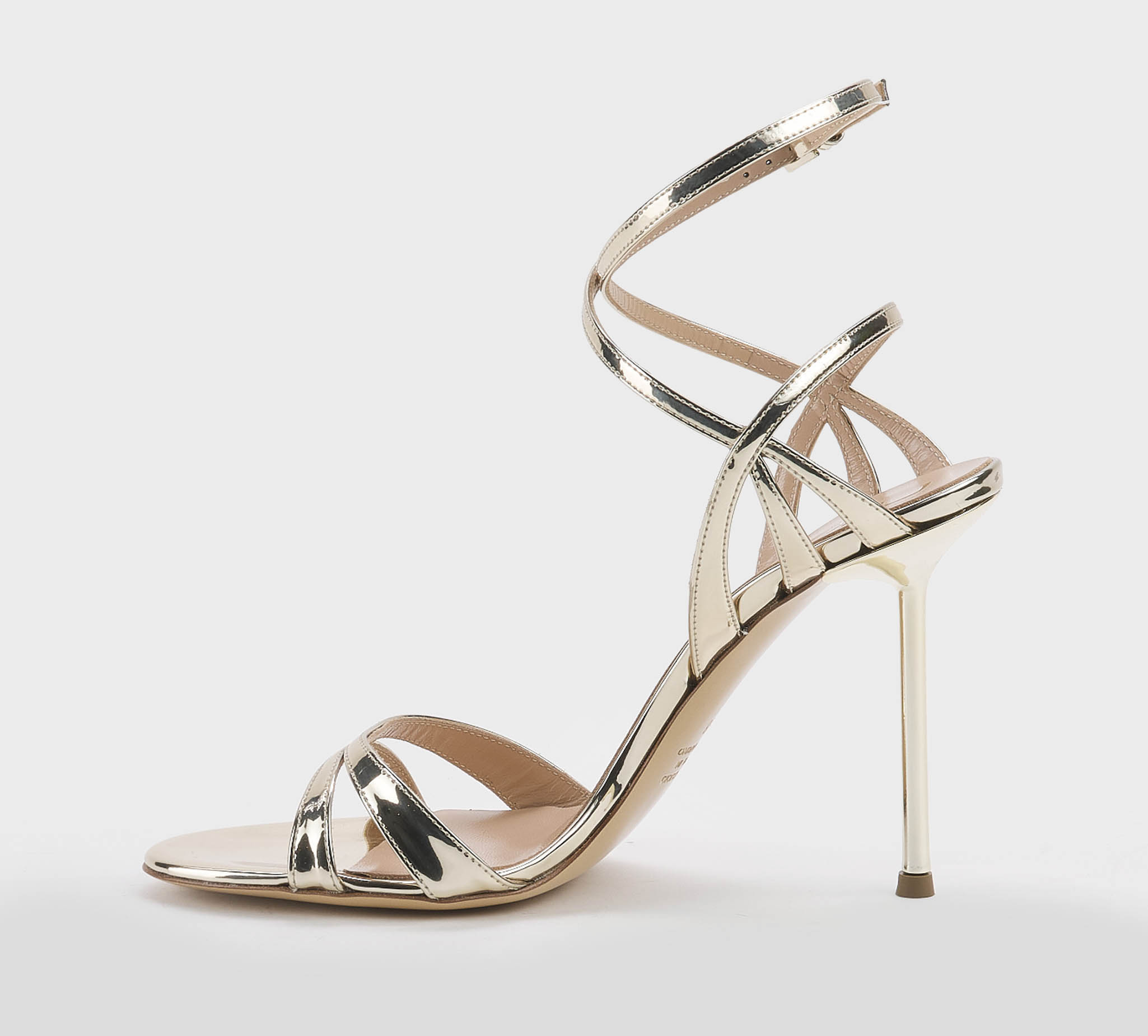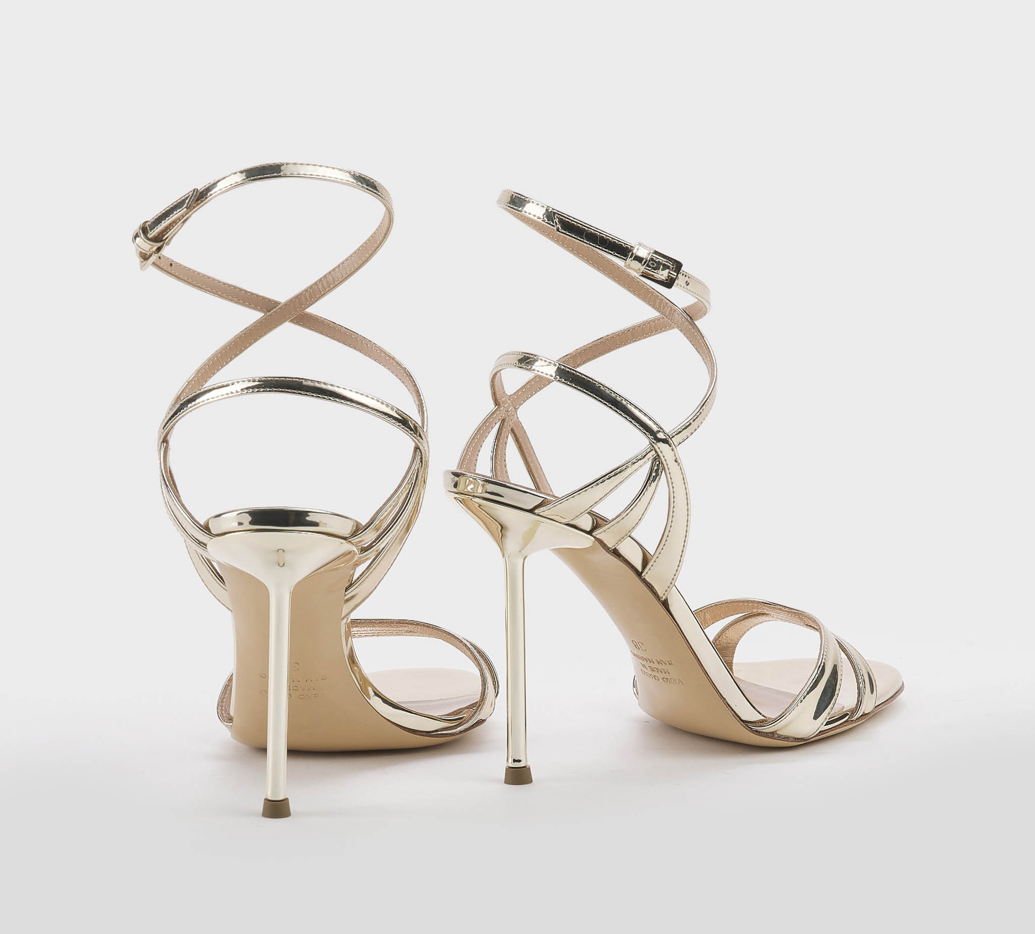 Sandalo in pelle specchiata oro -cinturino alla caviglia -fibbietta oro -tacco a spillo cm 12 -calzata regolare Fondo cuoio Dust bag inclusa Made in S.Marino ss26