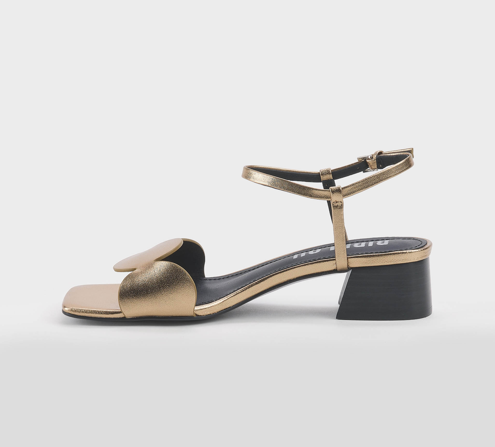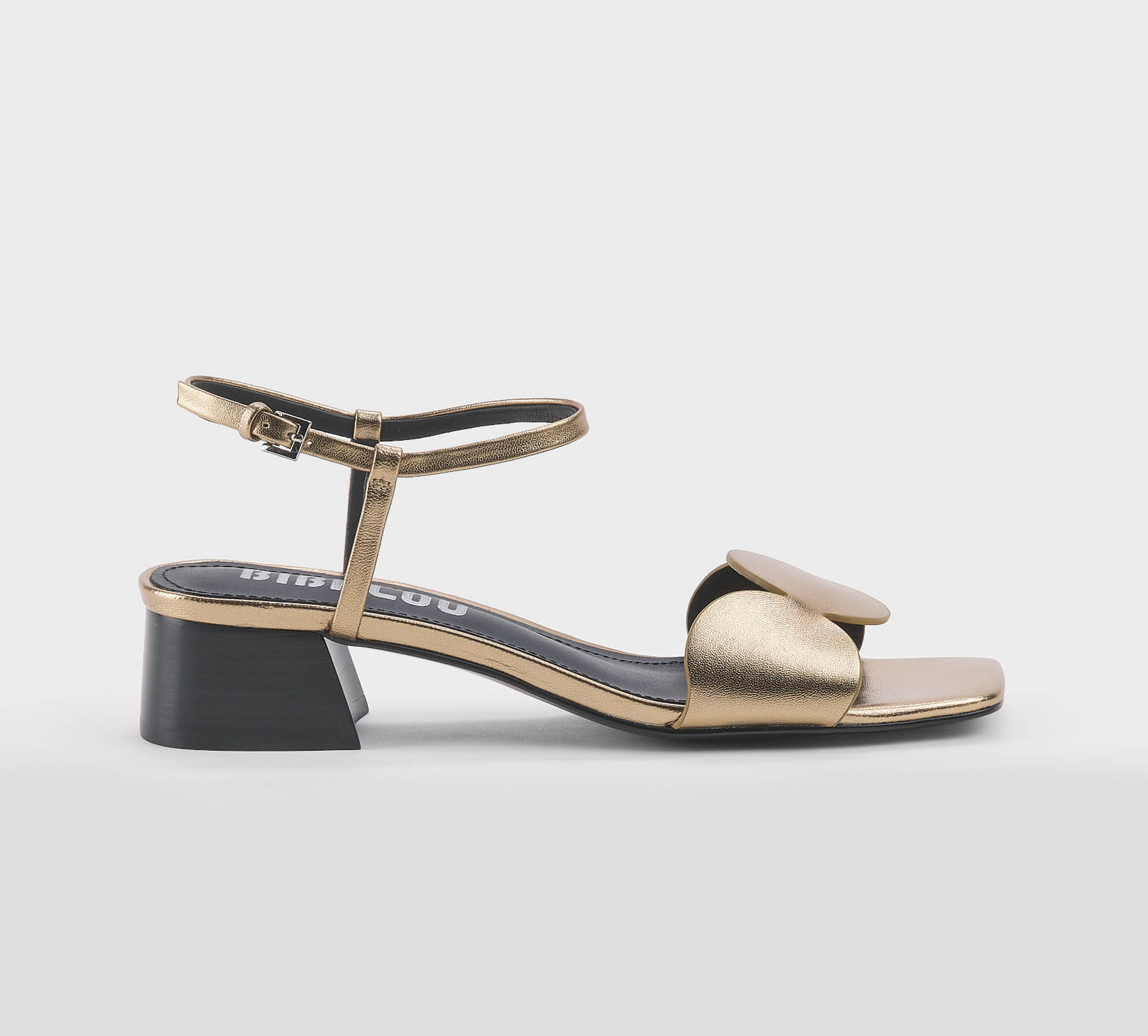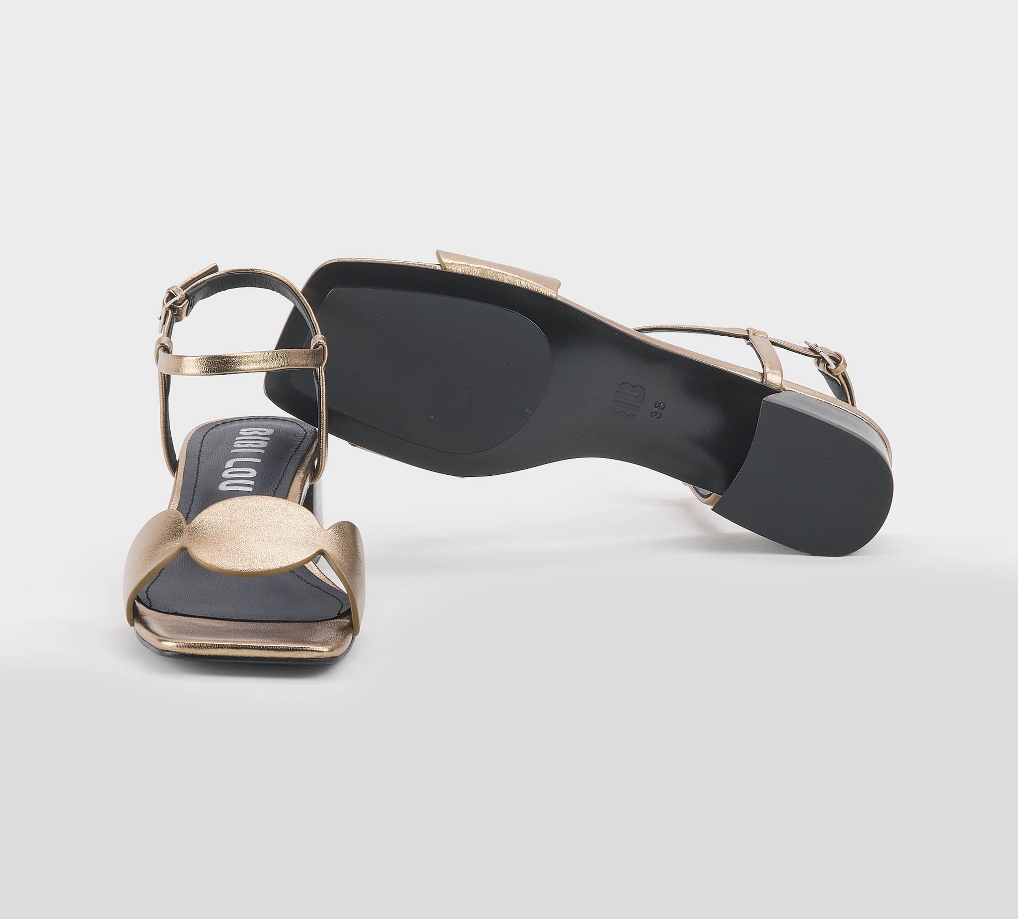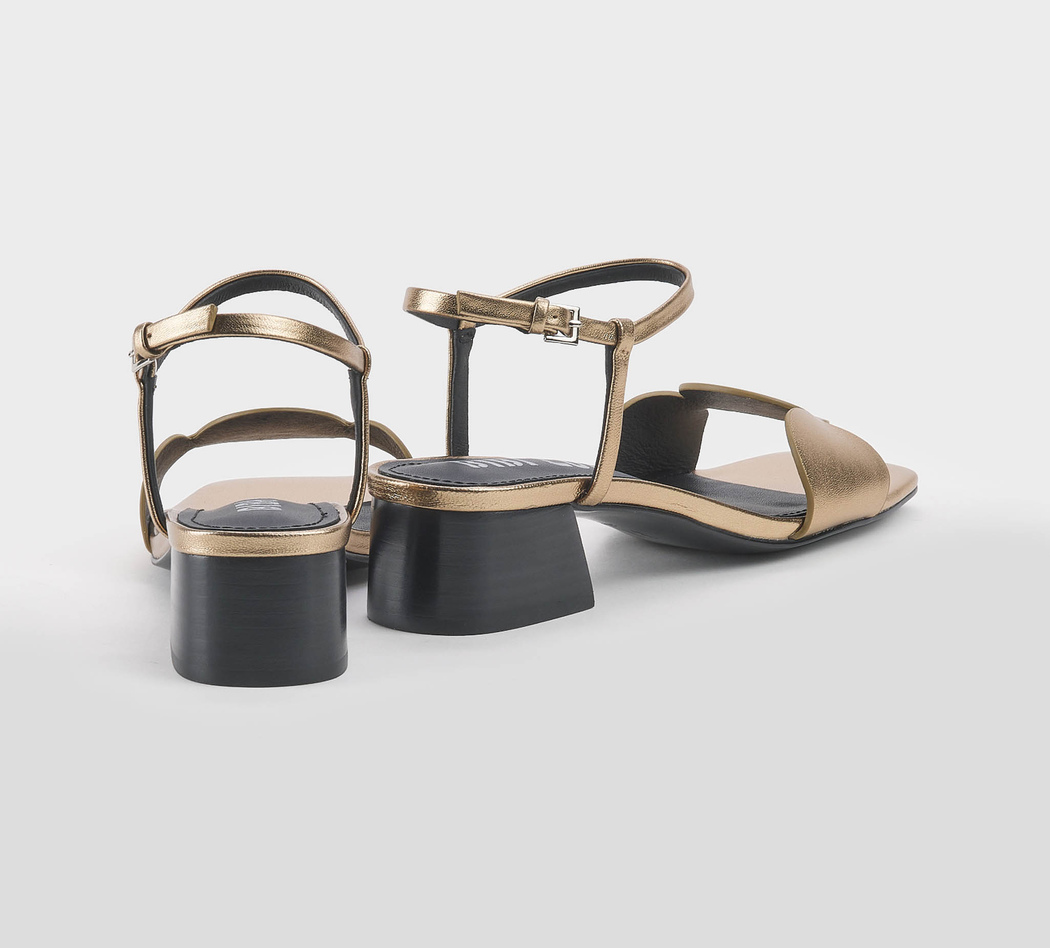 Sandalo in pelle bronzo -cinturino al tallone -fibbietta oro -fascia con cerchi -tacco cm 4 -calzata scarsa Fondo gomma Made in Spain SS 26