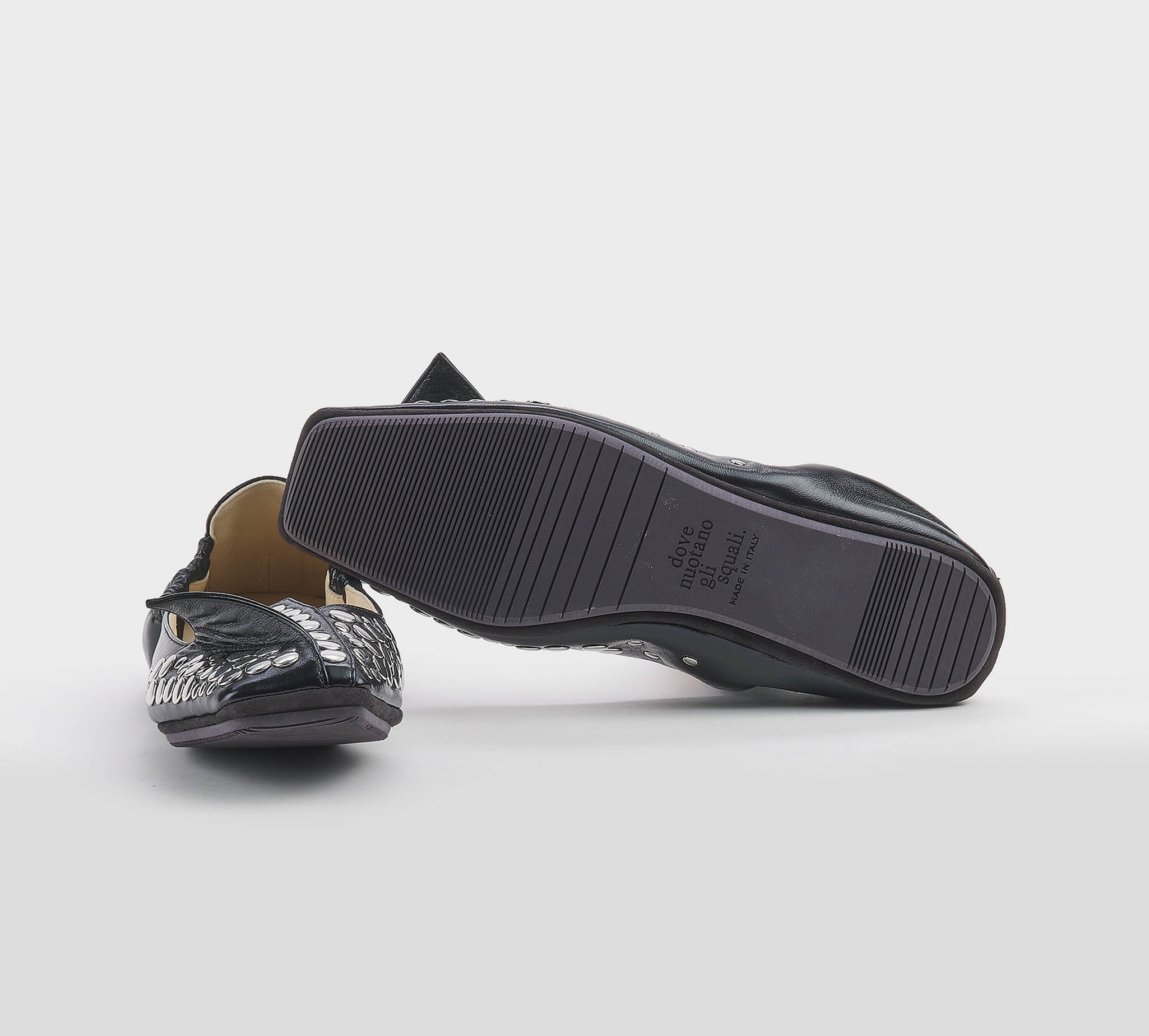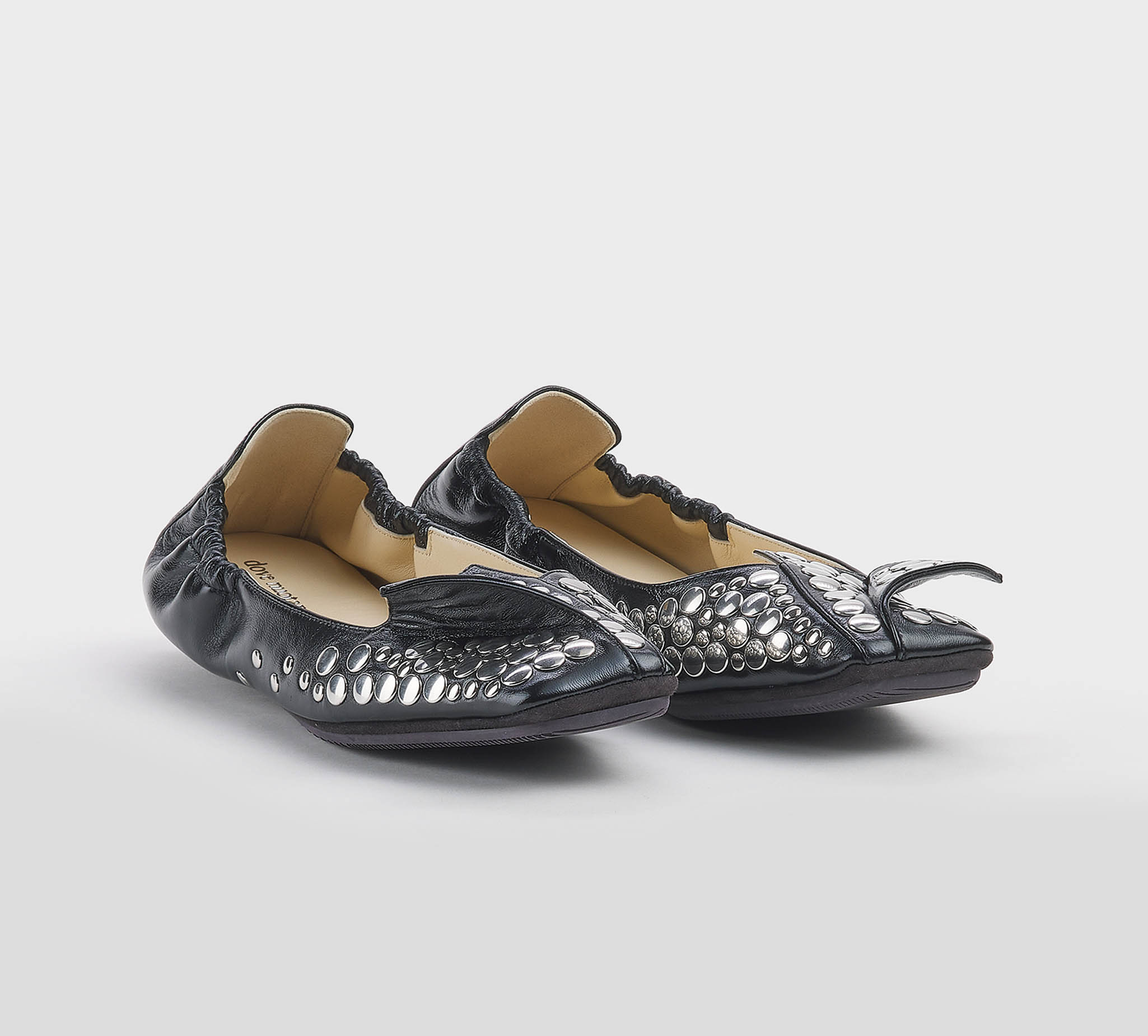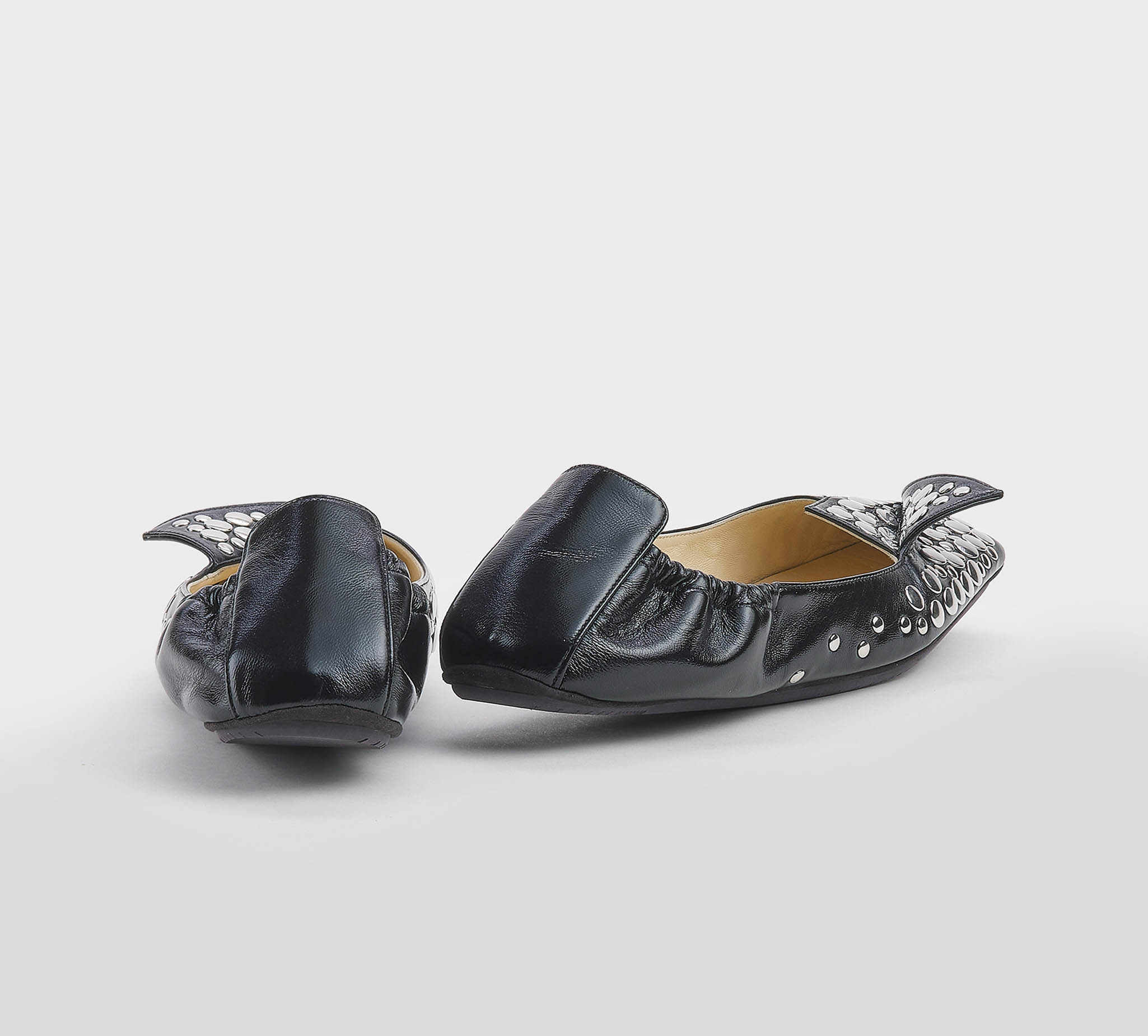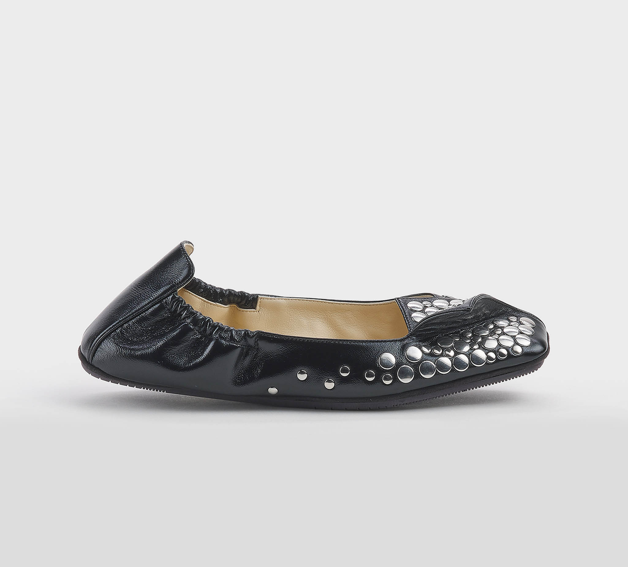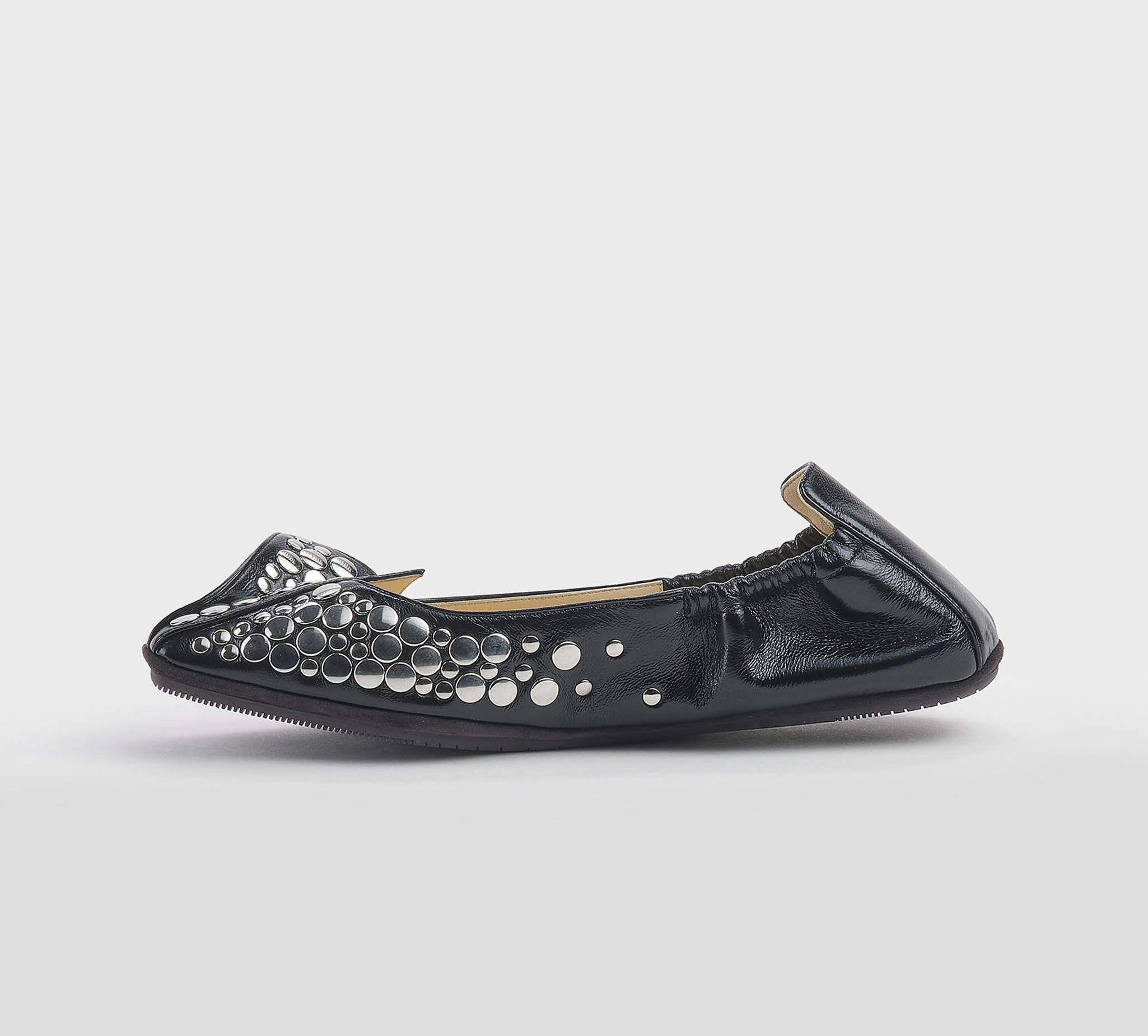 Ballerina in naplack nero -destrutturata con elastico -borchie argento -motivo a risvolto -plantare imbottito -calzata regolare Fondo gomma Made in Italy SS 26