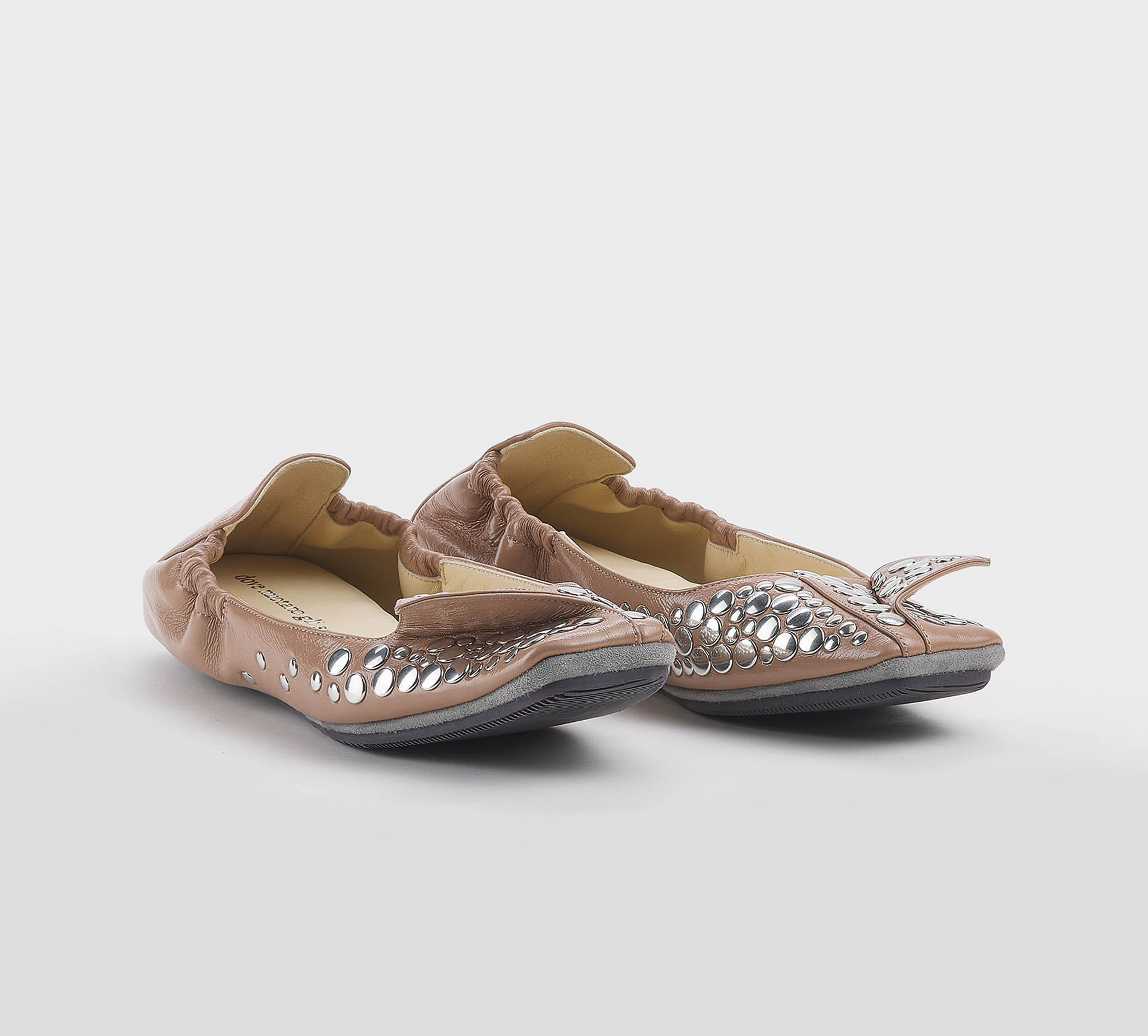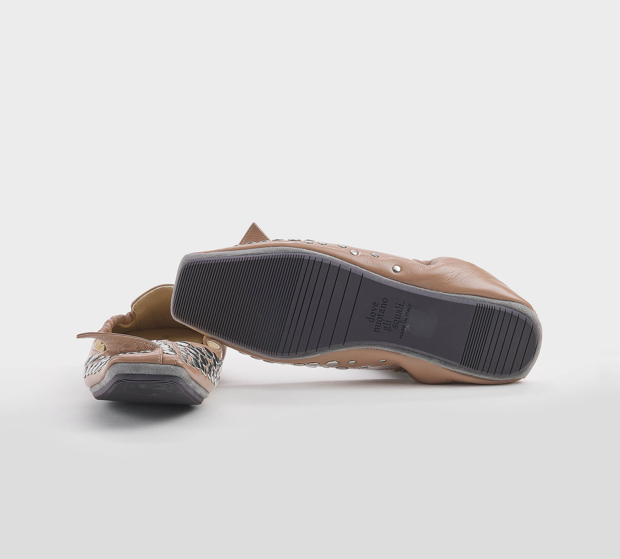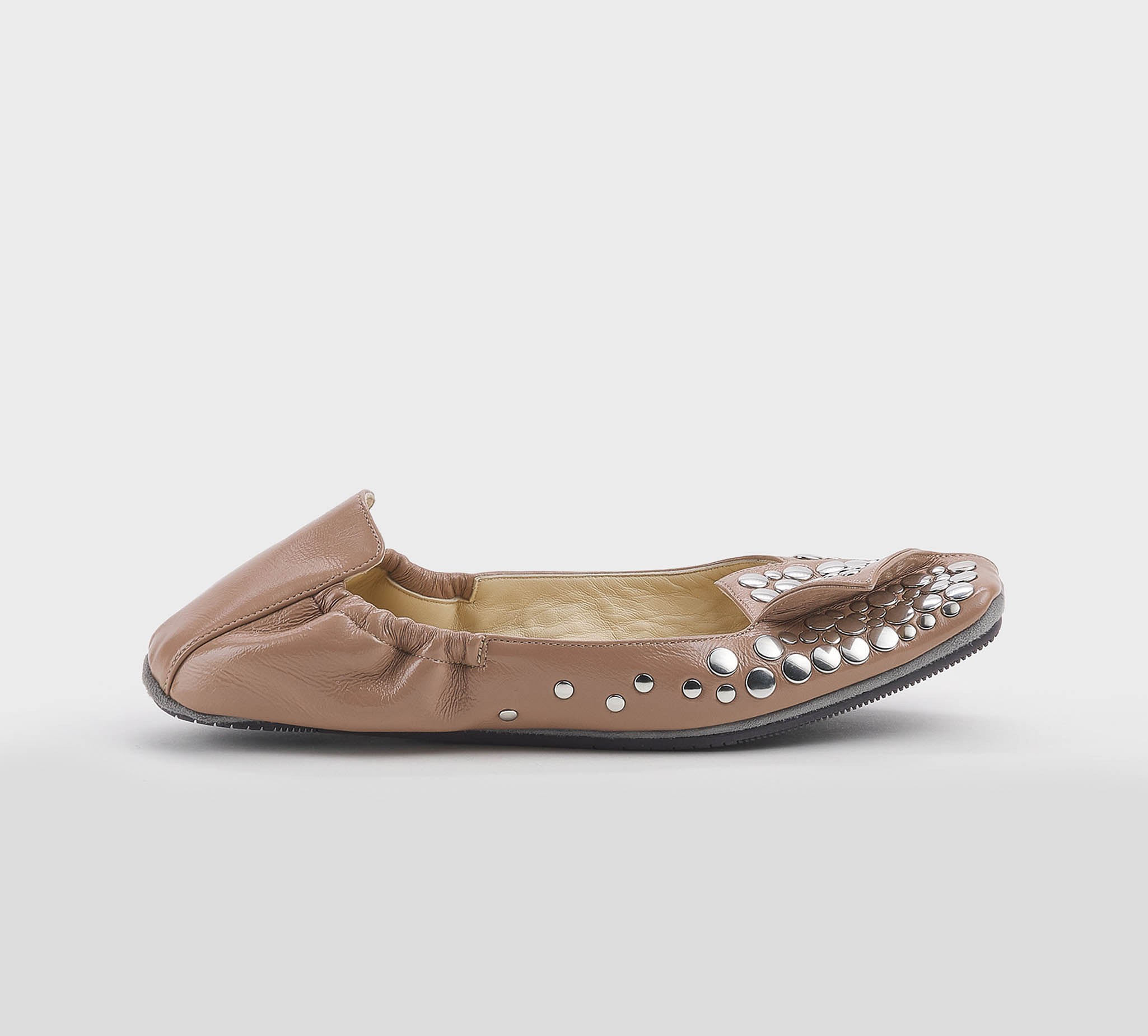 Ballerina in naplack carne -destrutturata con elastico -borchie argento -motivo a risvolto -plantare imbottito -calzata regolare Fondo gomma Made in Italy SS 26