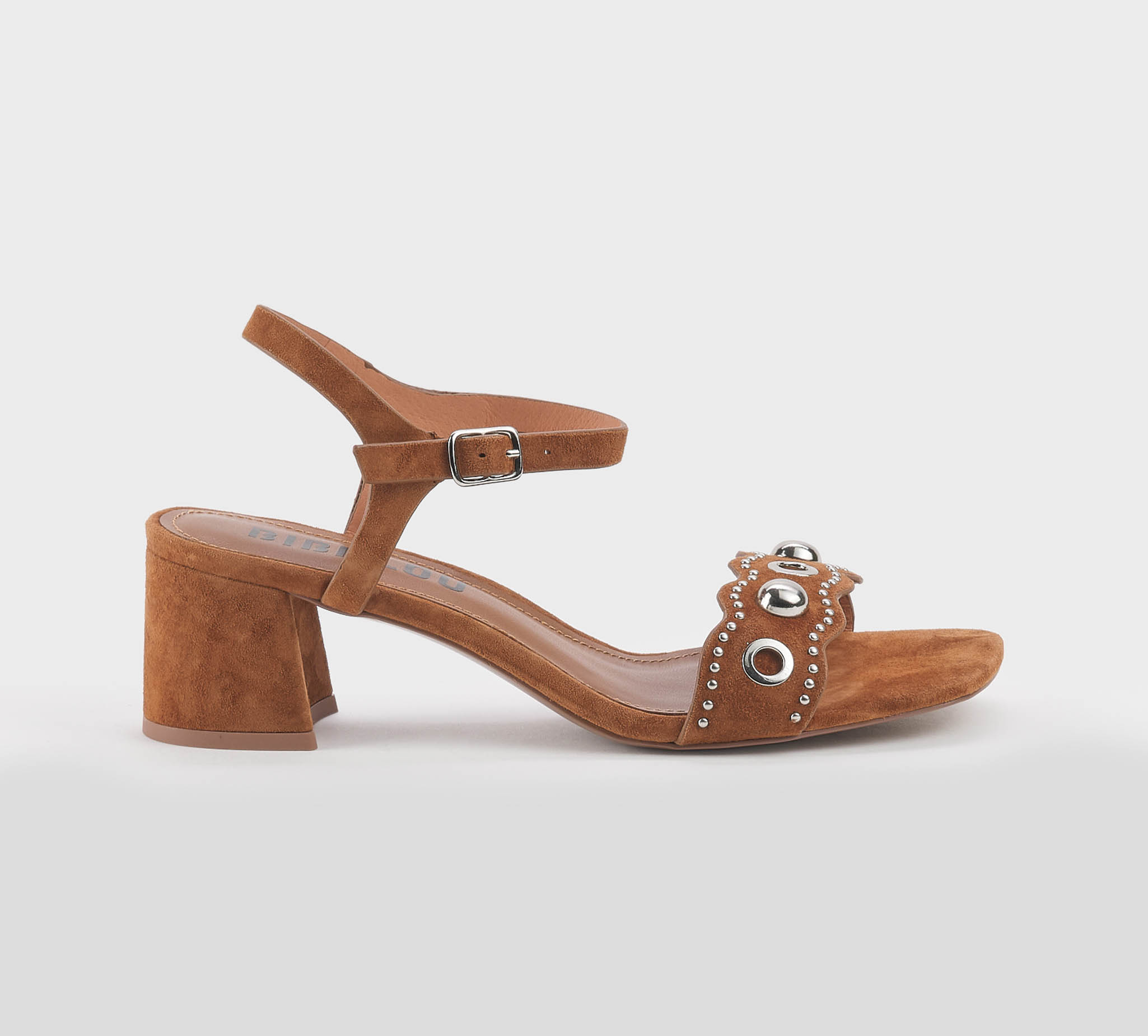 Sandalo in camoscio cuoio -borchie argento -cinturino al tallone -fibbietta argento -tacco cm 6 -calzata scarsa Fondo gomma Made in Spain SS 26