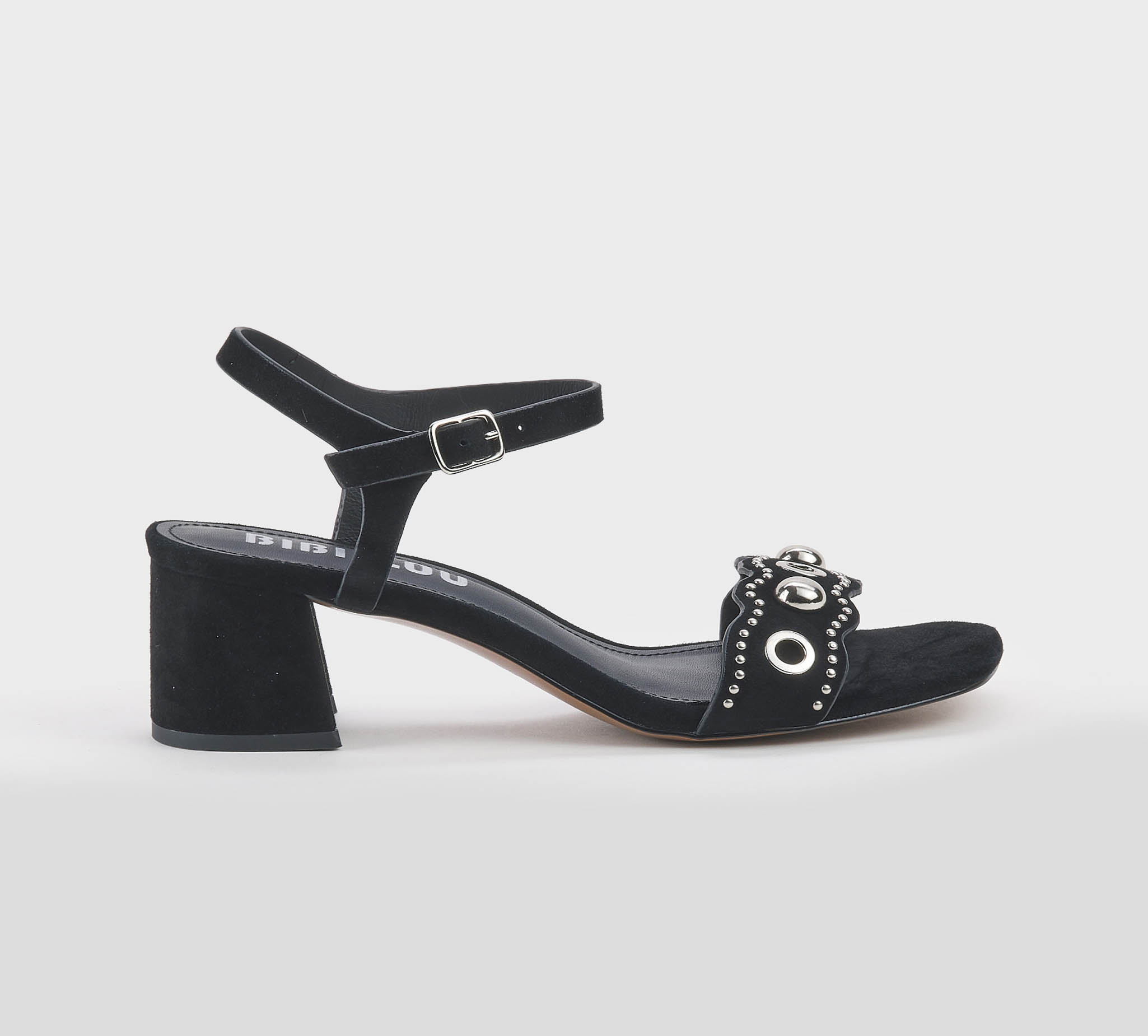 Sandalo in camoscio nero -borchie argento -cinturino al tallone -fibbietta argento -tacco cm 6 -calzata scarsa Fondo gomma Made in Spain SS 26