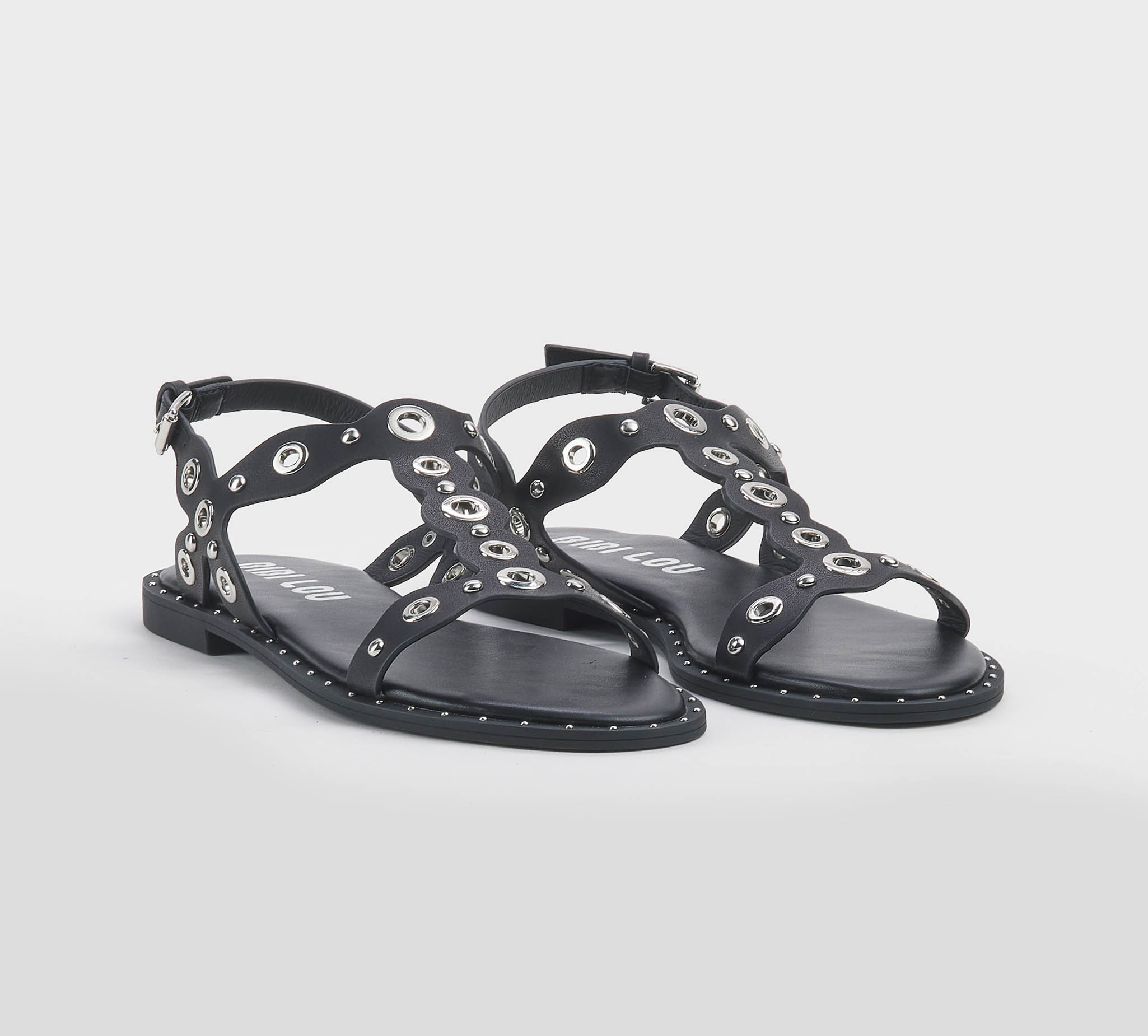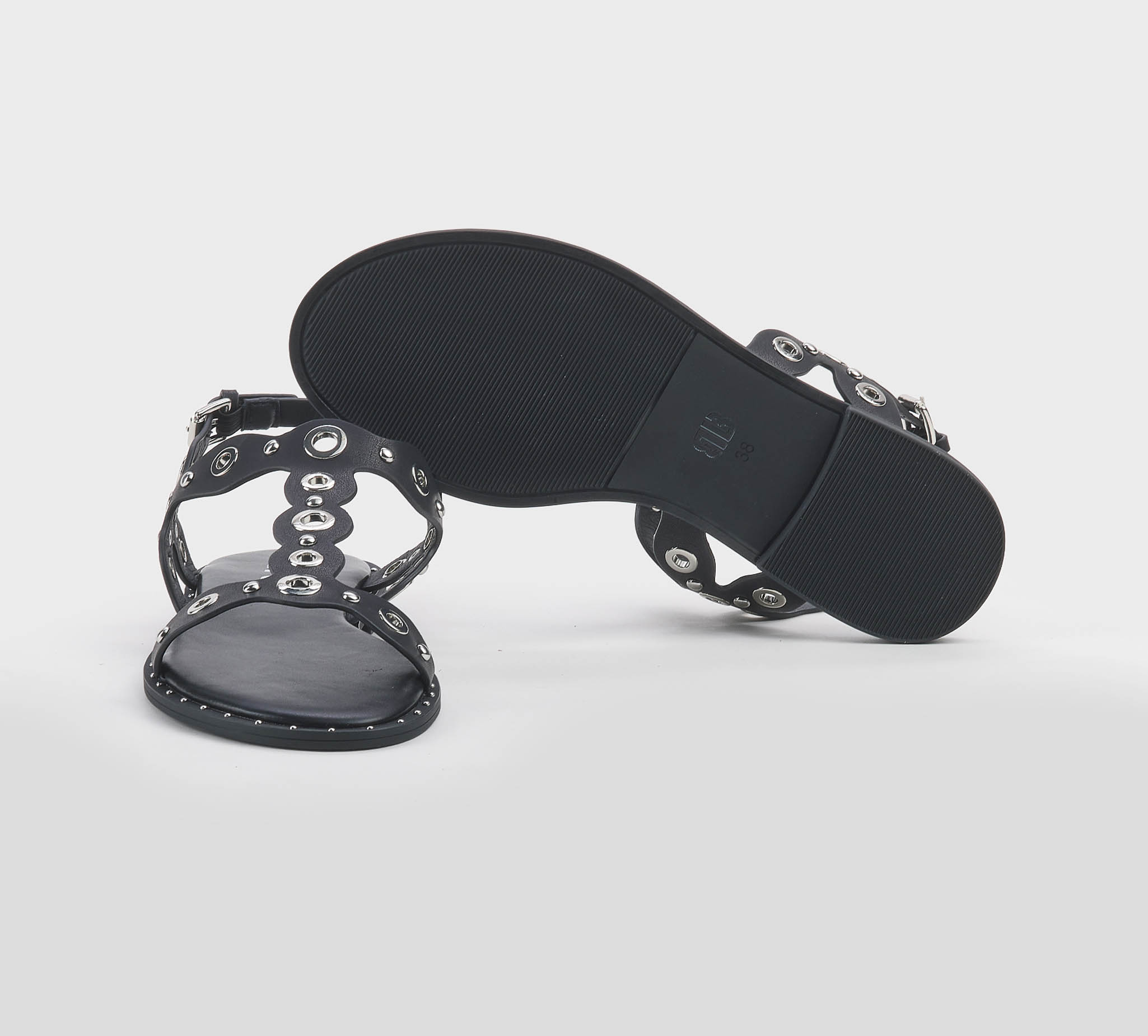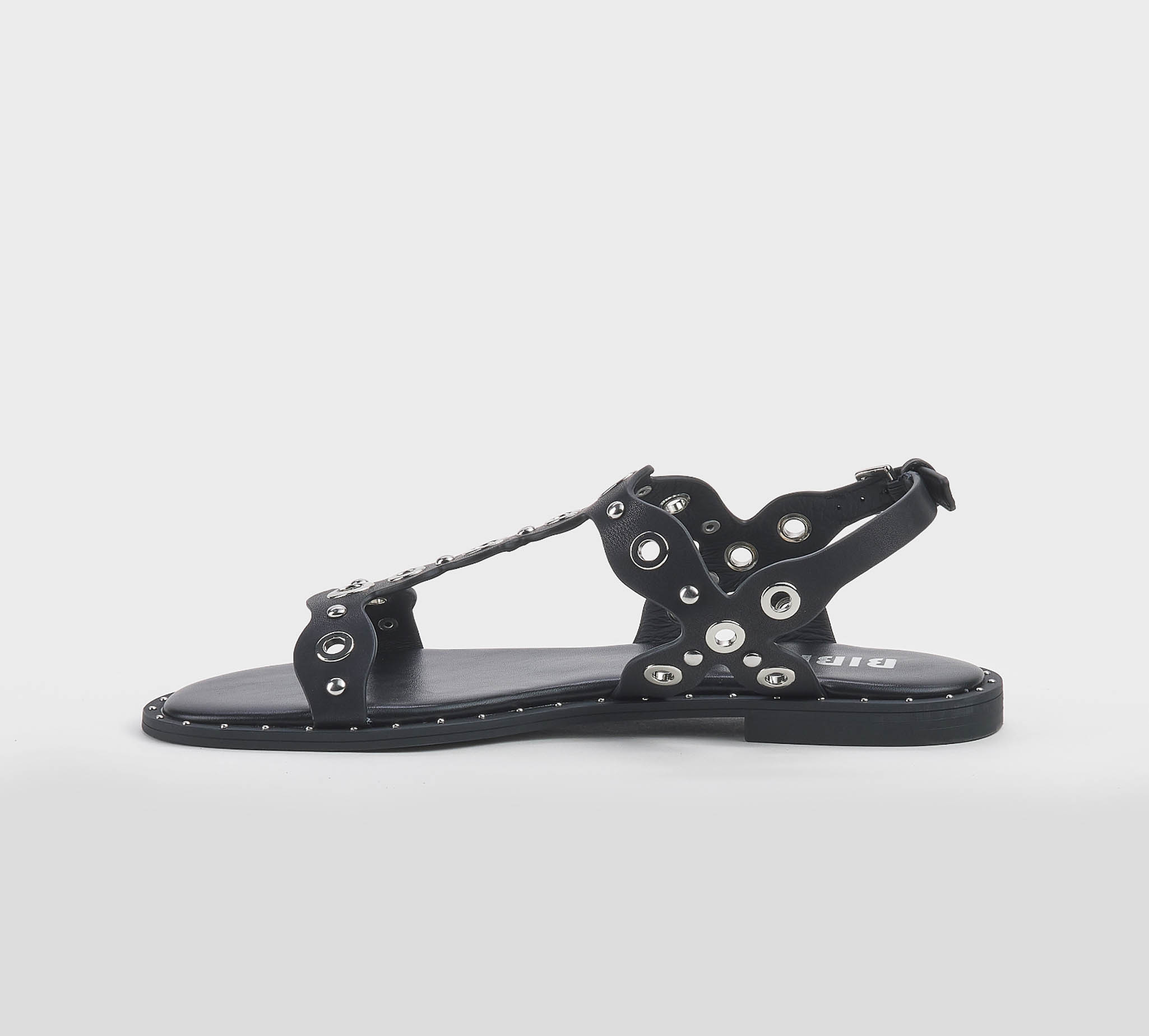 Sandalo in pelle nero -borchie oro -cinturino al tallone -fibbietta oro -tacco cm 1 -calzata scarsa Fondo gomma Made in Spain SS 26
