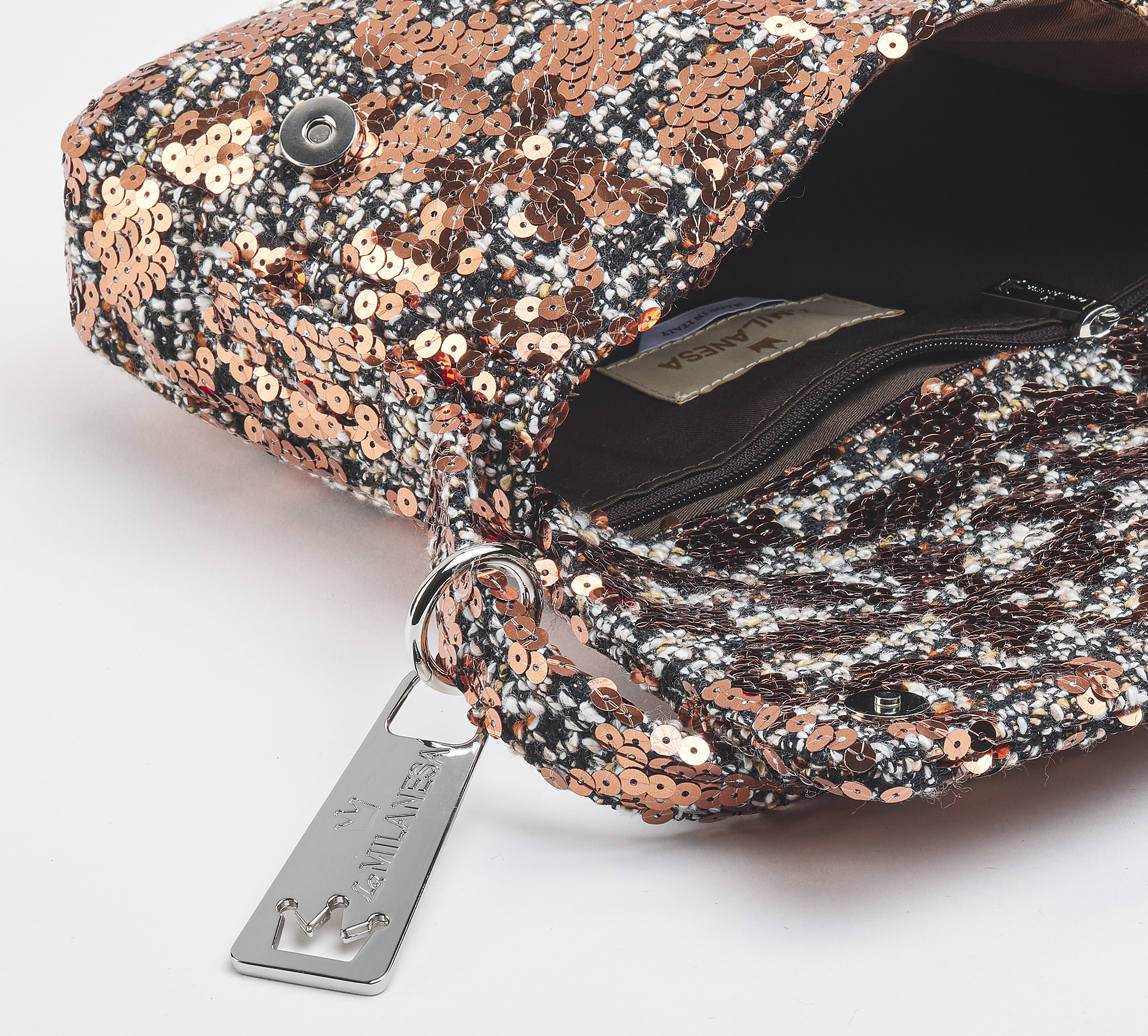 -tessuto ricoperto di paillettes -foderata in cotone con taschina -chiusura magnetica Dust bag inclusa Winner 2025