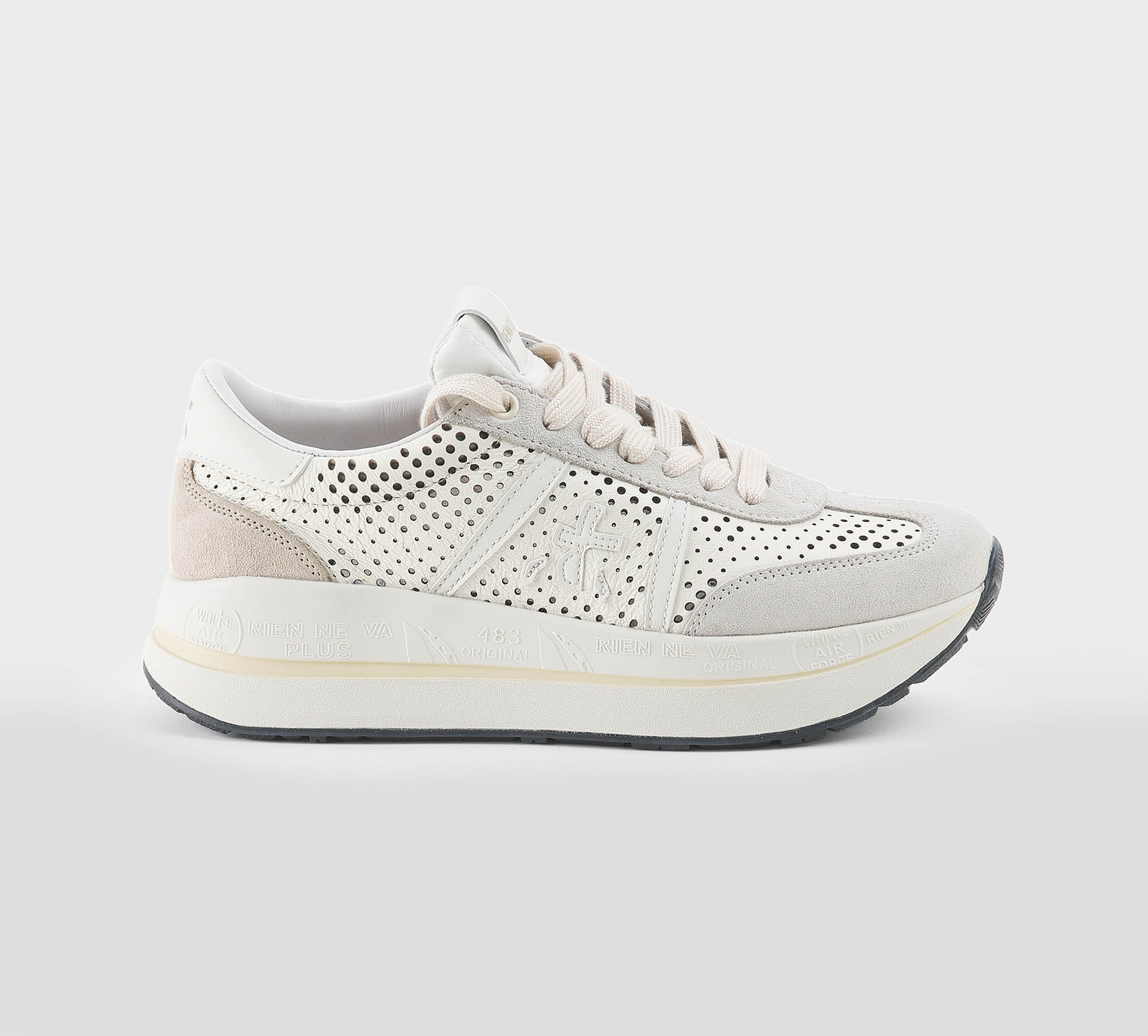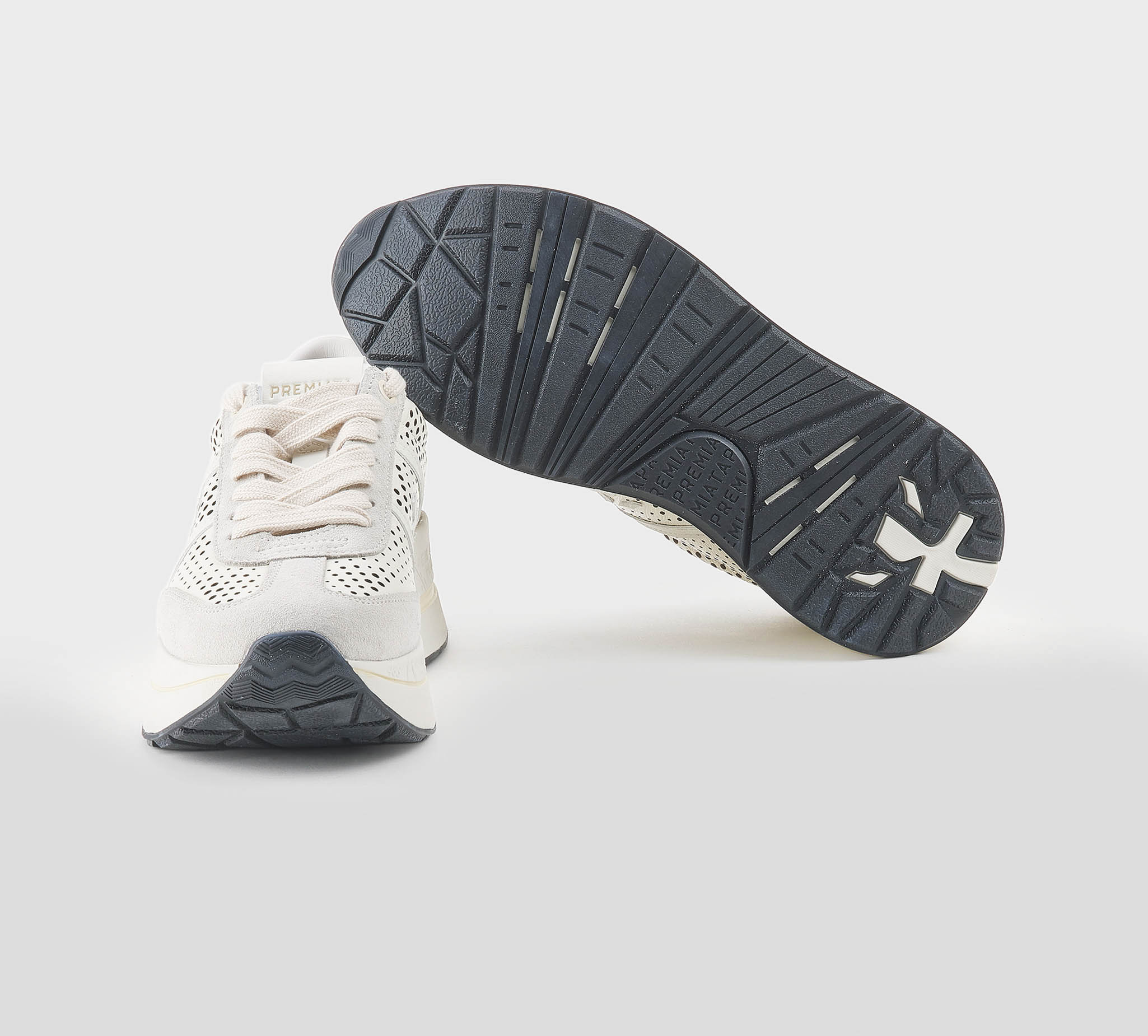 Sneakers Beth in camoscio tortora -inserti in pelle trafoarta bianco -logo pelle bianco -talloncino bianco -laccio panna -plantare anatomico -calzata regolare Fondo gomma Made in Vietnam SS 26