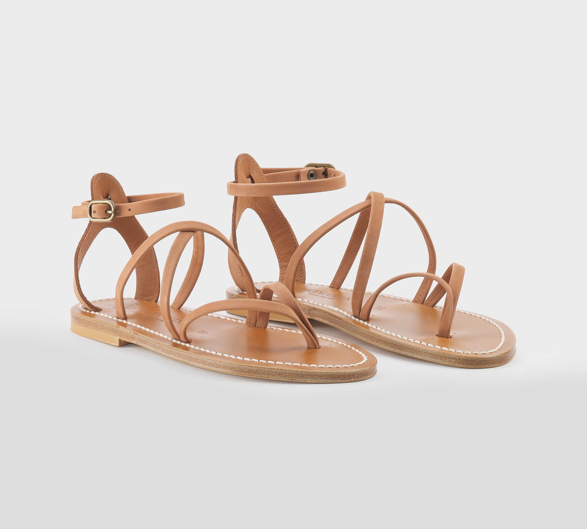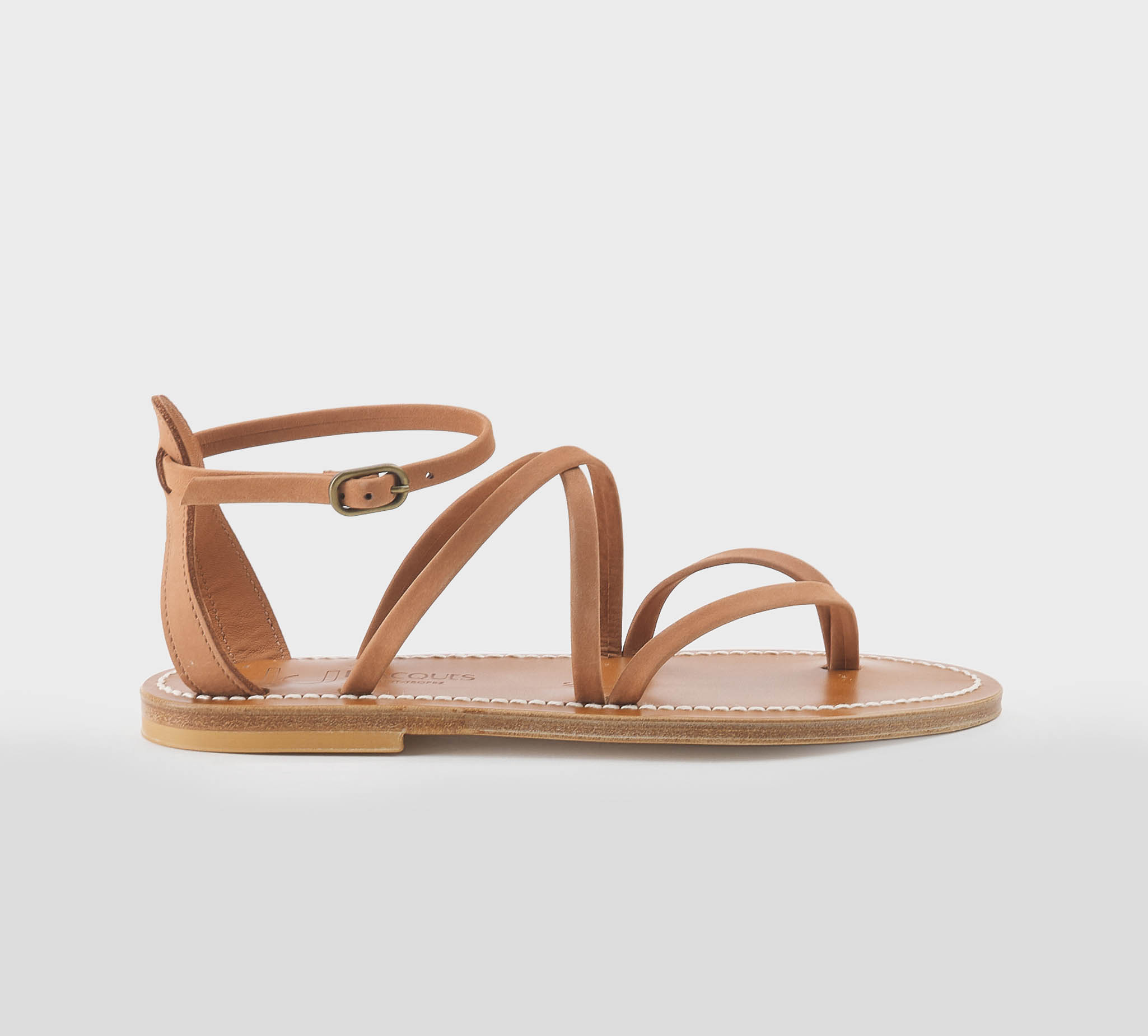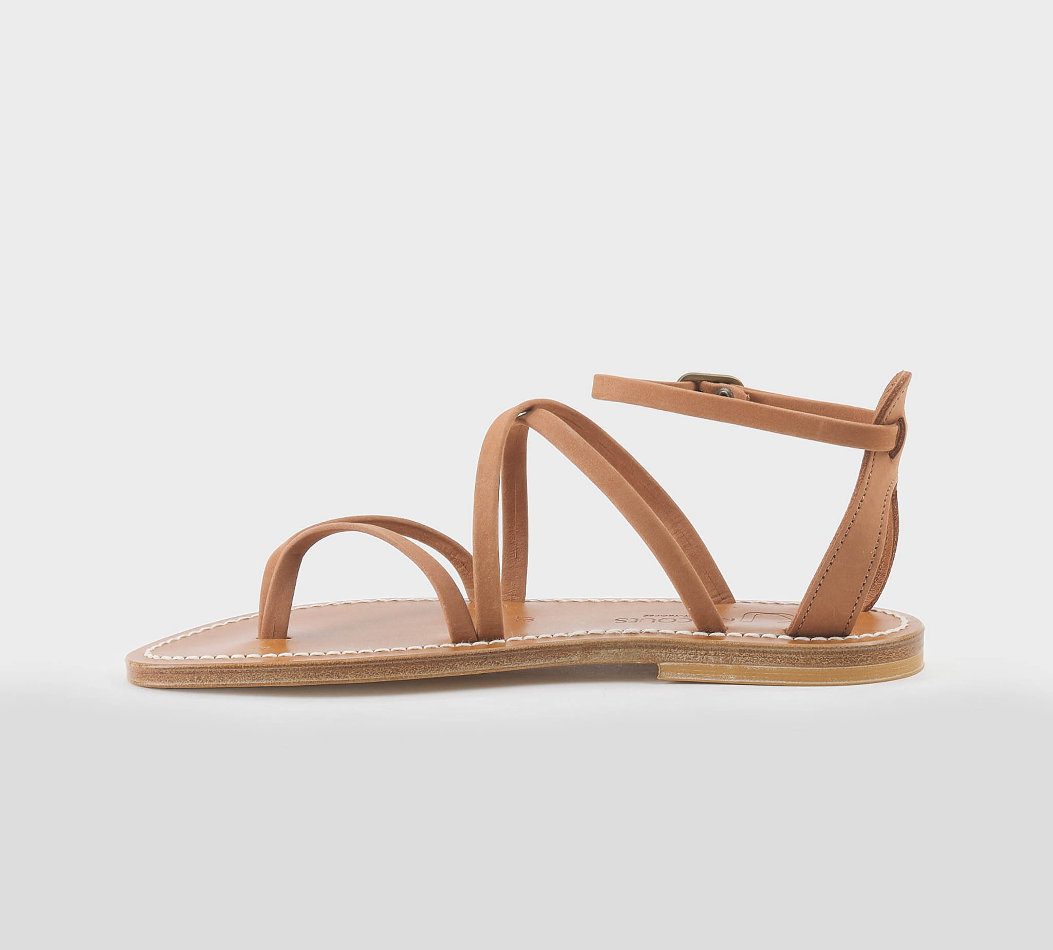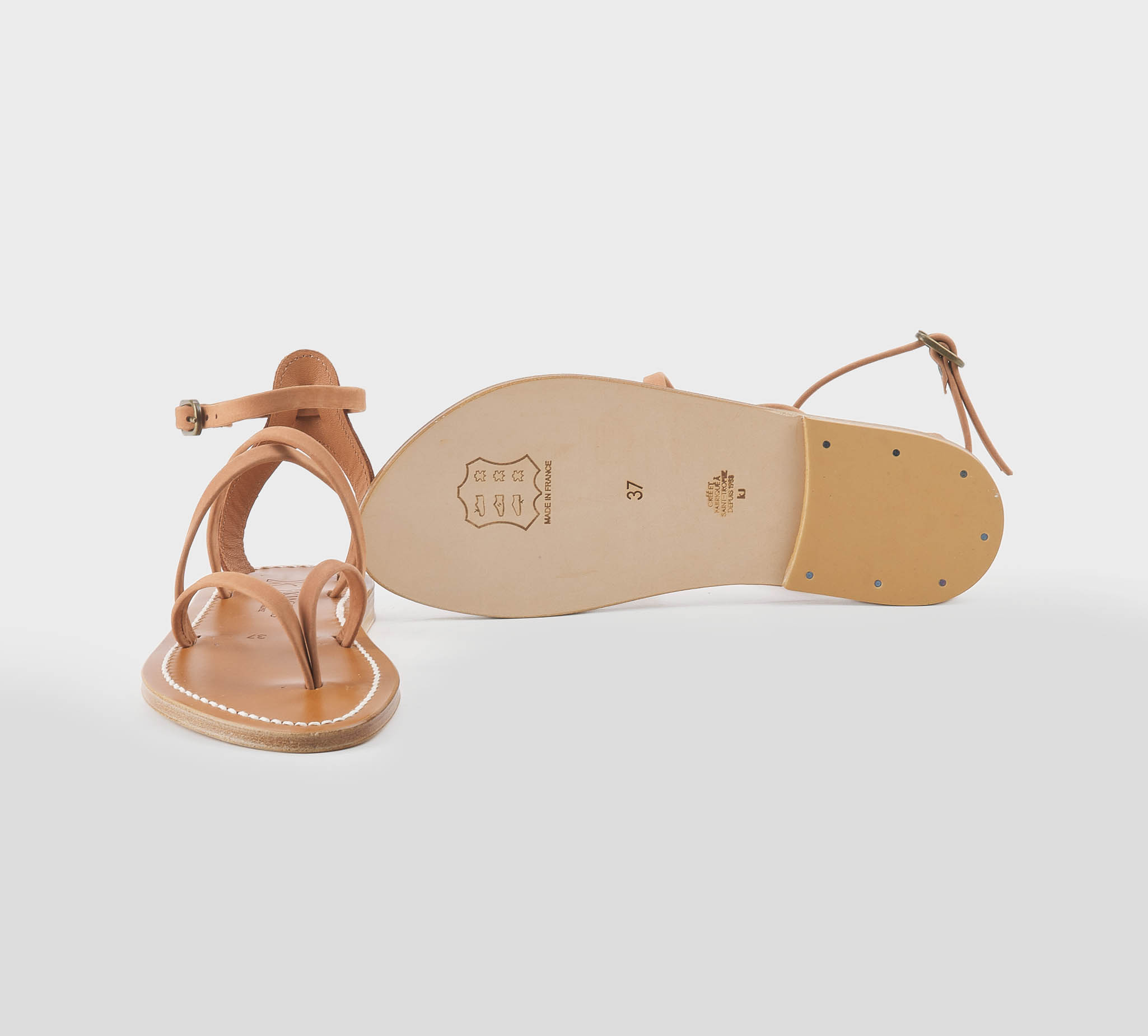 Sandalo infradito pelle cuoio -tallone semi chiuso -cinturino alla caviglia -fibbietta oro antico -tacco cm 1,5 -calzata regolare Fondo cuoio Made in S.Tropez SS 26