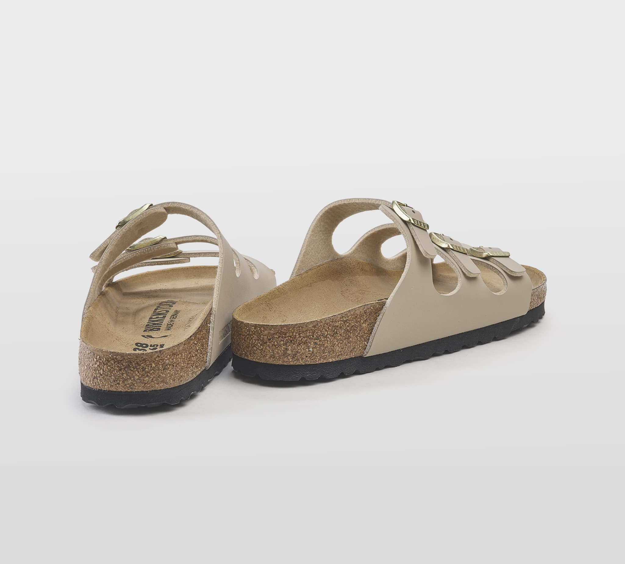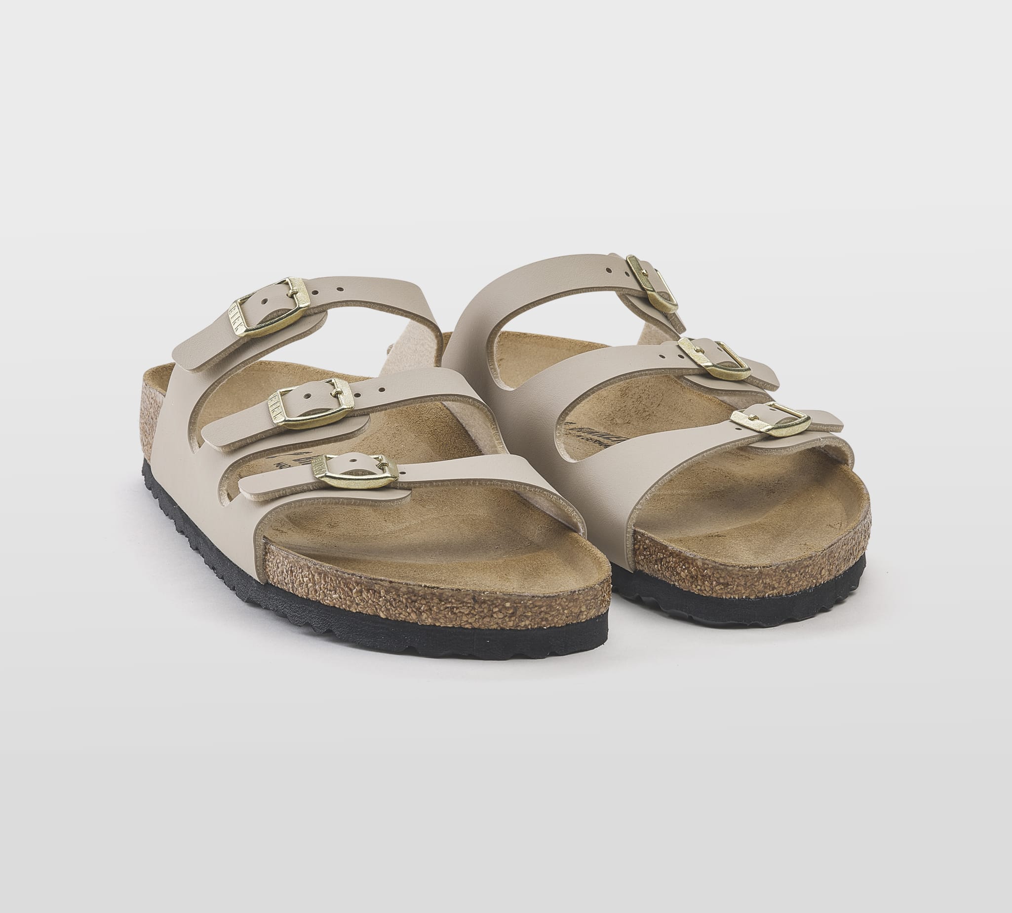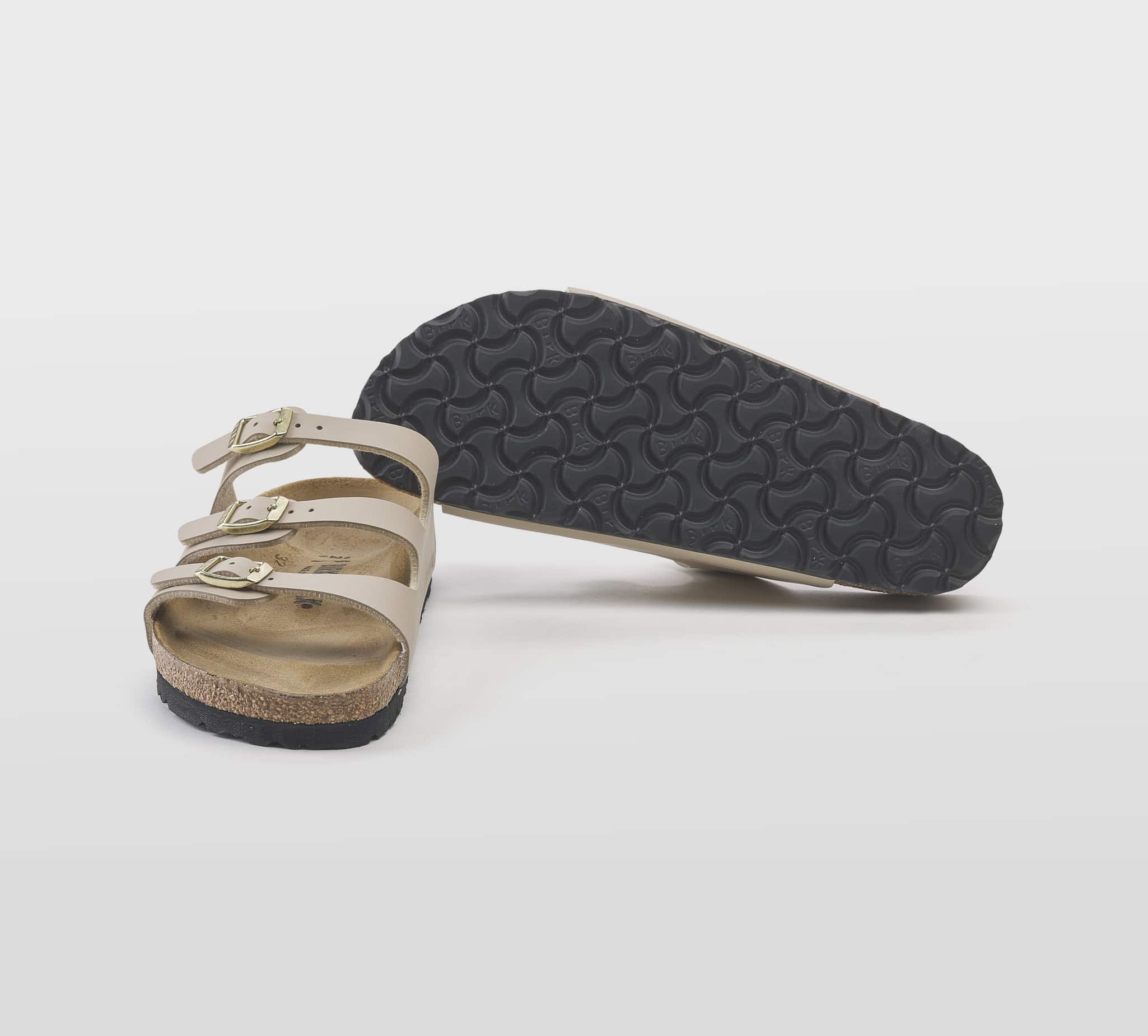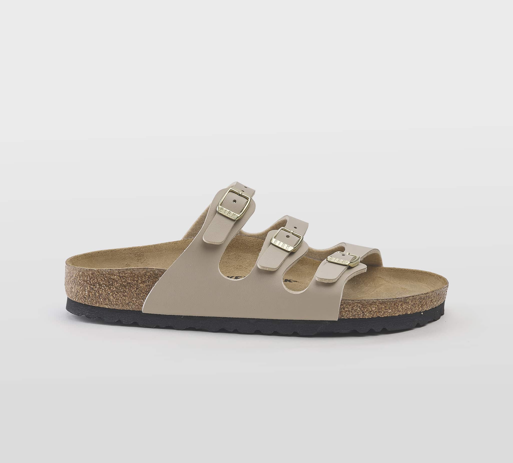Ciabatta Florida in birkoflor sabbia -triplo cinturino -fibbiette oro -plantare anatomico -calzata regolare Fondo gomma nero Made in Germany SS 25
