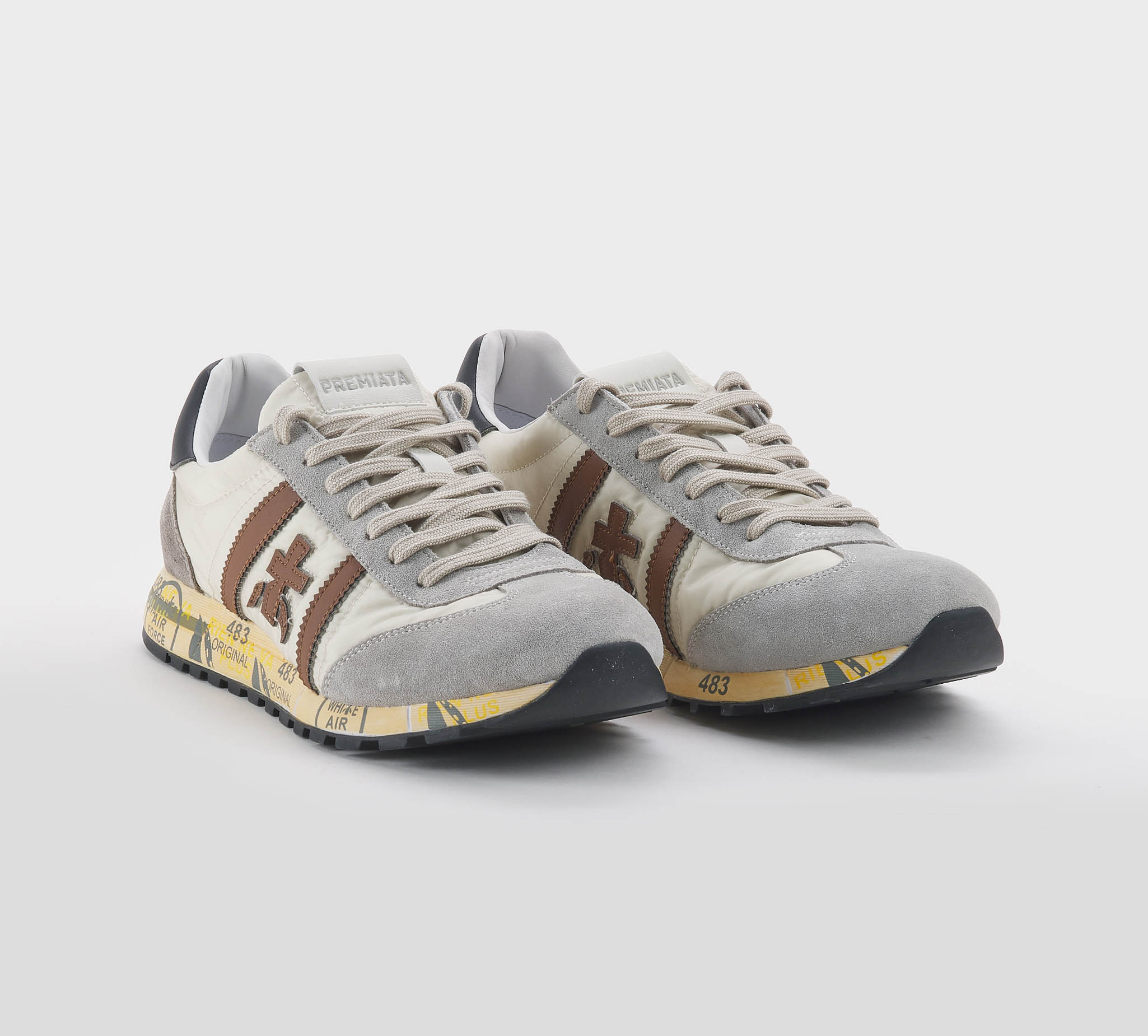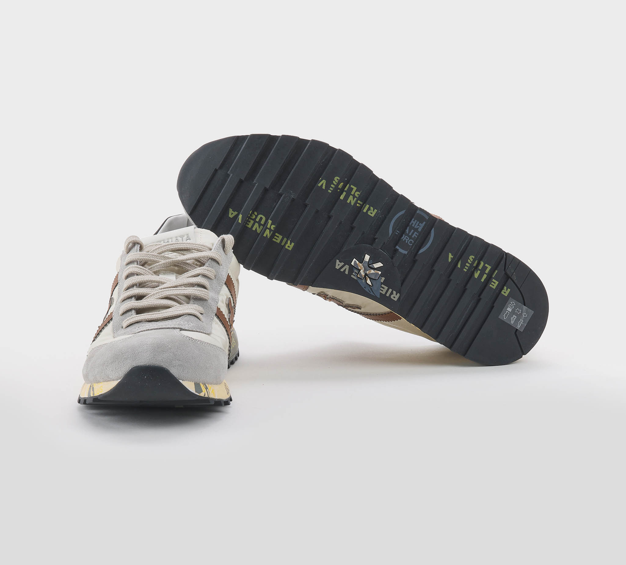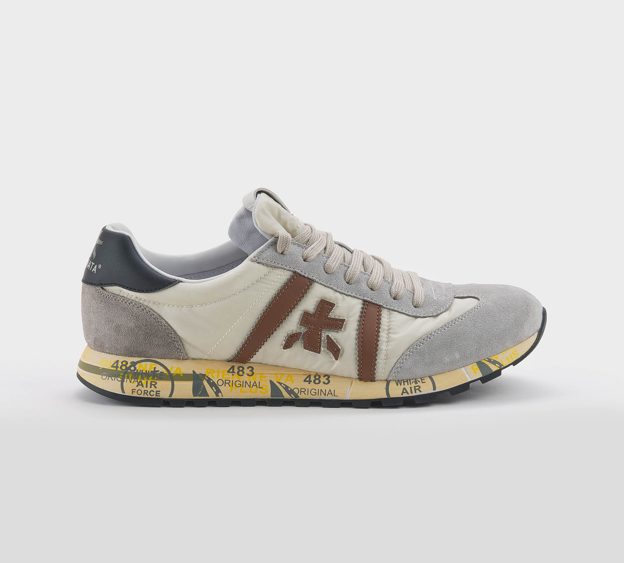 Sneakers Lucy in camoscio sabbia -inserti tessuto tecnico panna -logo pelle cuoio -talloncino pelle nero -laccio corda -plantare anatomico -calzata regolare Fondo gomma Made in Vietnam SS 26