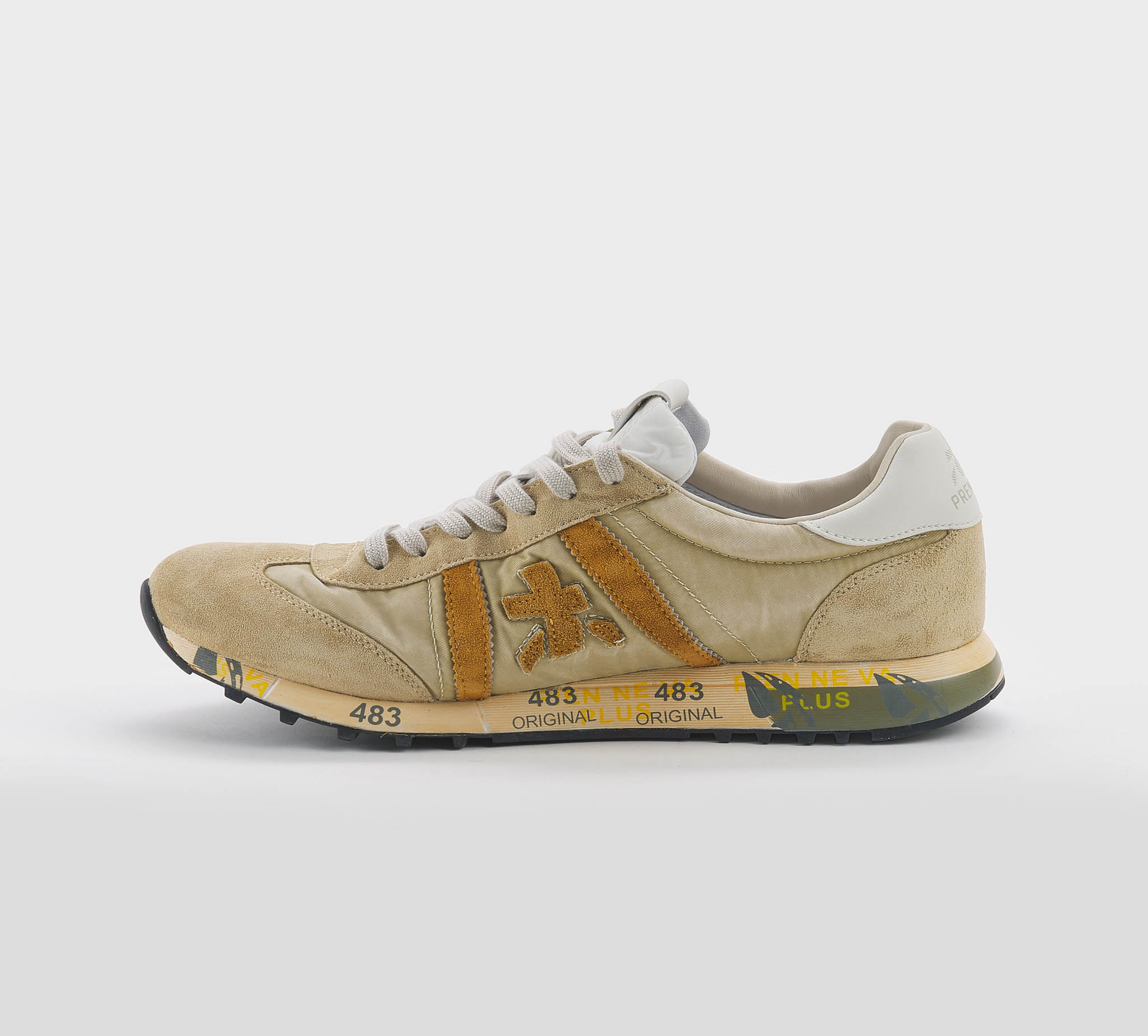 Sneakers Lucy in camoscio senape -inserti tessuto tecnico beige -logo camoscio cuoio -talloncino pelle bianco -laccio corda -plantare anatomico -calzata regolare Fondo gomma Made in Vietnam SS 26