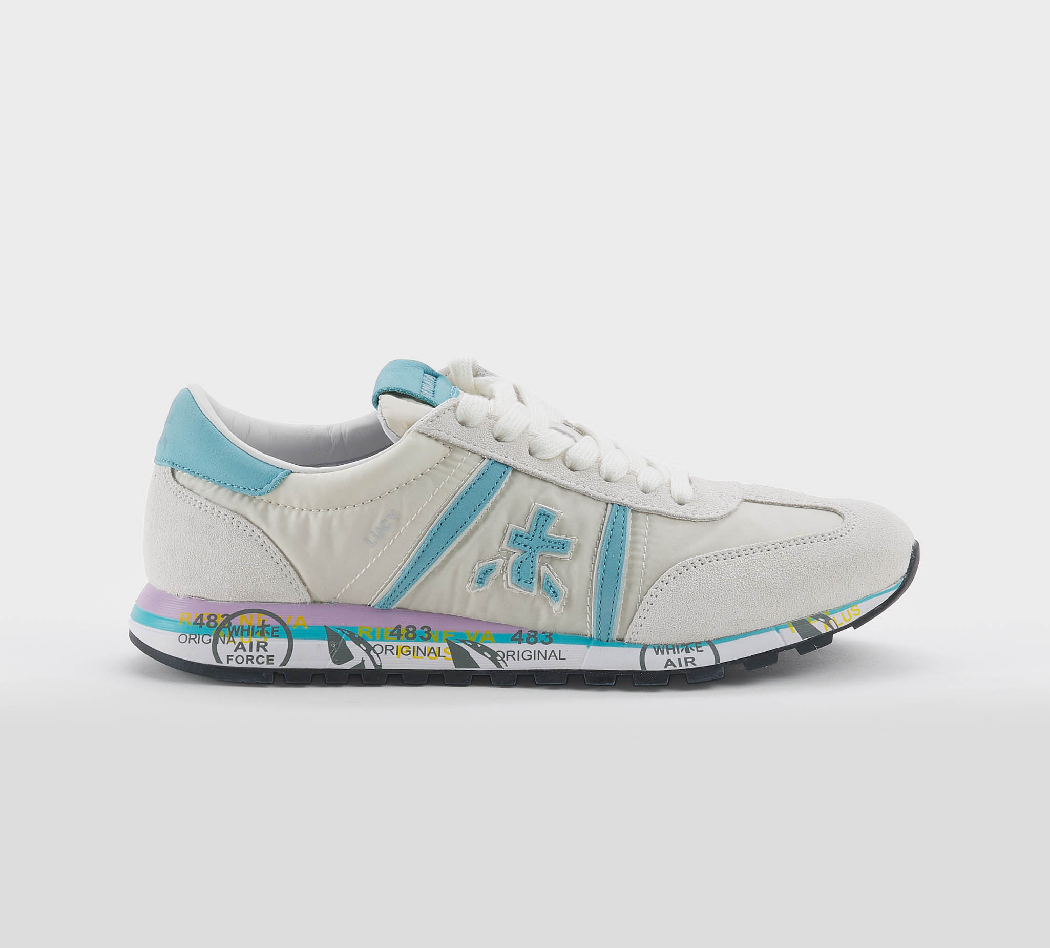 Sneakers LucyD in camoscio ghiaccio -inserti tessuto tecnico panna -logo pelle celeste -talloncino pelle celeste -laccio bianco -plantare anatomico -calzata regolare Fondo gomma Made in Vietnam SS 26