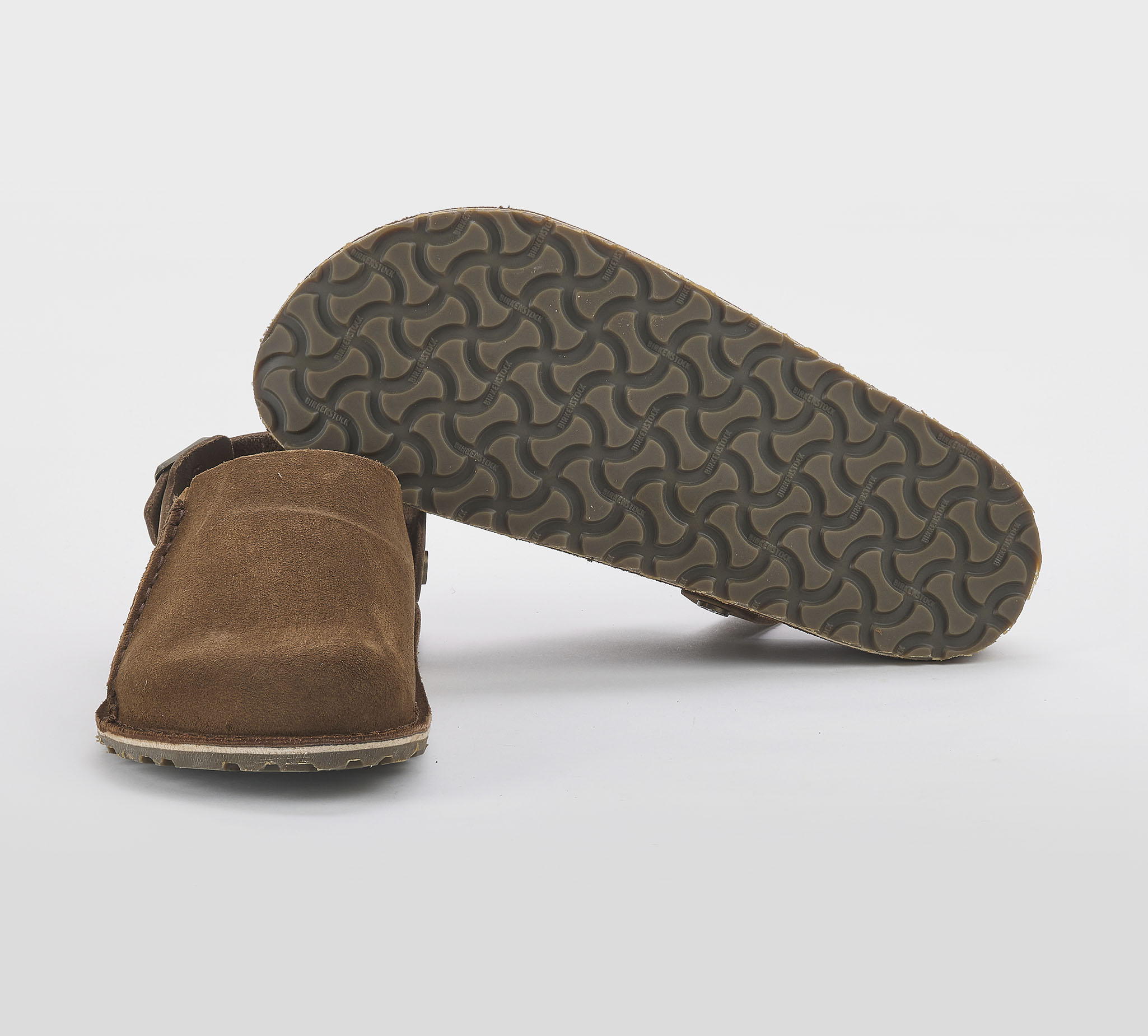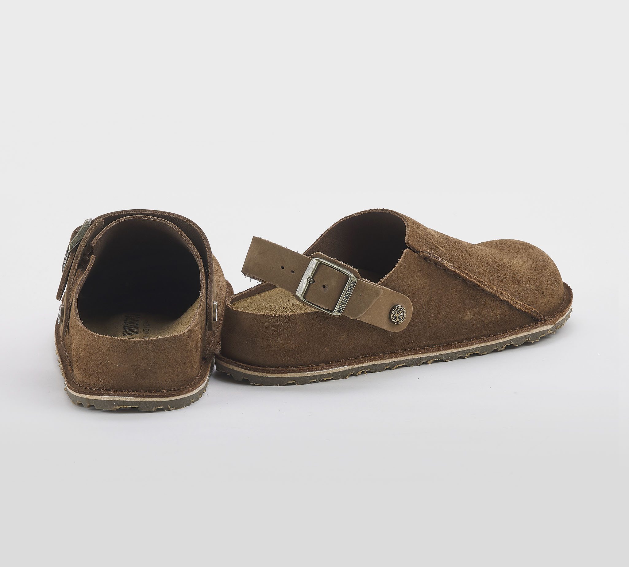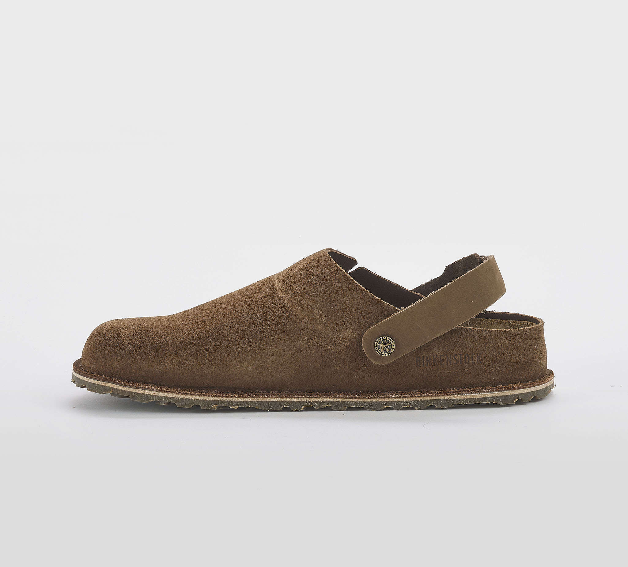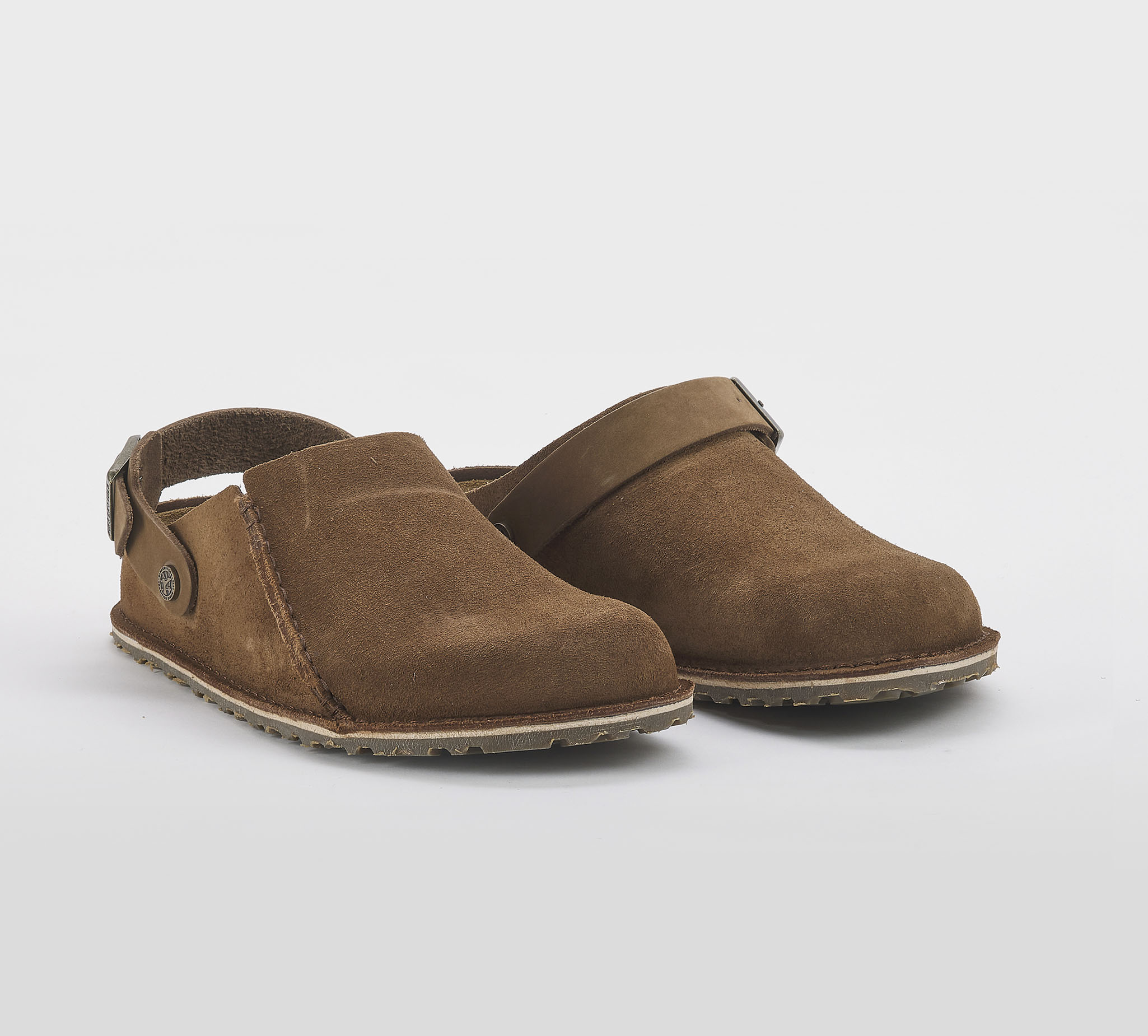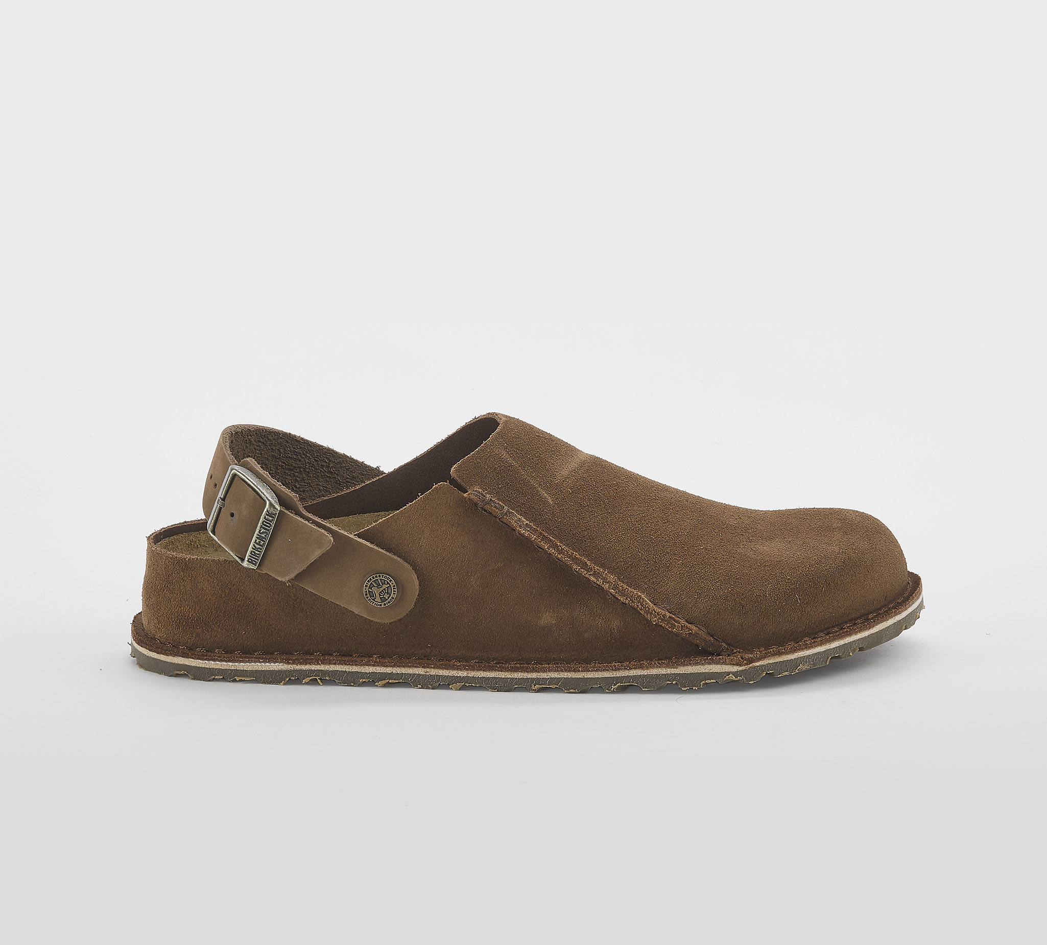 Sabot Lutry in suede dark tea -cuciture a vista -cinturino regolabile -fibbia peltro -plantare anatomico -calzata regolare Fondo gomma