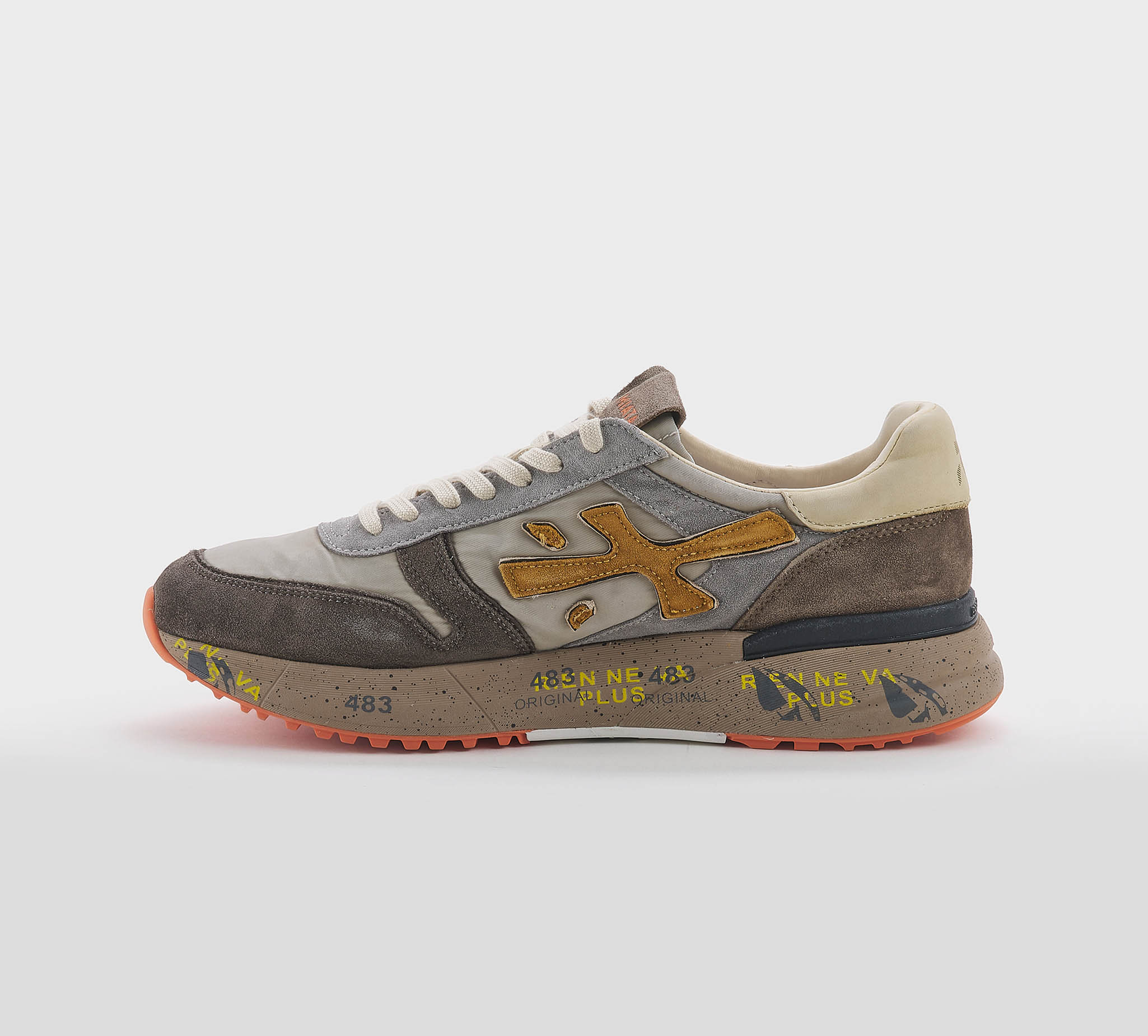 Sneakers Lucy in camoscio moro grigio -inserti tessuto tecnico ncciola -logo camoscio cuoio -talloncino pelle beige -laccio corda -plantare anatomico -calzata regolare Fondo gomma Made in Vietnam SS 26