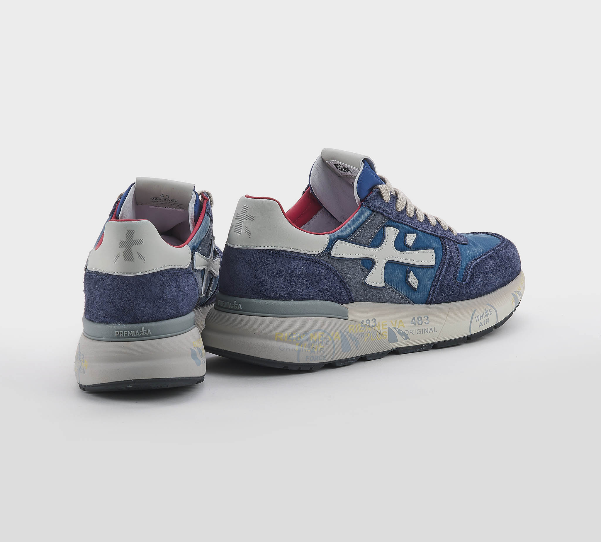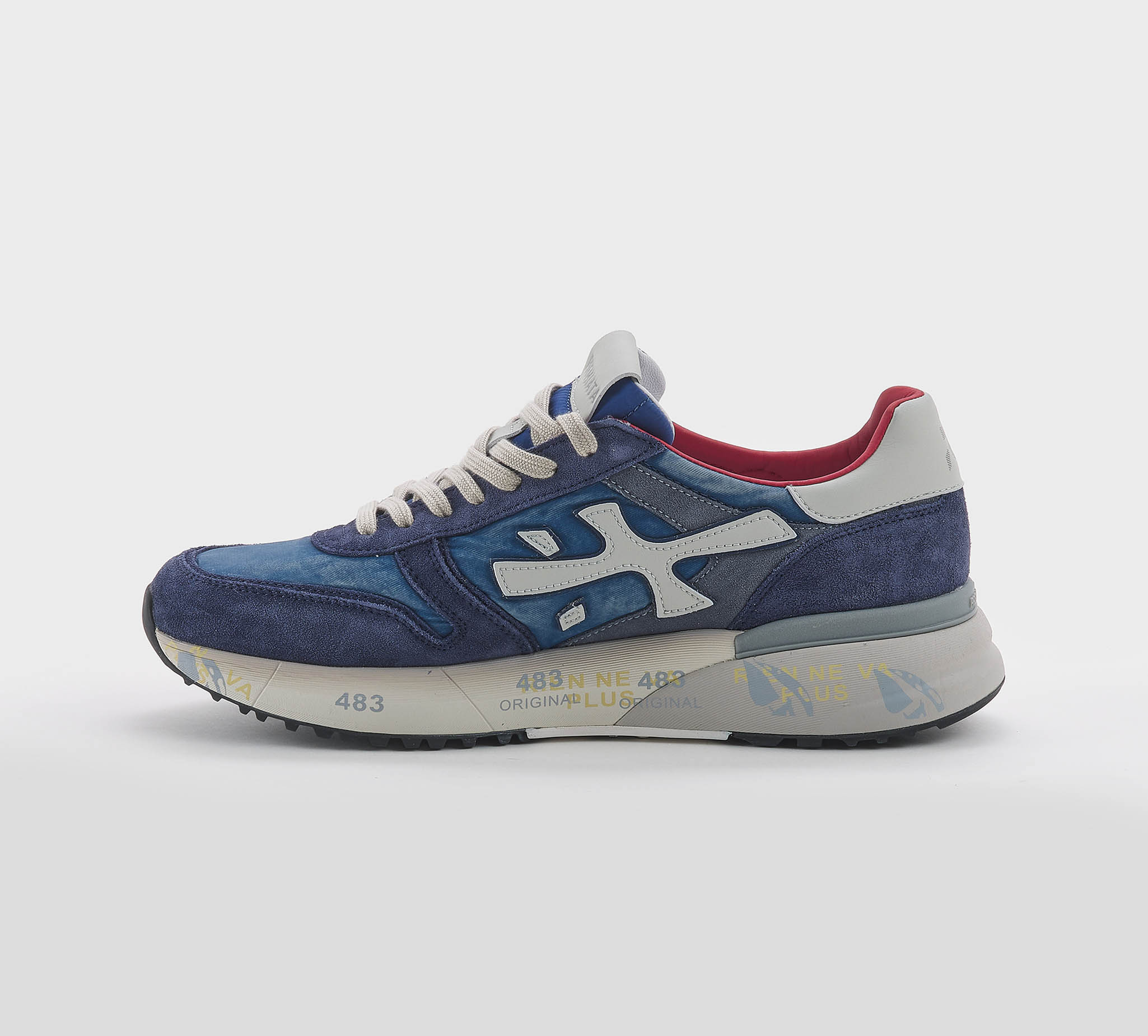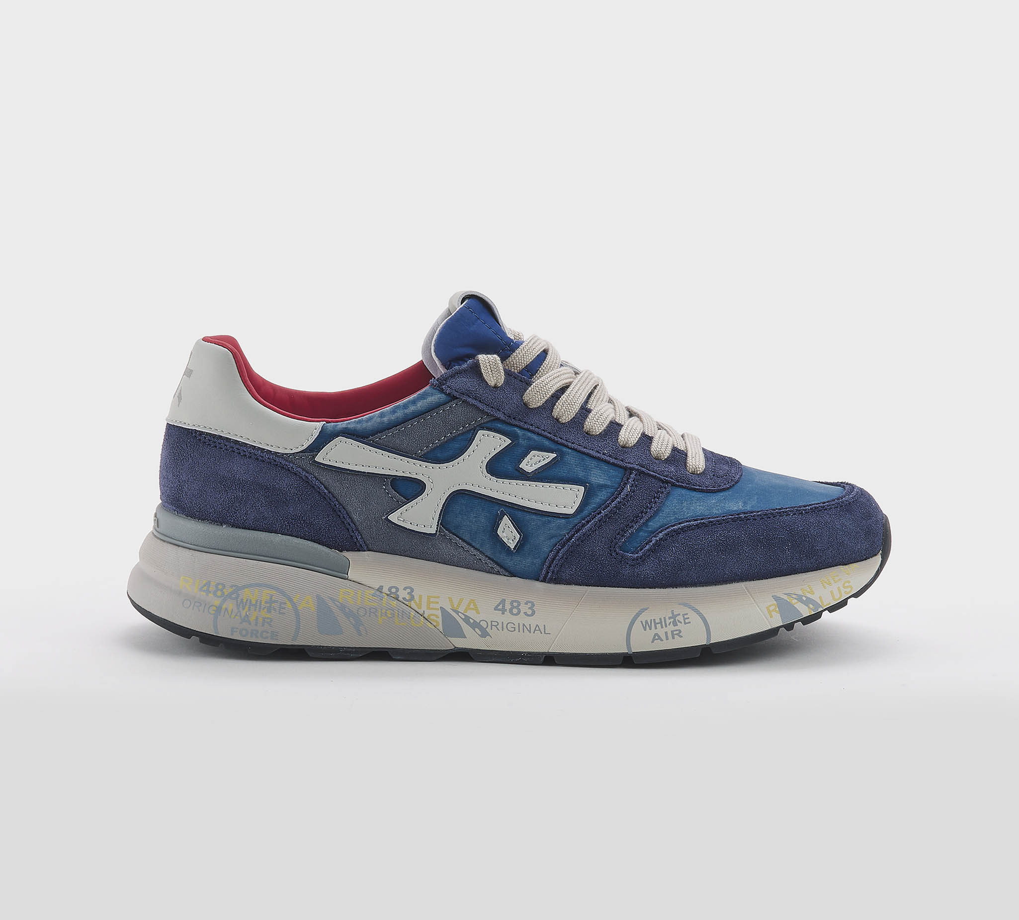 Sneakers Lucy in camoscio blu -inserti tessuto tecnico blu delavè -logo pelle ghaccio -talloncino pelle ghiaccio -laccio corda -plantare anatomico -calzata regolare Fondo gomma Made in Vietnam SS 26