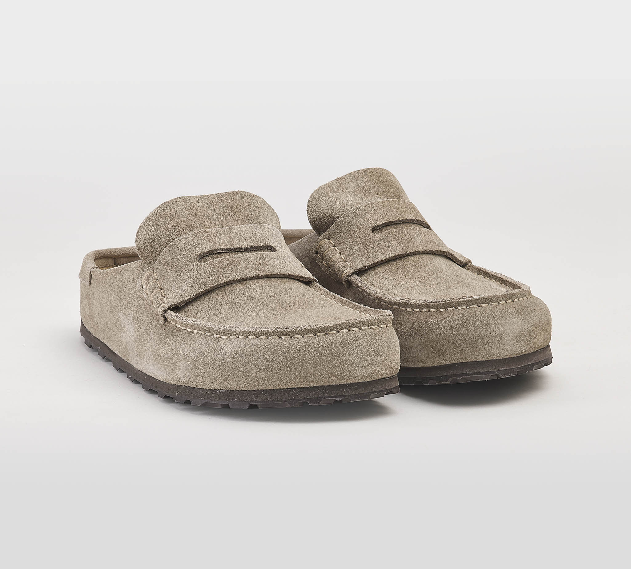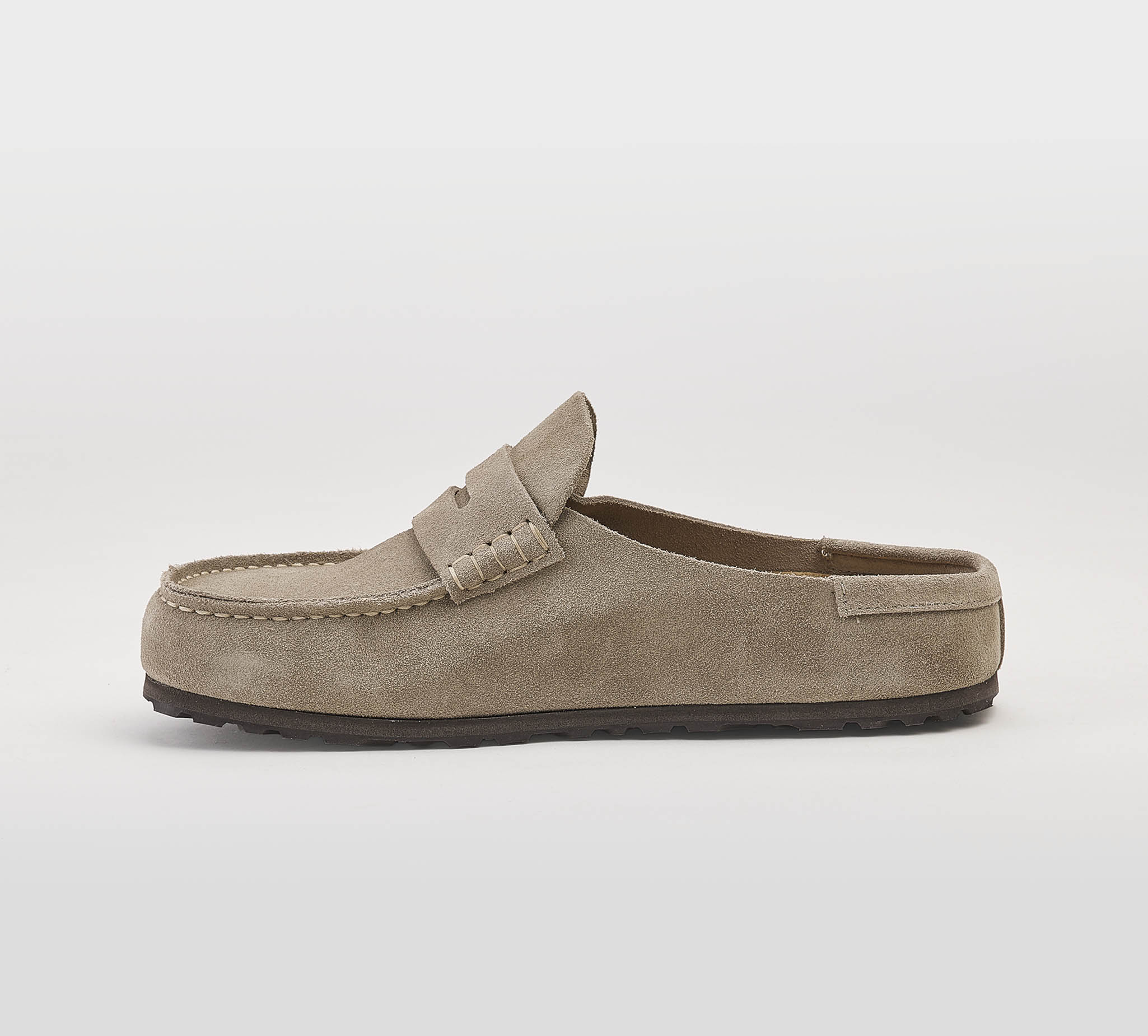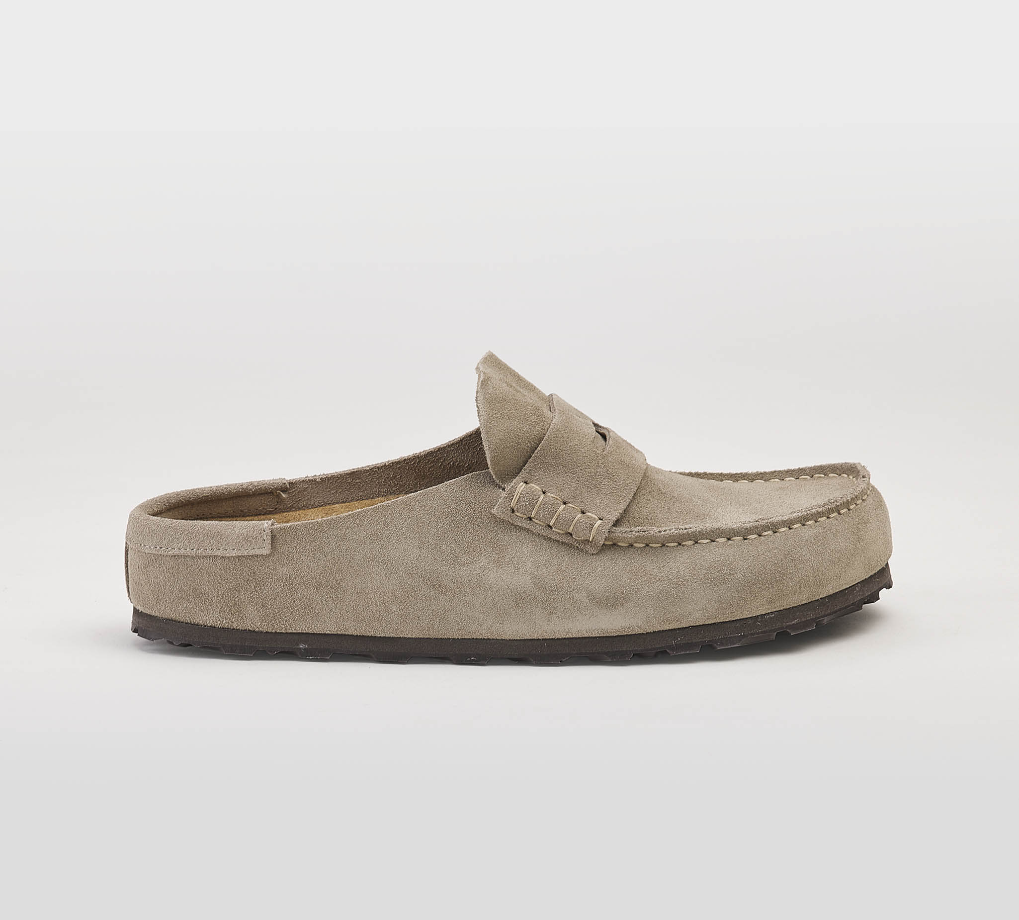 Sabot suede leather taupe -barretta taupe -cuciture a vista -plantare anatomico -calzata regolare -Fondo gomma cuoio Made in Germany