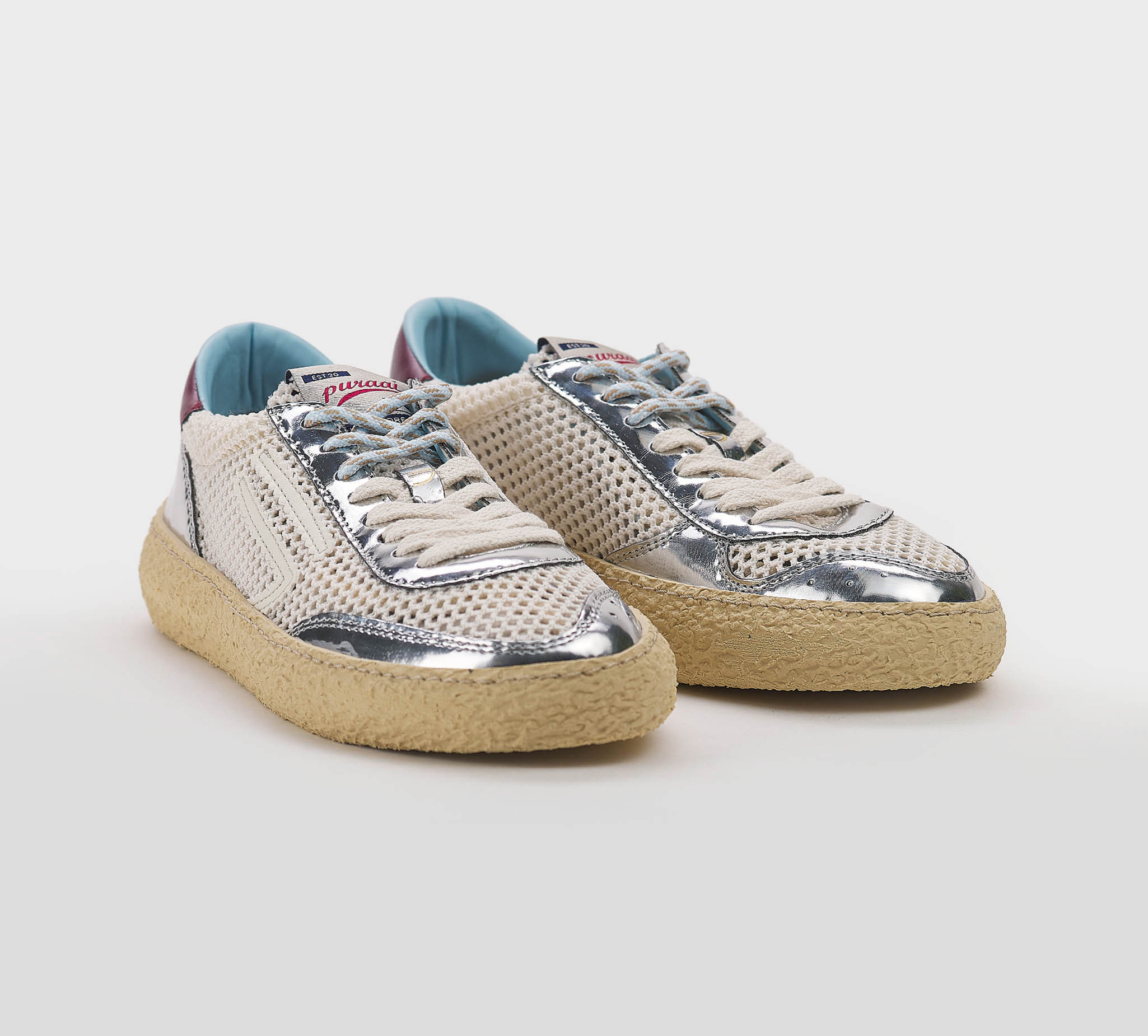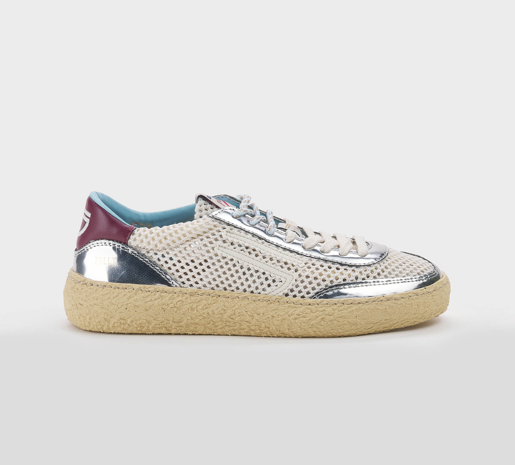 Sneakers in rete panna -inserti pelle argento -logo pelle biano -talloncino pelle bordò -doppio laccio panna-argento -plantare anatomico -calzata regolare Fondo gomma SS 26