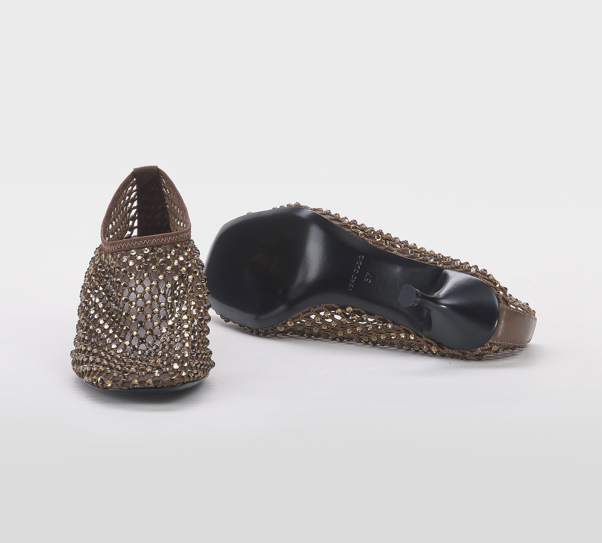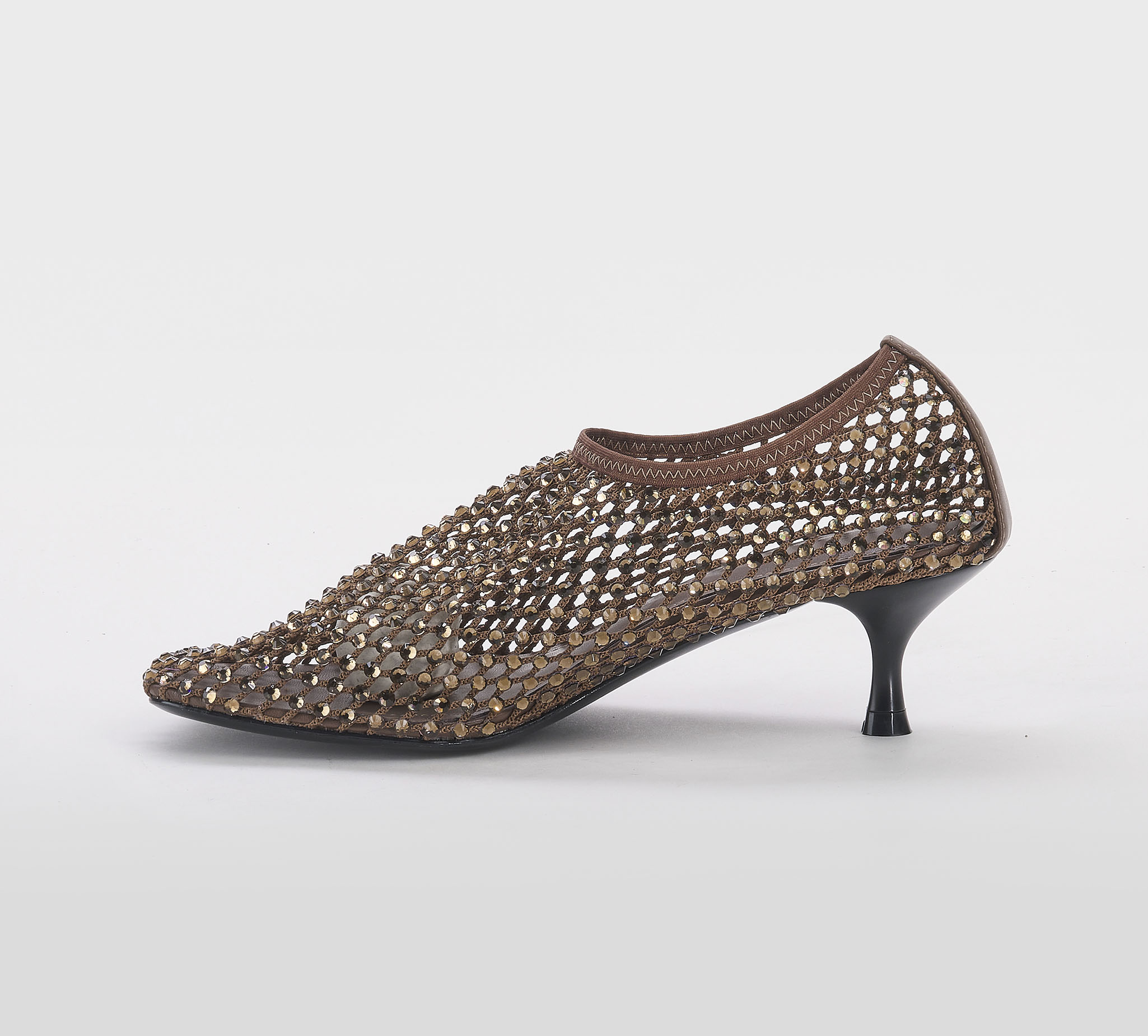 Decoltè accollata rete cacao -swarovsky bronzo -tacco cm 5 -calzata regolare Fondo cuoio Mde in Italy SS 26