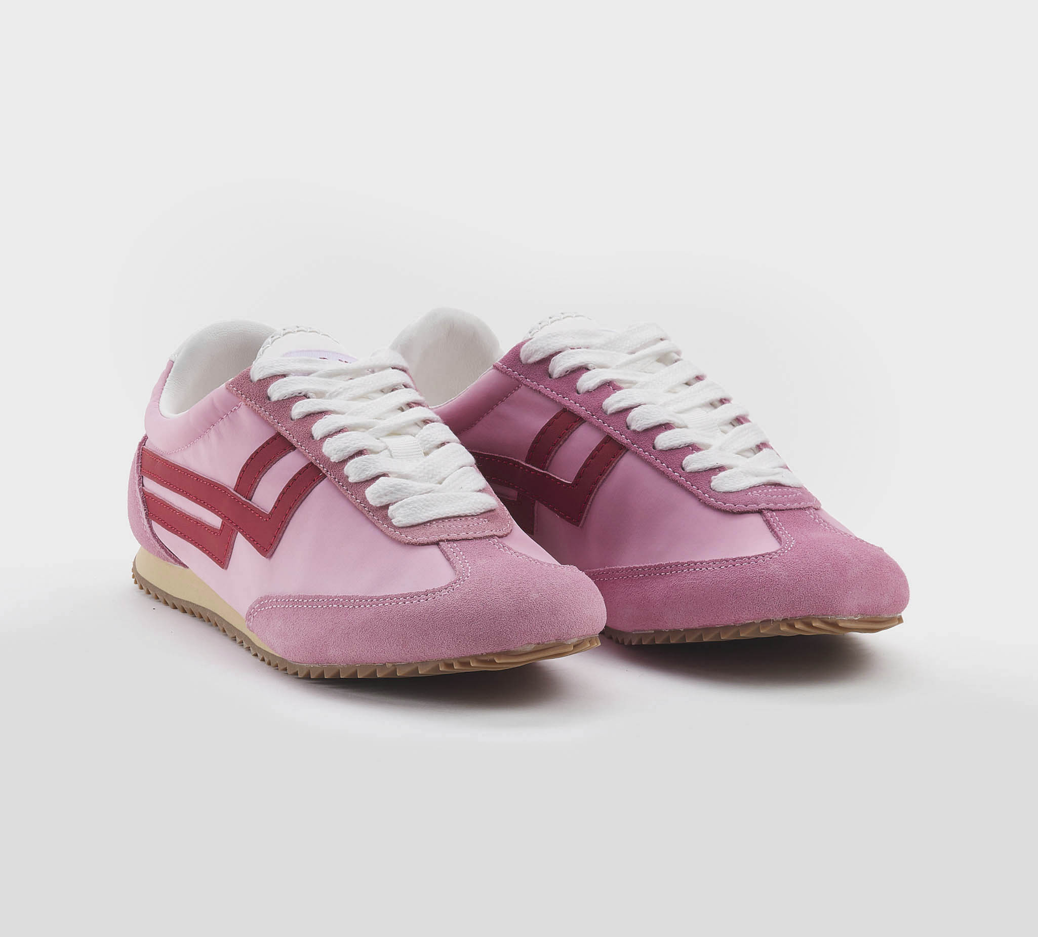 Sneakers in camoscio pink -inserti tessuto tecnico pink -bande pelle rosso -laccio bianco -calzata regolare Fondo gomma SS 26