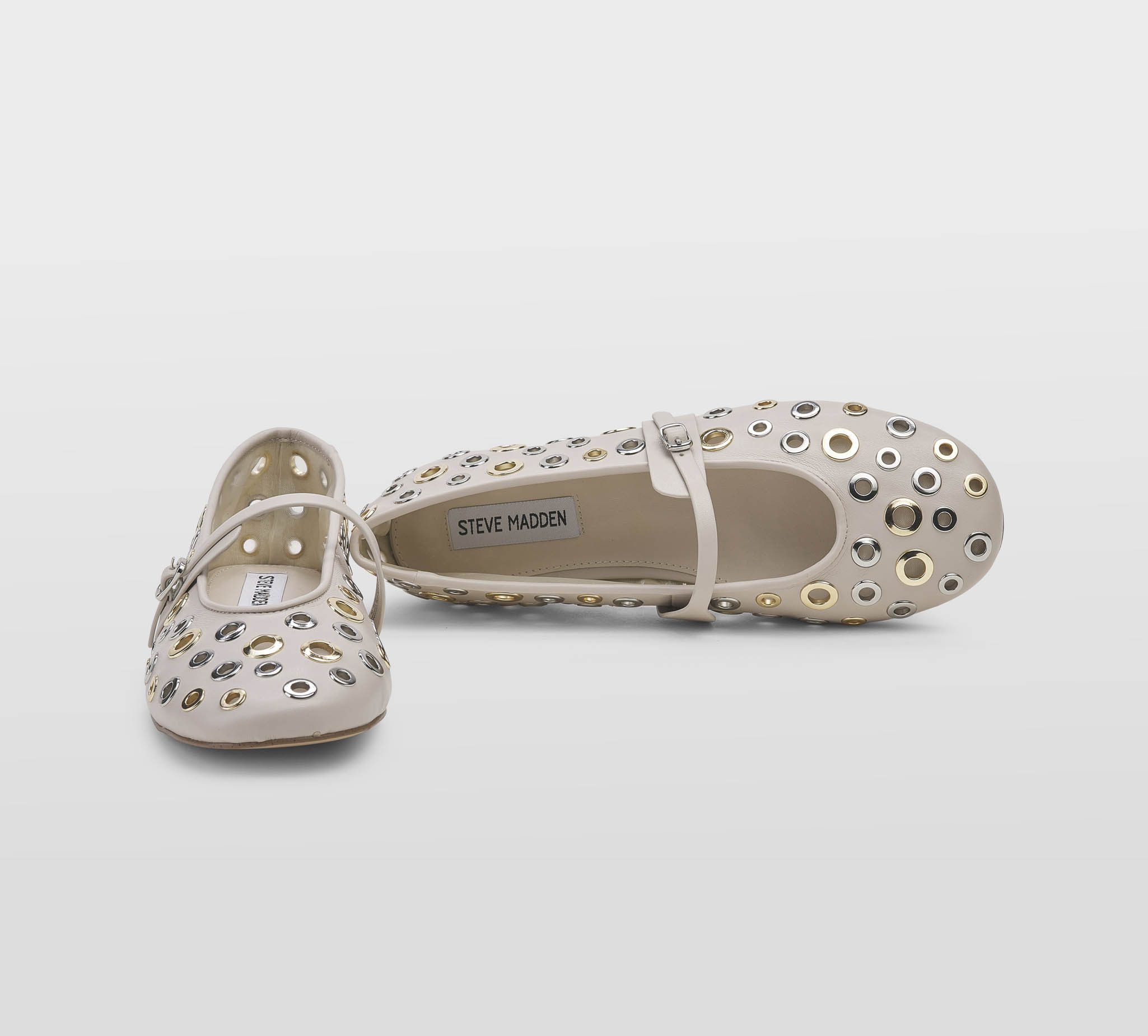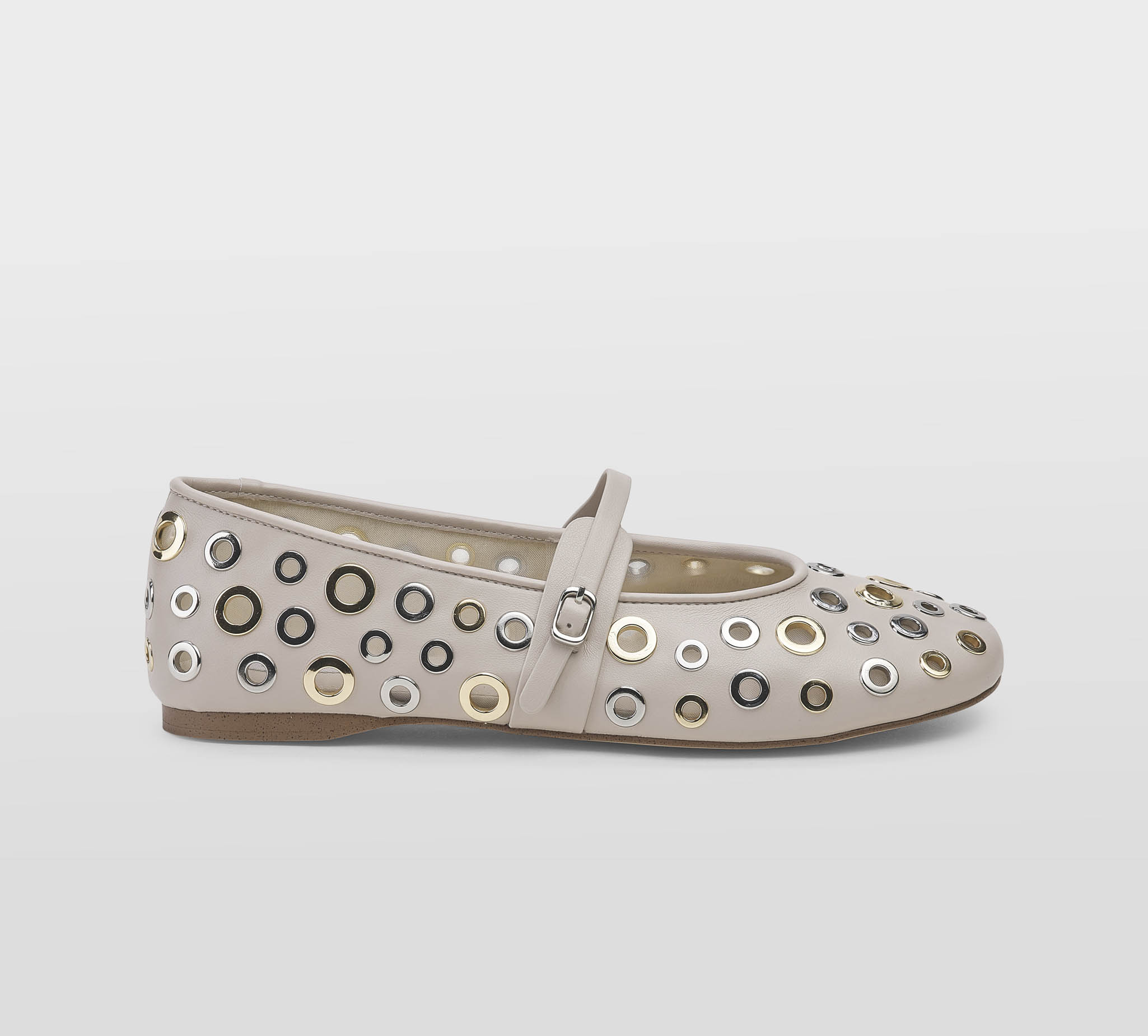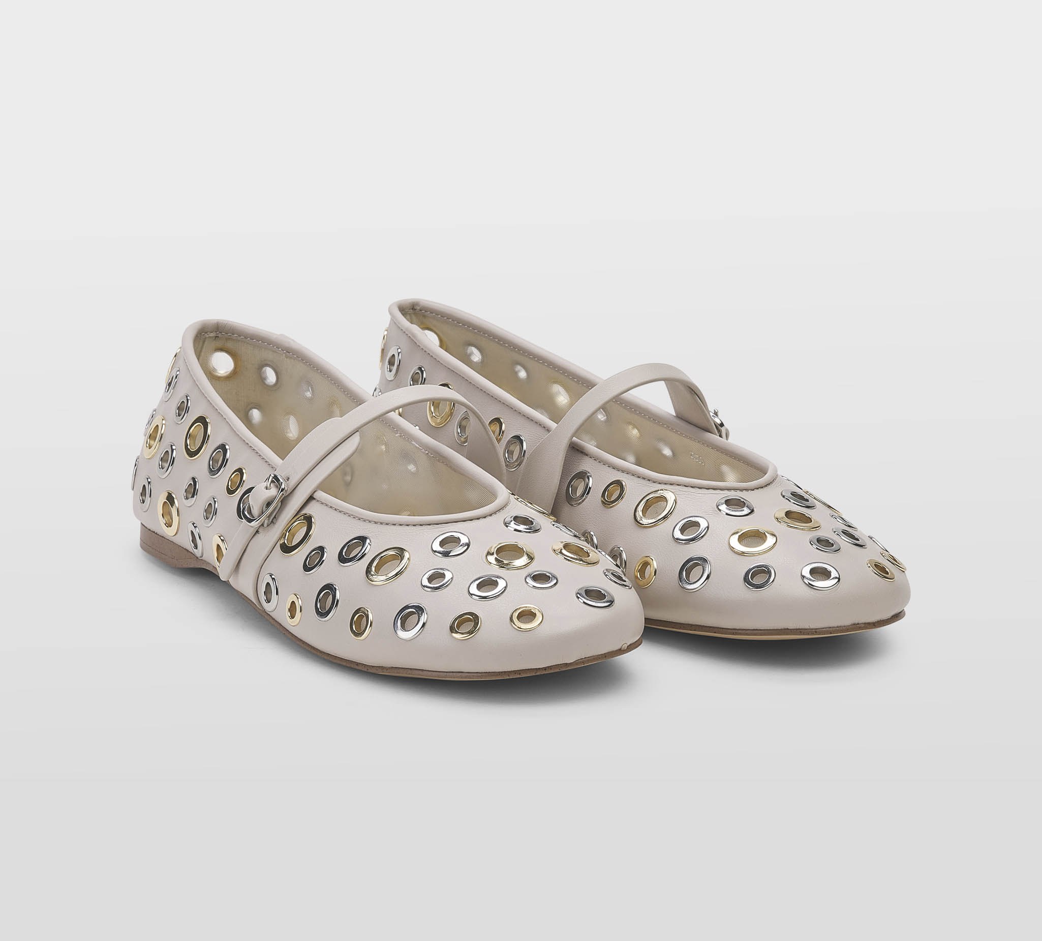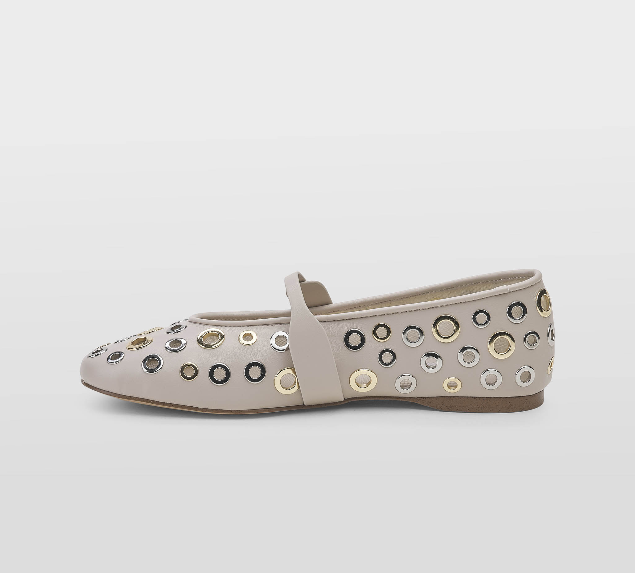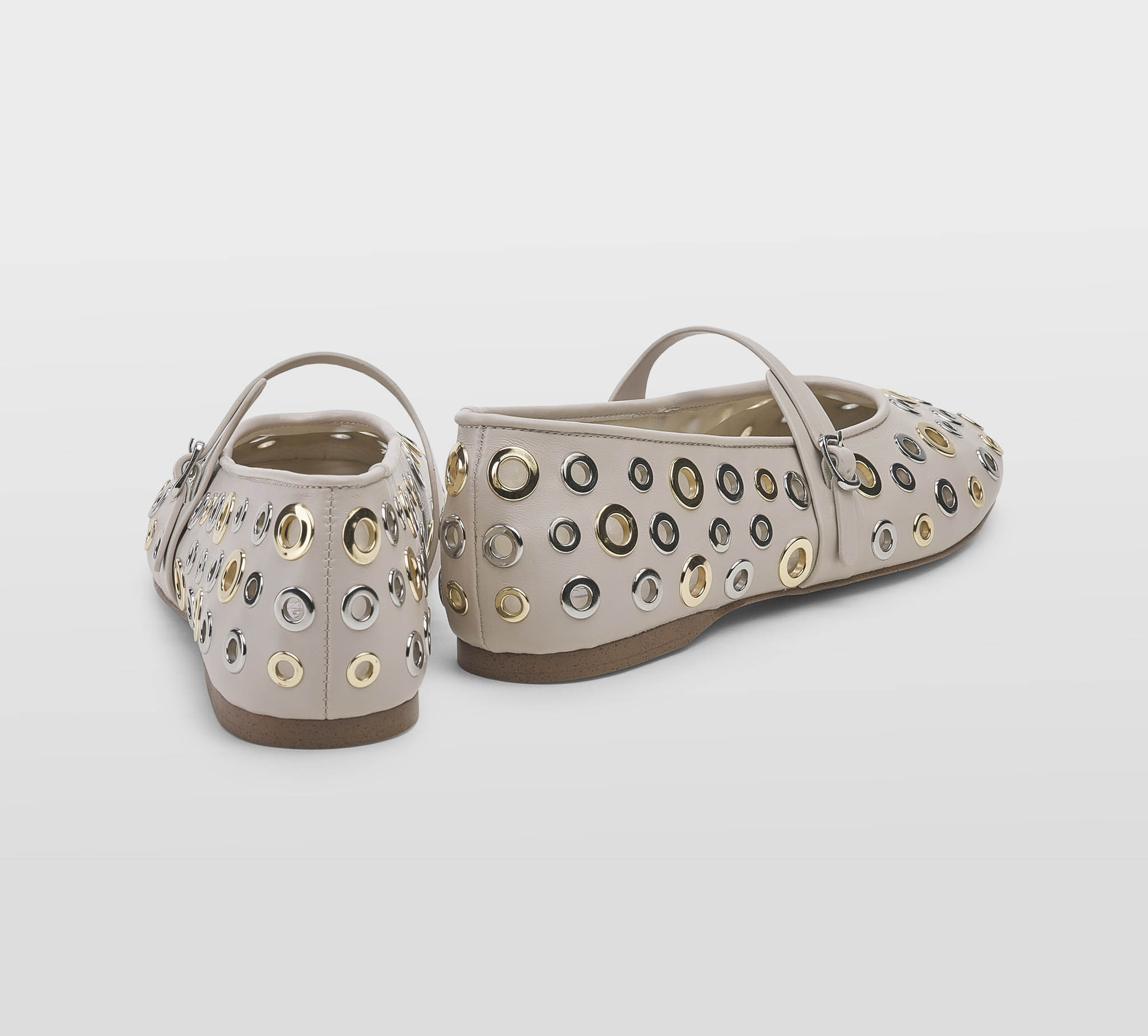 Ballerina in pelle cipria -borchie argento oro -cinturino sul collo -fibbietta argento -tacco cm 1 -calzata scarsa Fondo gomma Made in China SS 25