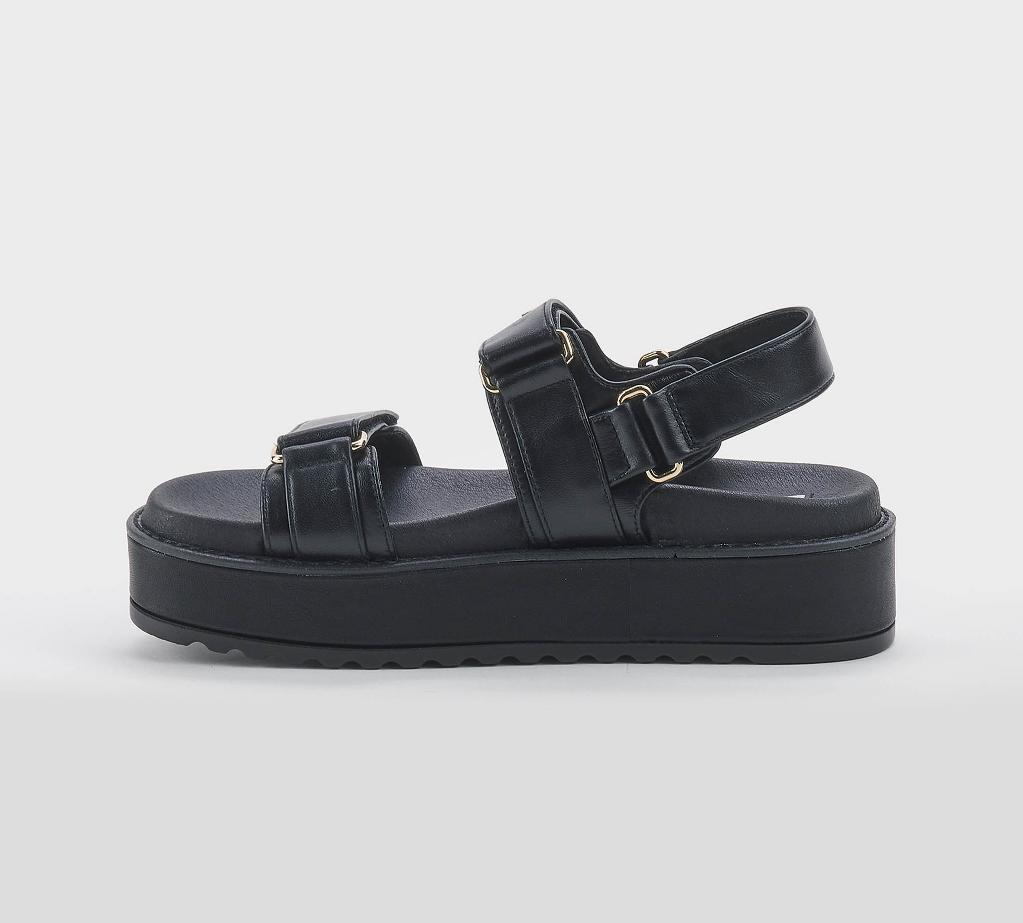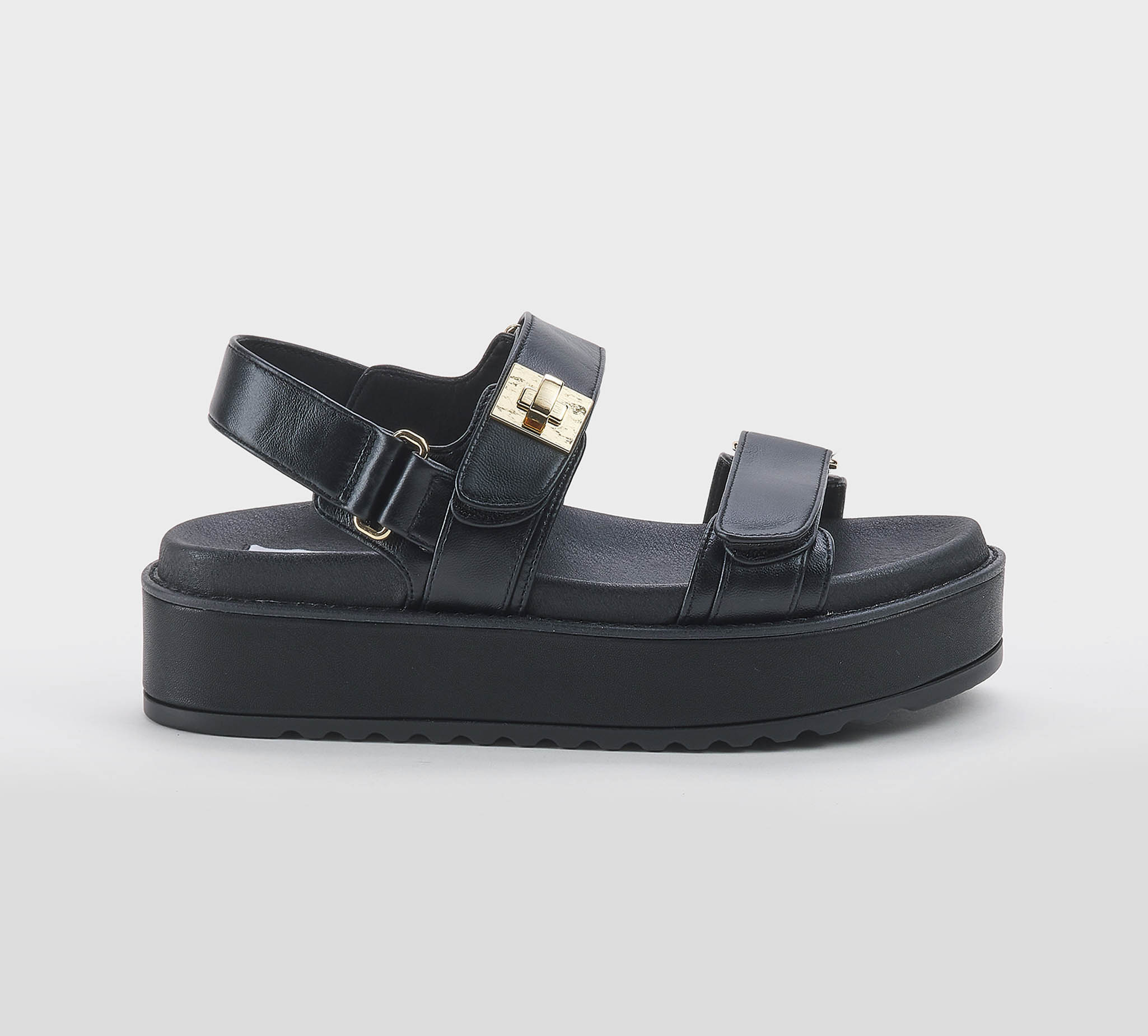 Sandalo pelle nero -doppio strappo -lucchetto oro -zeppa cm 6 -plantare anatomico -calzata scarsa Fondo gomma Made in China SS 26