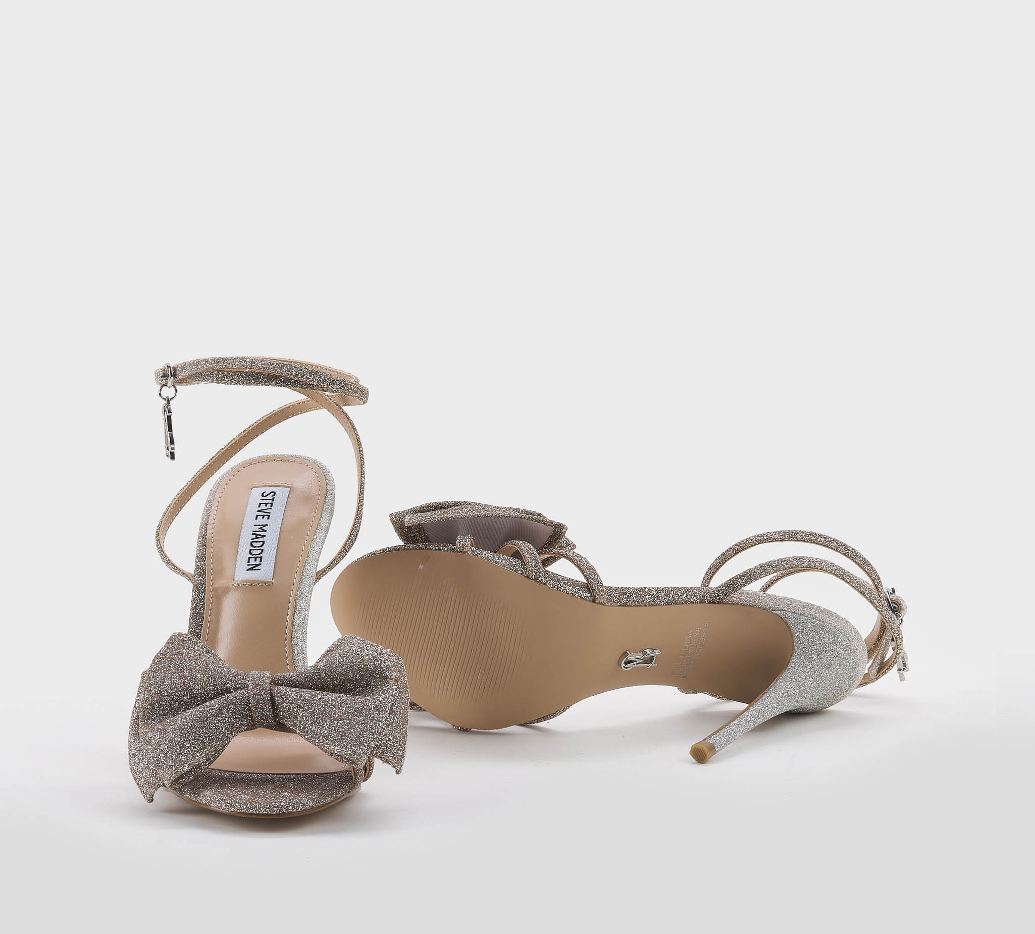 Sandalo in microglitter rose gold -fiocco -cinturino incrociato alla caviglia -fibbietta con logo argento -tacco cm 12 -calzata scarsa Fondo eco elle Made in Chna SS 26