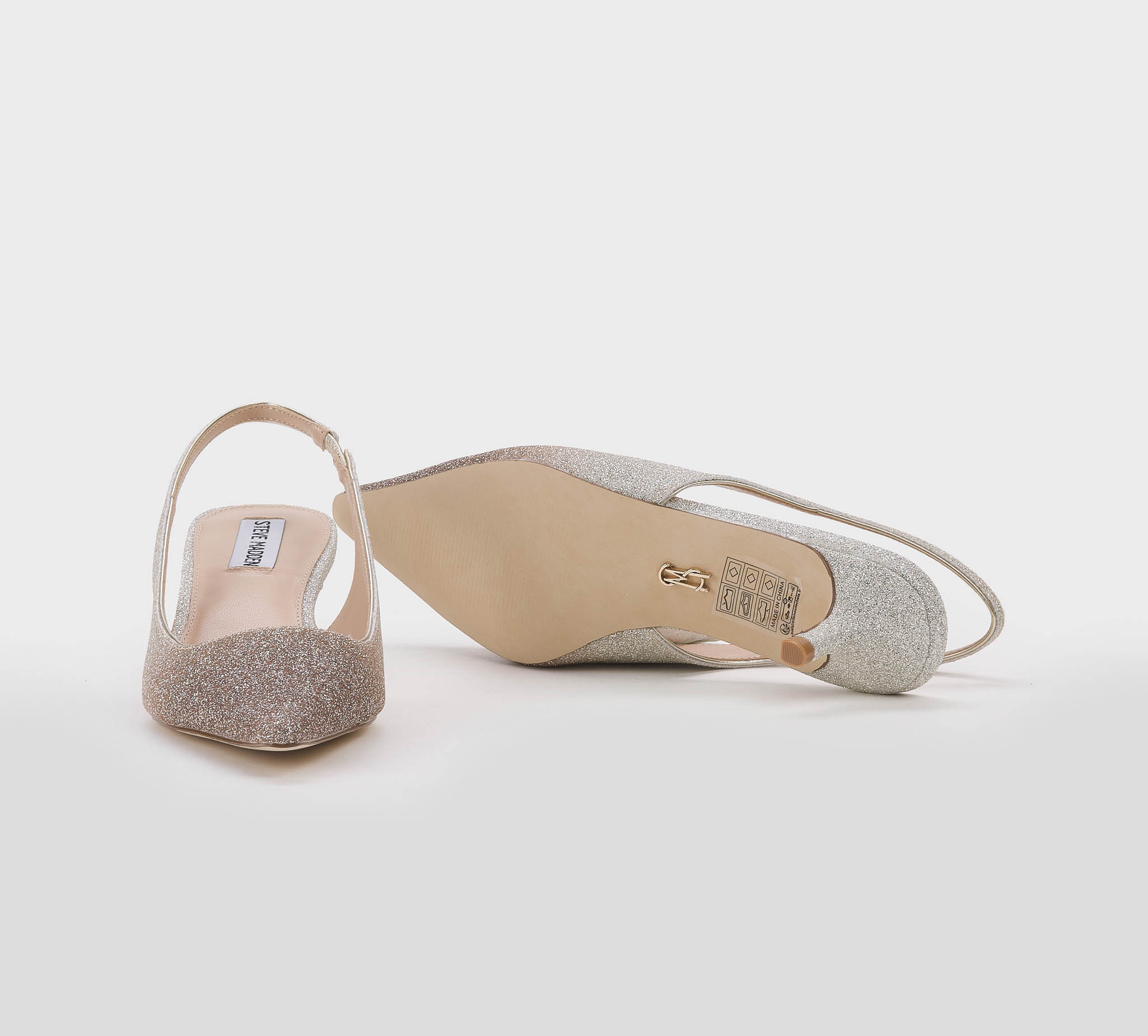 Slin back in glitter sfumato oro bronzo -cinturino elastico -tacco cm 14 -calzata scarsa Fondo eco pelle Made in China SS 26