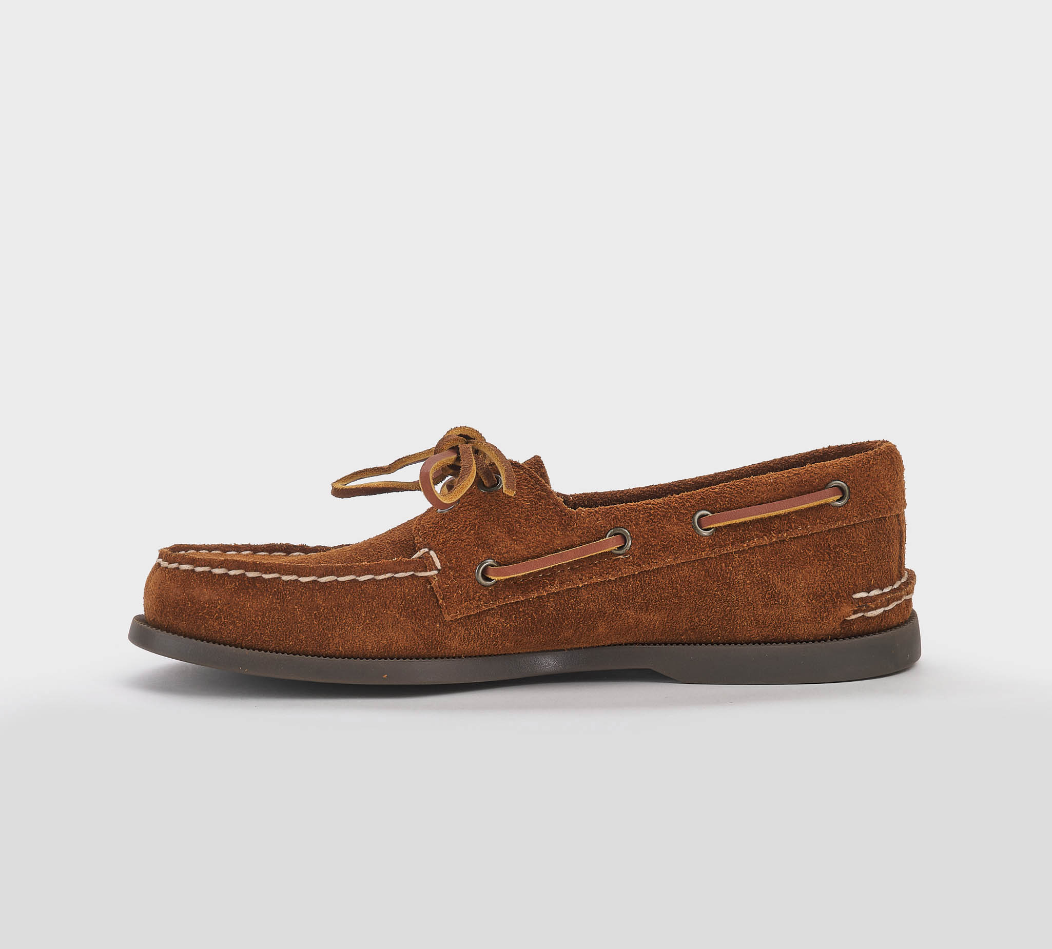 Mocassino barca in camoscio cuoio -cuciture a vista bianco -occhielli peltro -laccio cuoio -calzata regoolare Fondo gomma nero SS 26