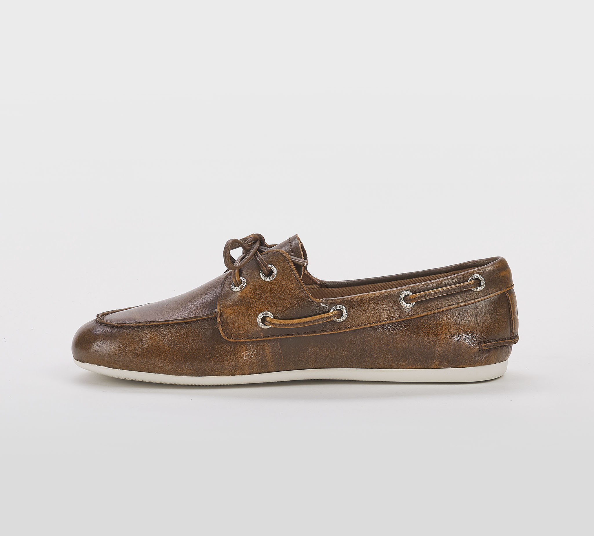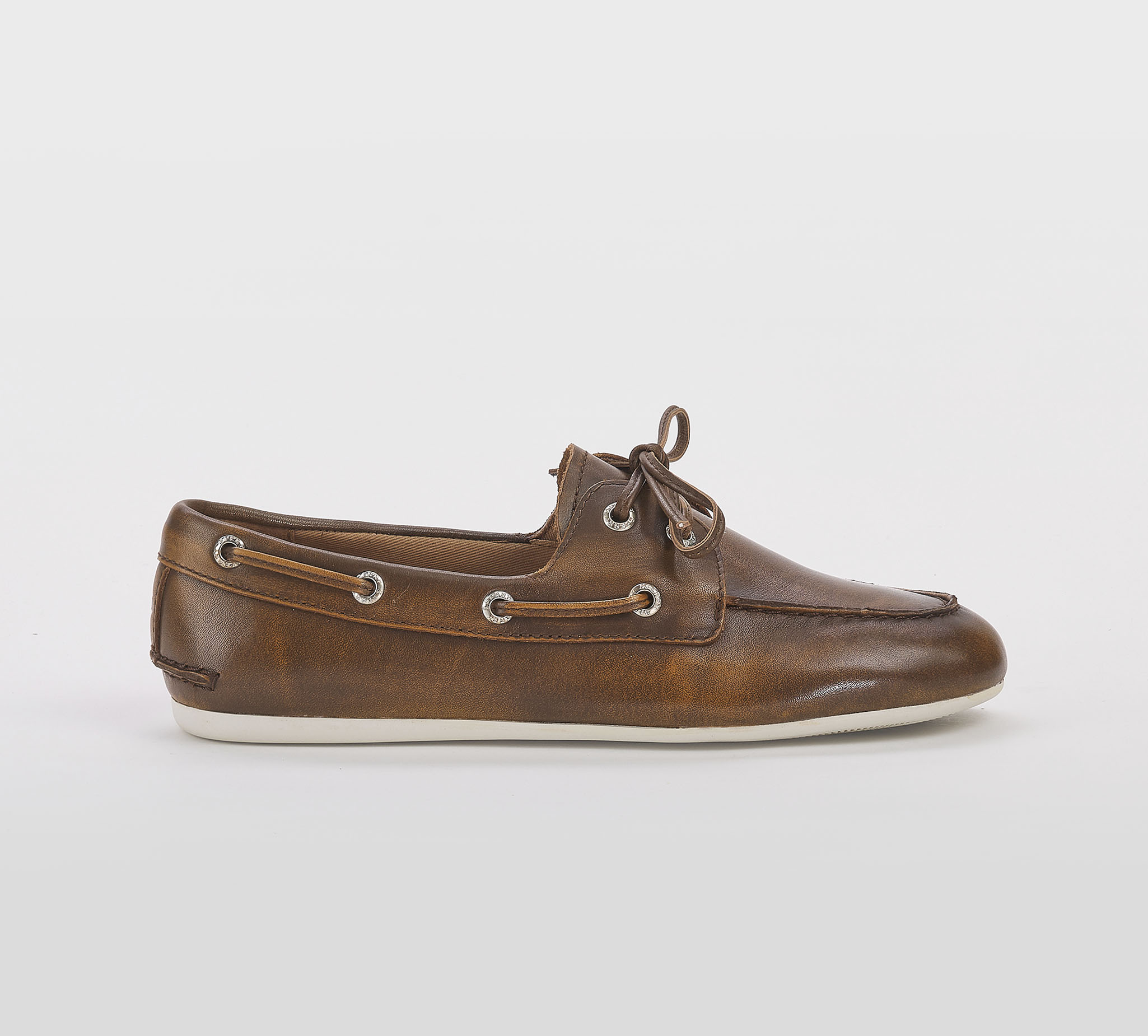 Mocassino barca in pelle sfumata cuoio -cuciture a vista -occhielli argento -laccio cuoio -calzata regoolare Fondo gomma bianco SS 26