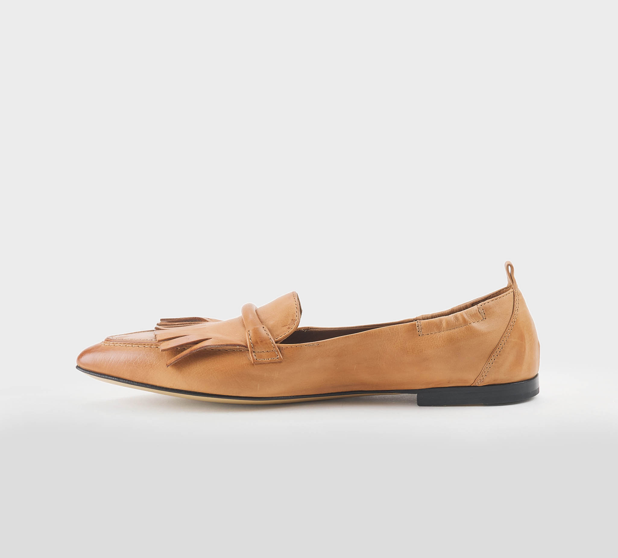 Mocaassino frange in pelle toffee -tacco cm 1,5 -calzata regolare Fondo cuoio Made in Italy ss 26