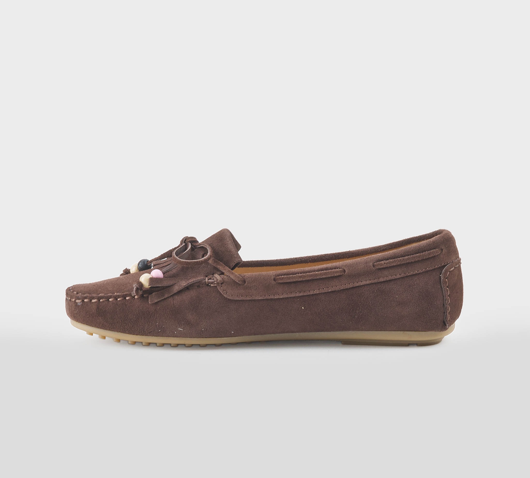 Mocassino frange in camoscio marrone -perline colorate -calzata scarsa Fondo gomma SS 26
