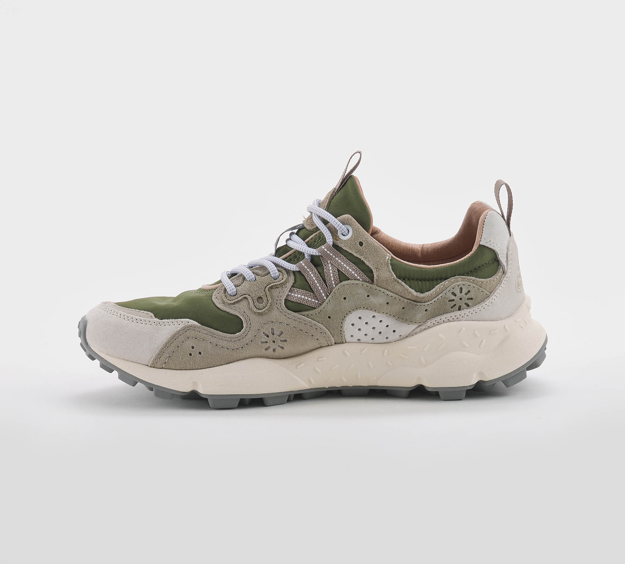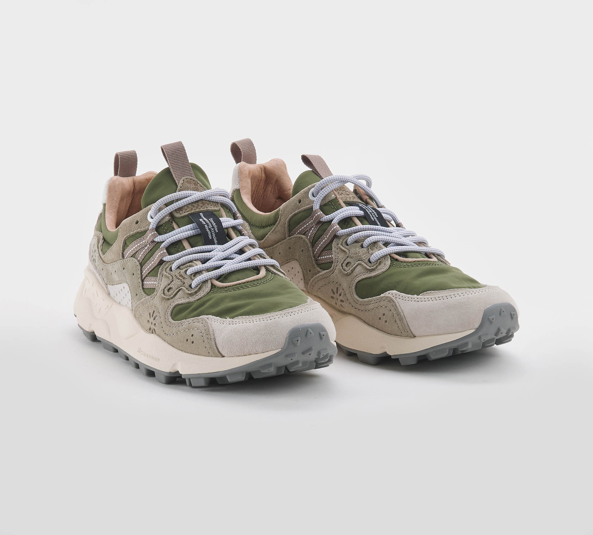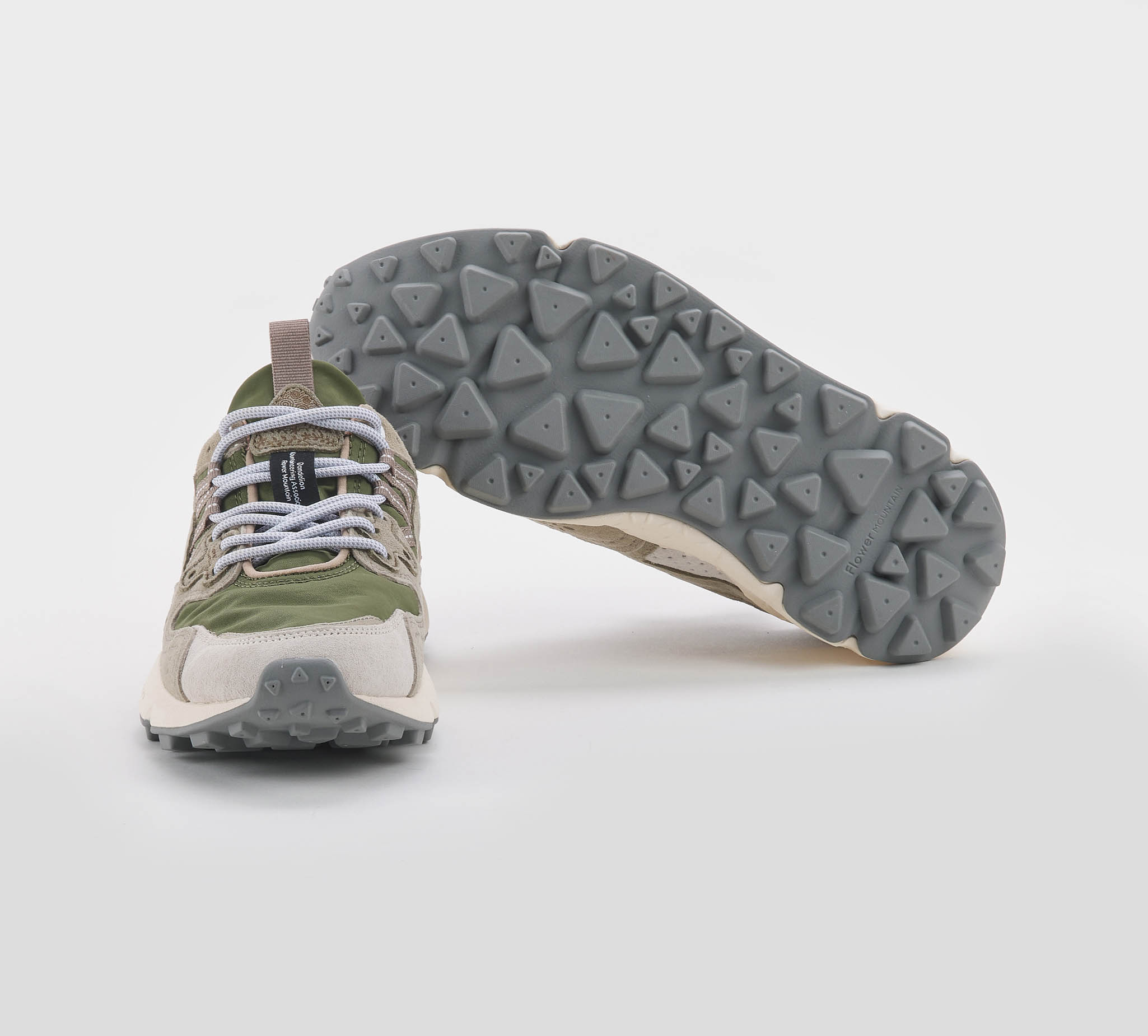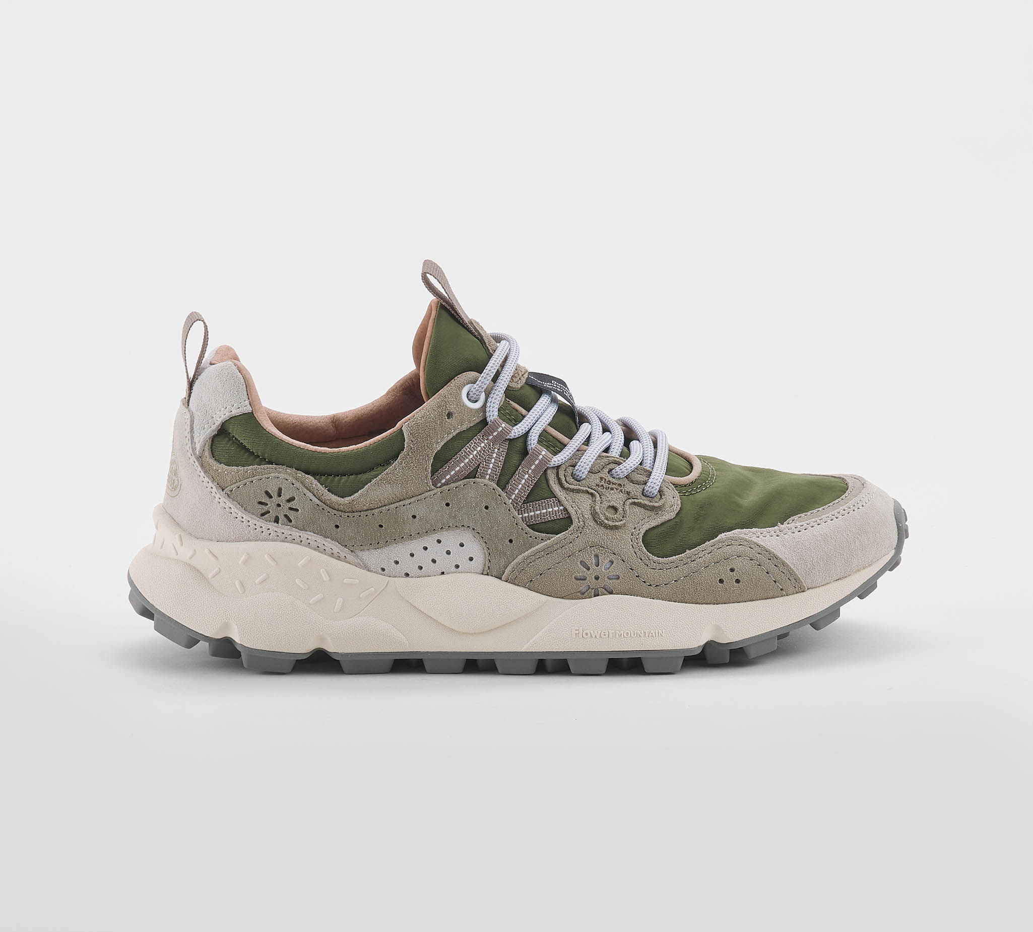 Sneakers Running tessuto tecnico militare -inserti tessuto tecnico giallo -inserti camoscio tortra,salvia -laccio bainco nero -calzata regolare Fondo gomma Made in Italy SS 26