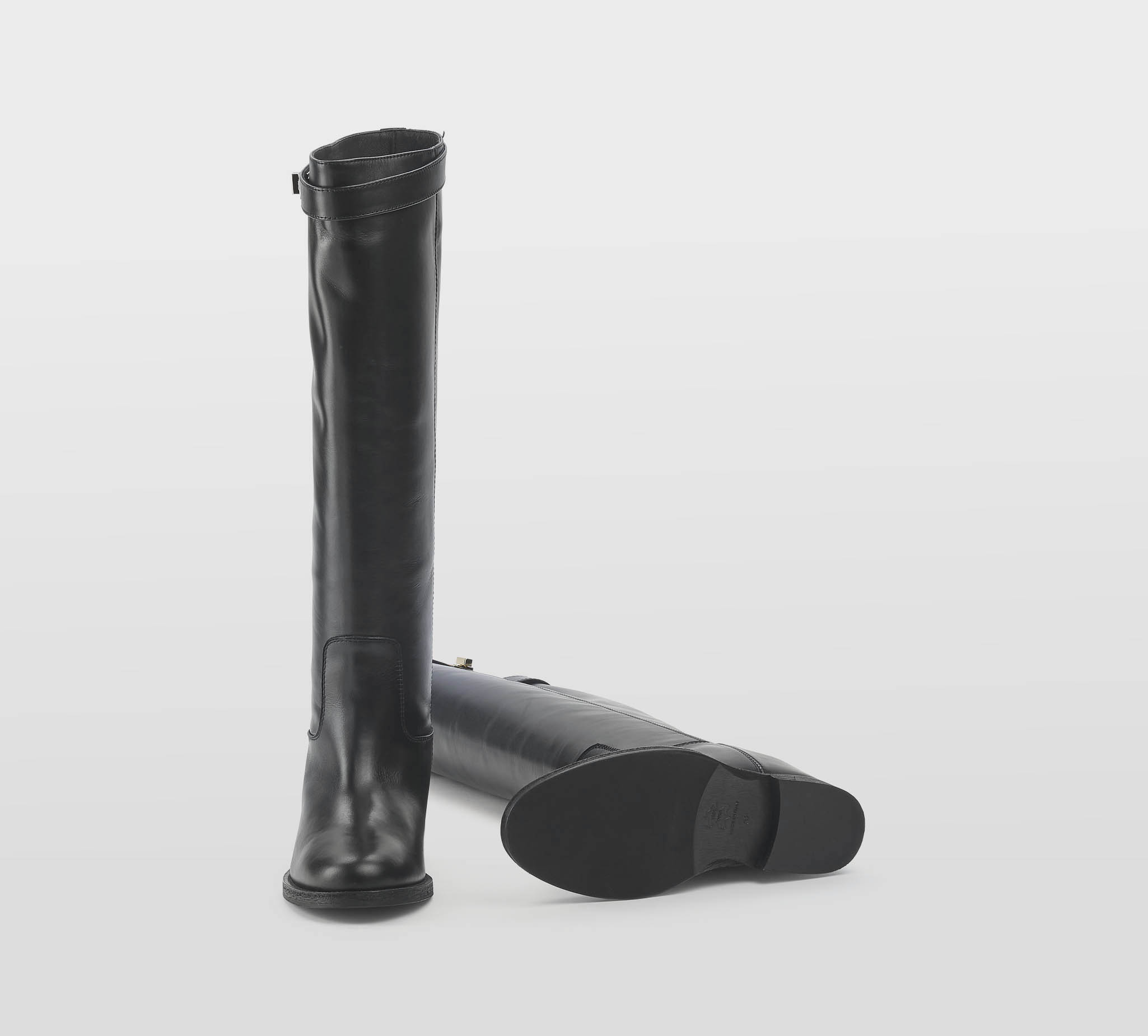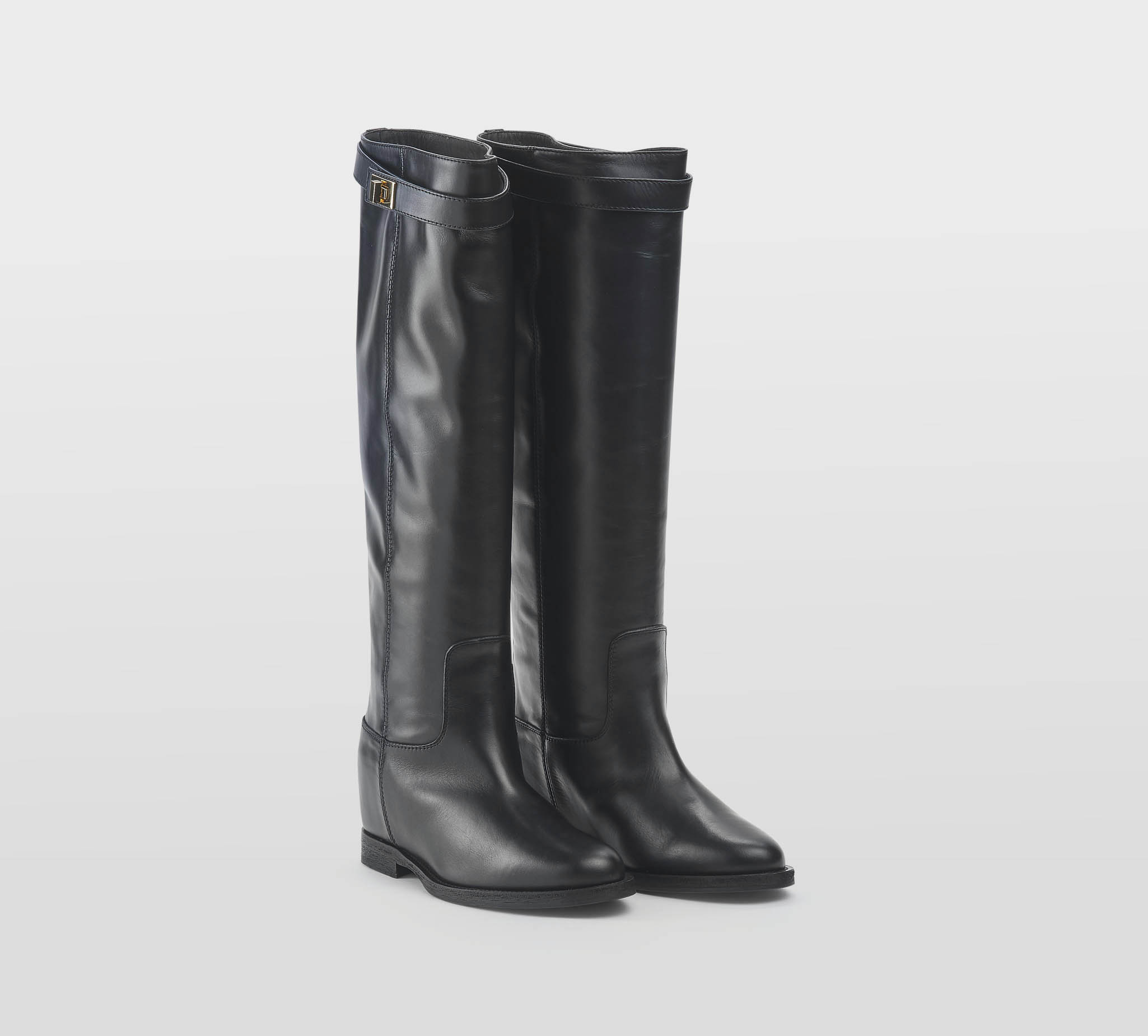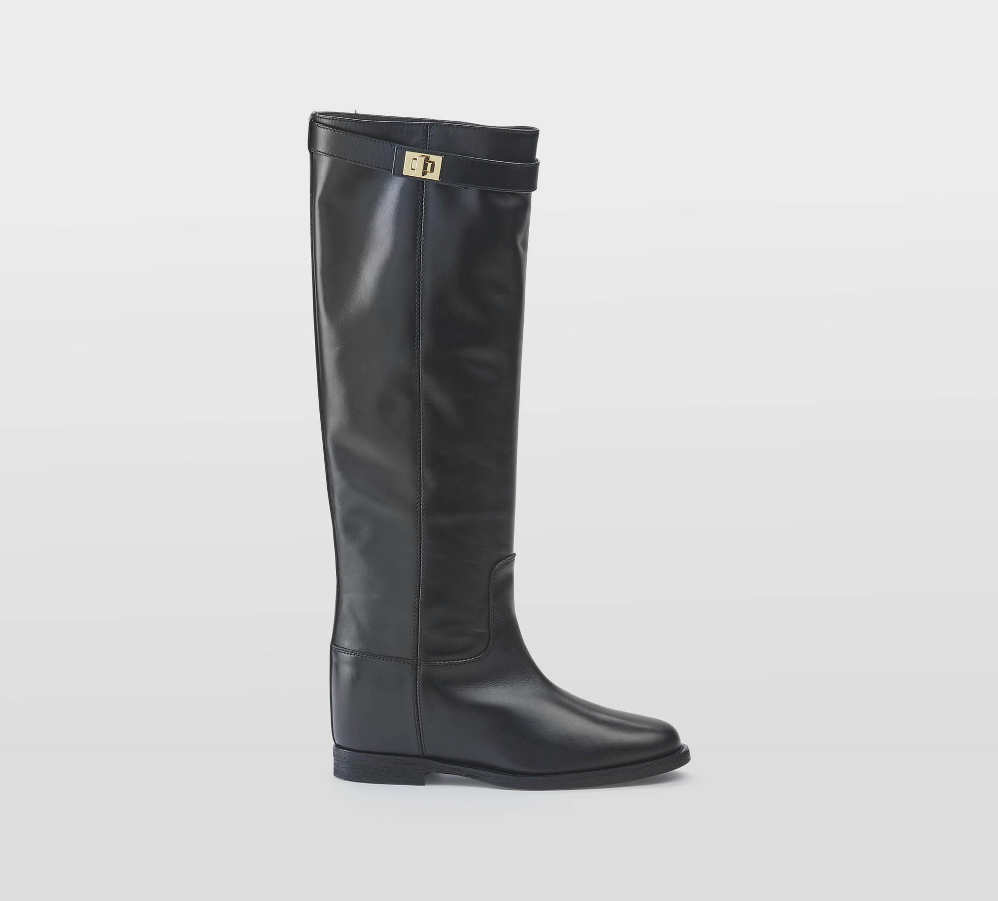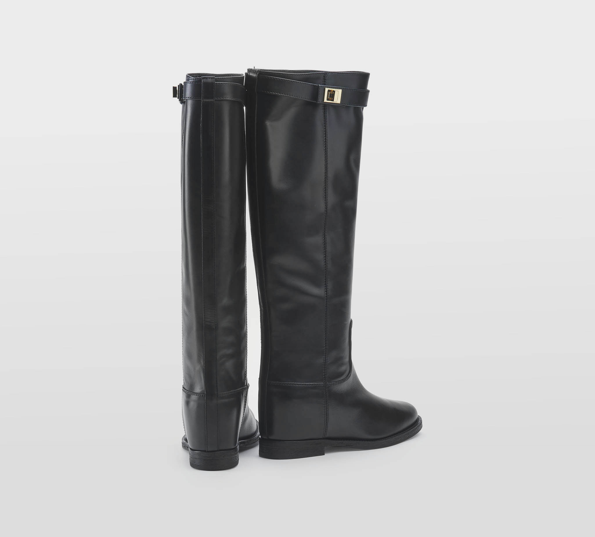 Stivale cavallerizzo pelle nero – lucchetto oro -zeppa interna cm 4,5 -gambale sotto al ginocchio cm 42 -tacco cm 2 -fondo cuoio con mezza gomma -calzata regolare Made in Italy,dust bag inclusa FW 25
