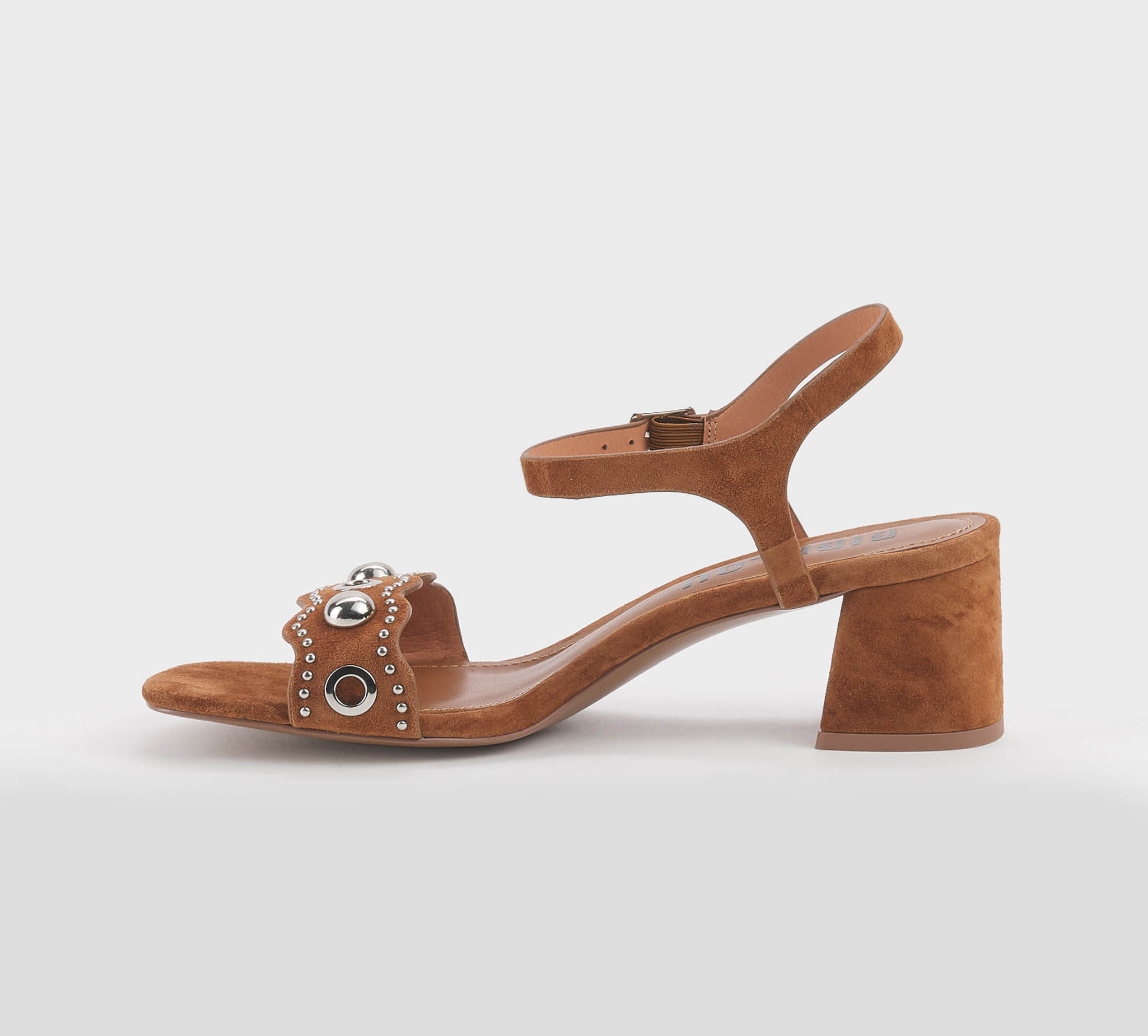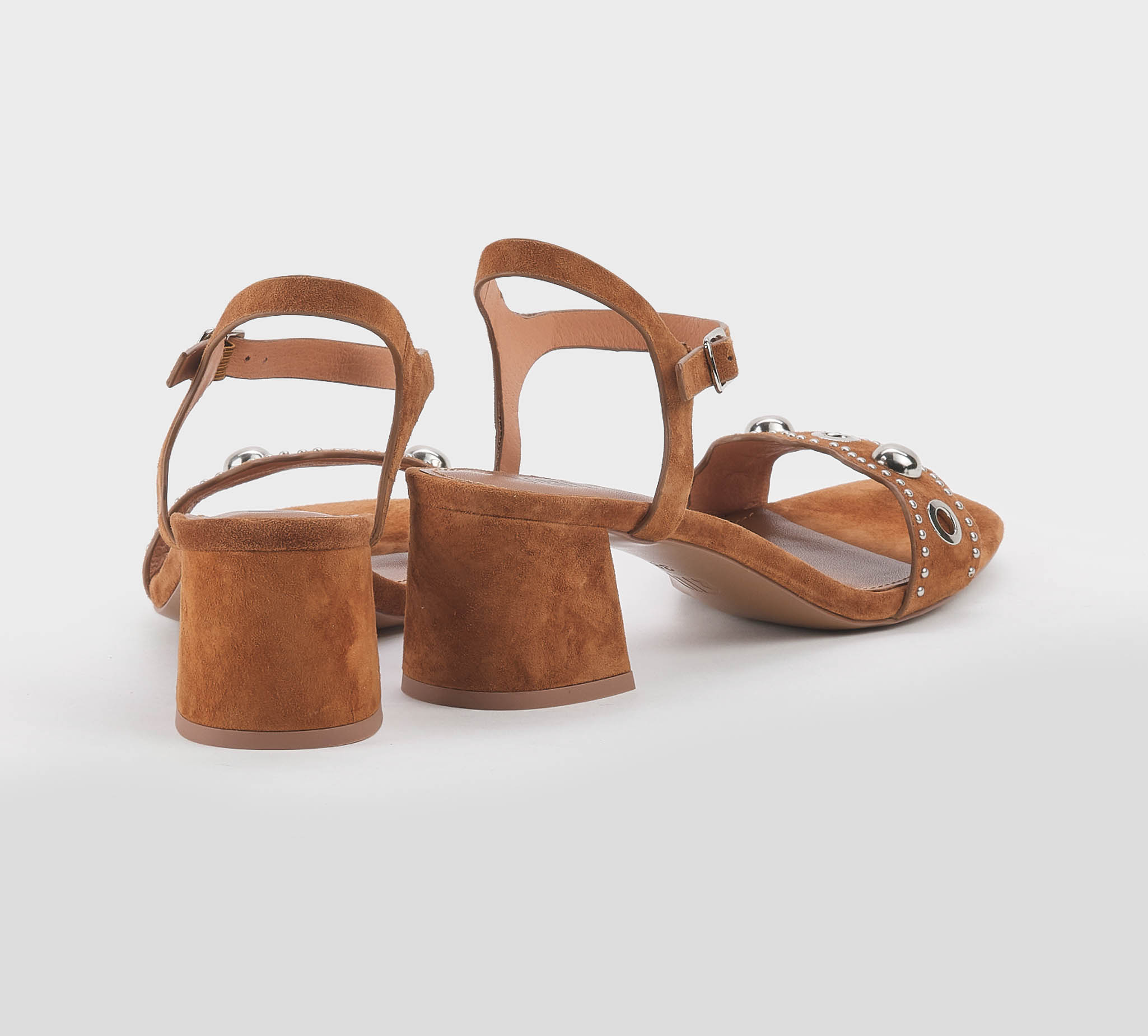 Sandalo in camoscio cuoio -borchie argento -cinturino al tallone -fibbietta argento -tacco cm 6 -calzata scarsa Fondo gomma Made in Spain SS 26