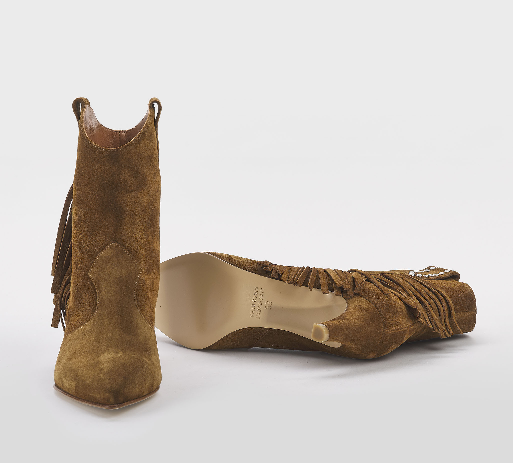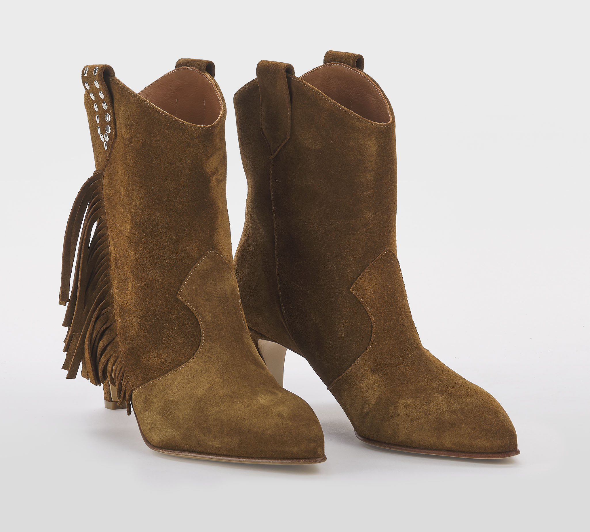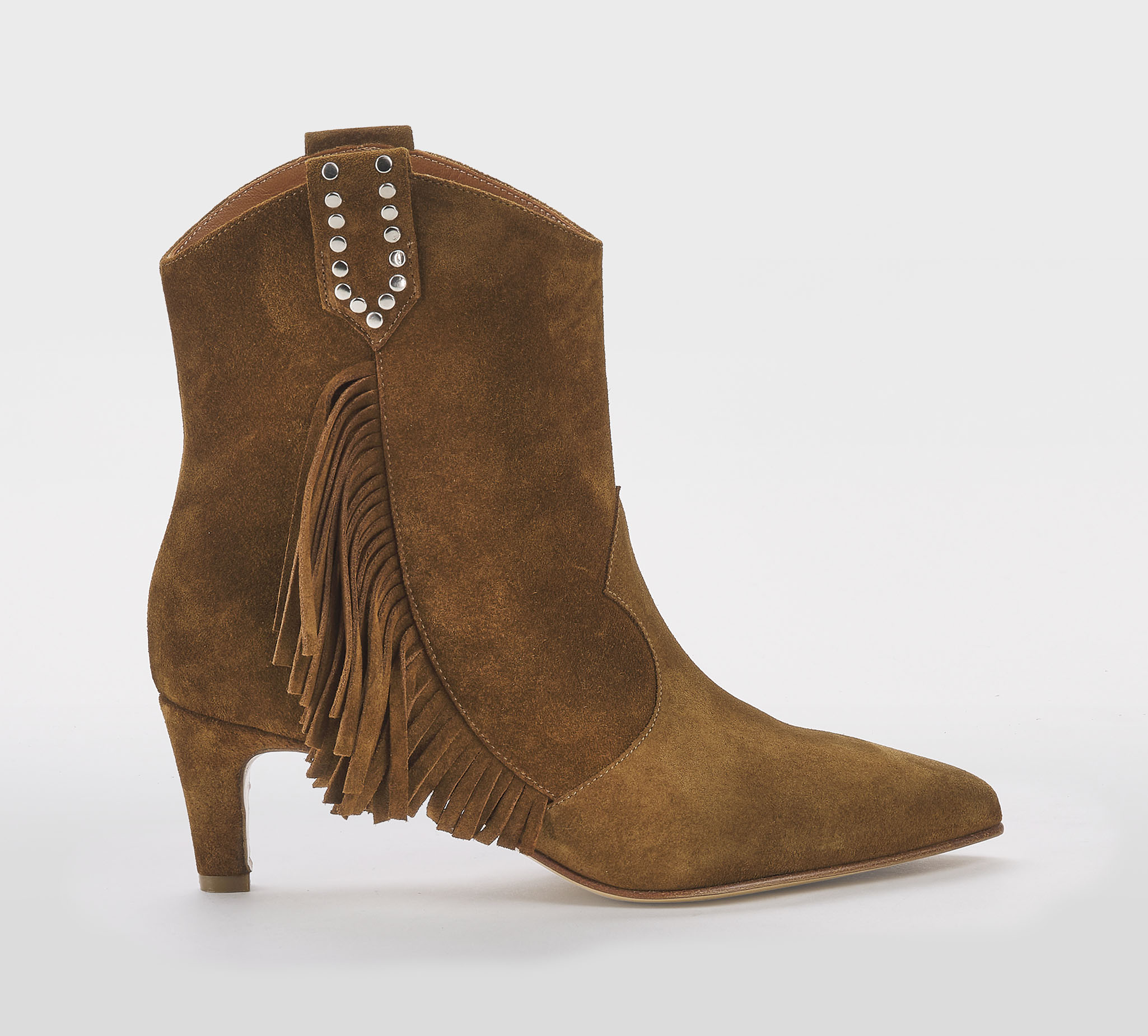 Stivaletto in camoscio cuoio -frange cuoio -borchie argento -tacco cm 5 -calzata regolare Fondo cuoio Made in Italy SS 26