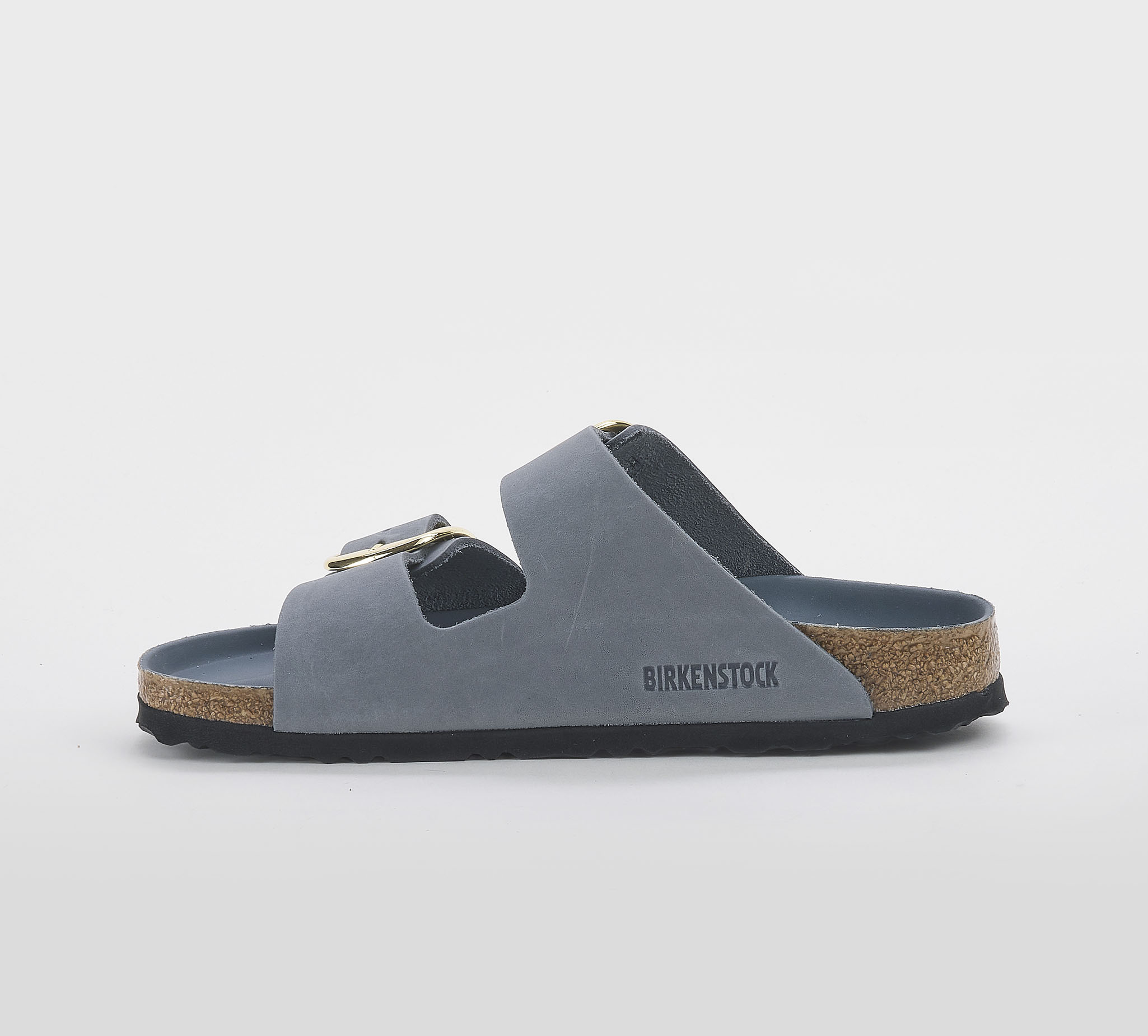 Ciabatta Arizona Big Buckle pelle oliata basalto -2 fasce -fibbie oro grandi -plantare anatomico -calzata regolare Fondo gomma nero SS 26