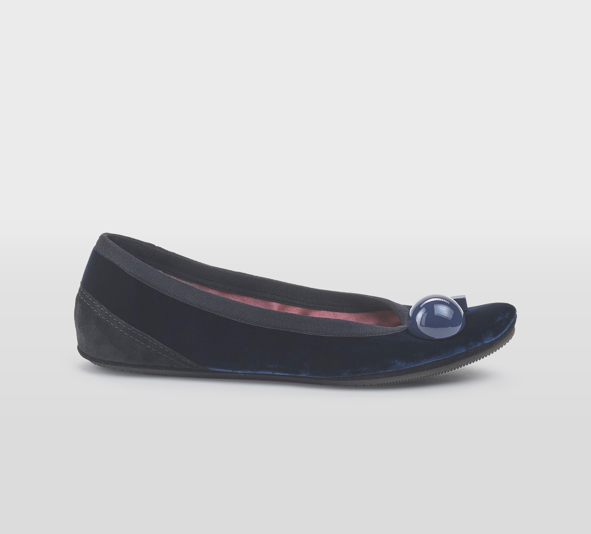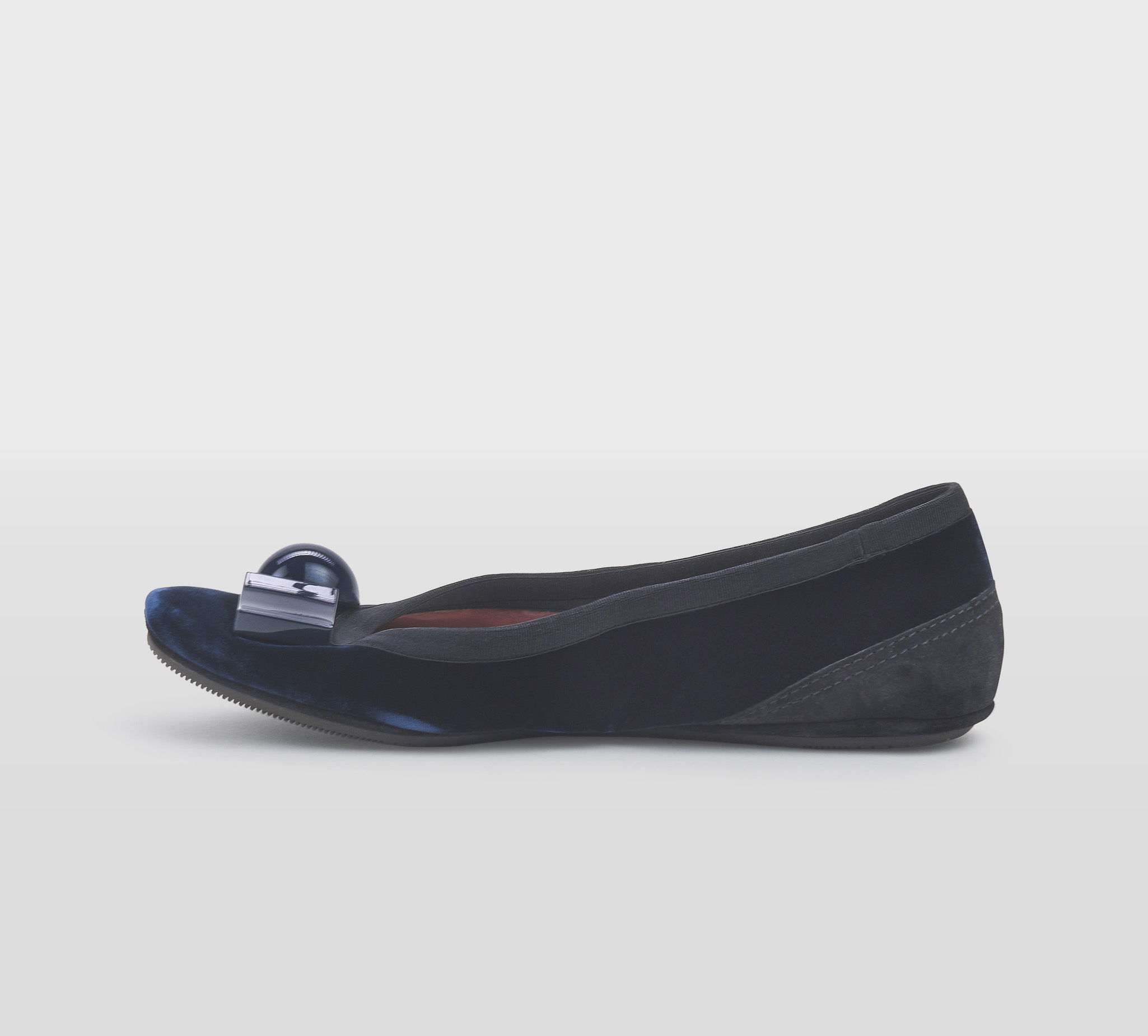 Ballerina in velluto blu -bordature tessuto nero -iconici accessori cerchio e quadrato -plantare interno -calzata regolare Fonddo gomma Made in Italy,dust bag inclusa FW 25