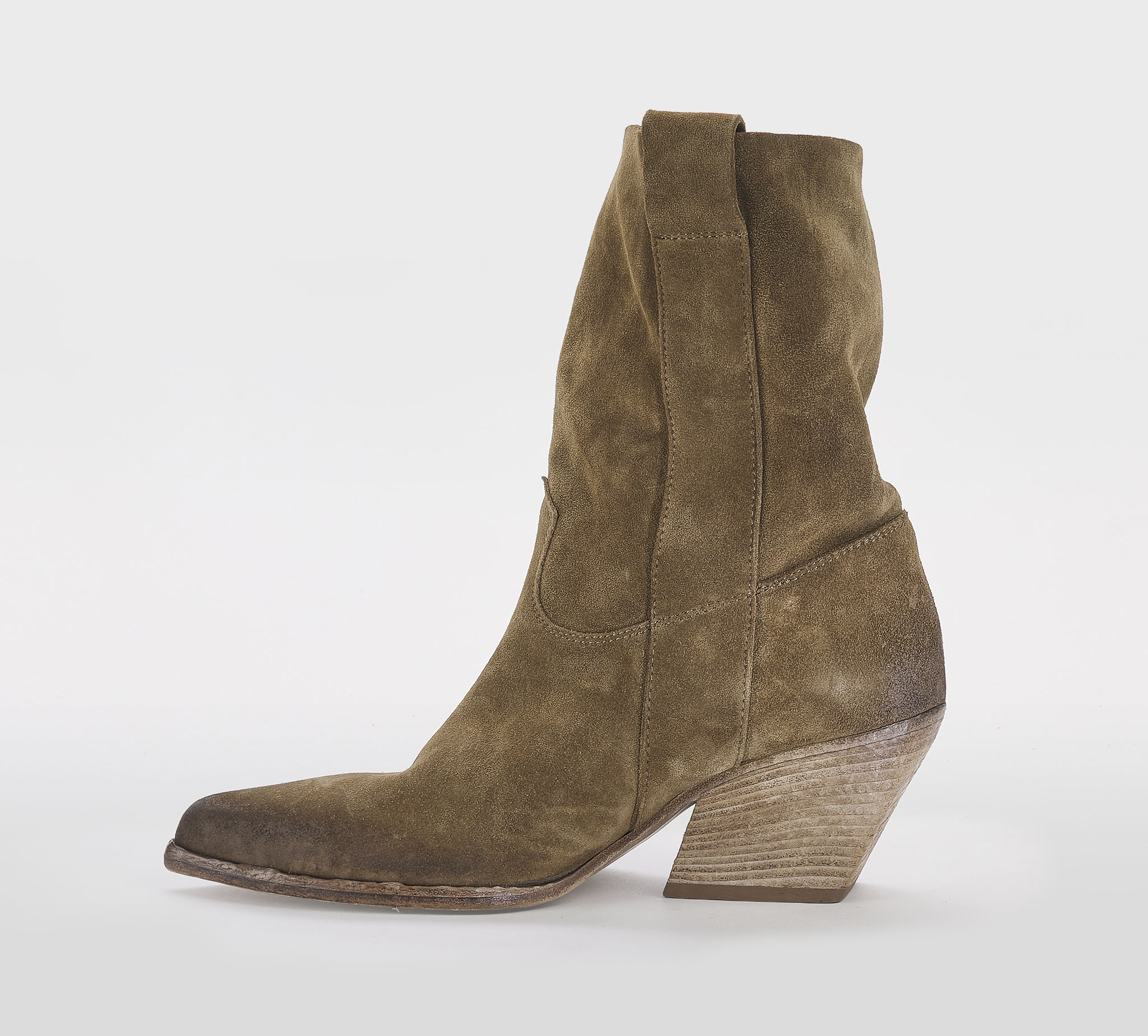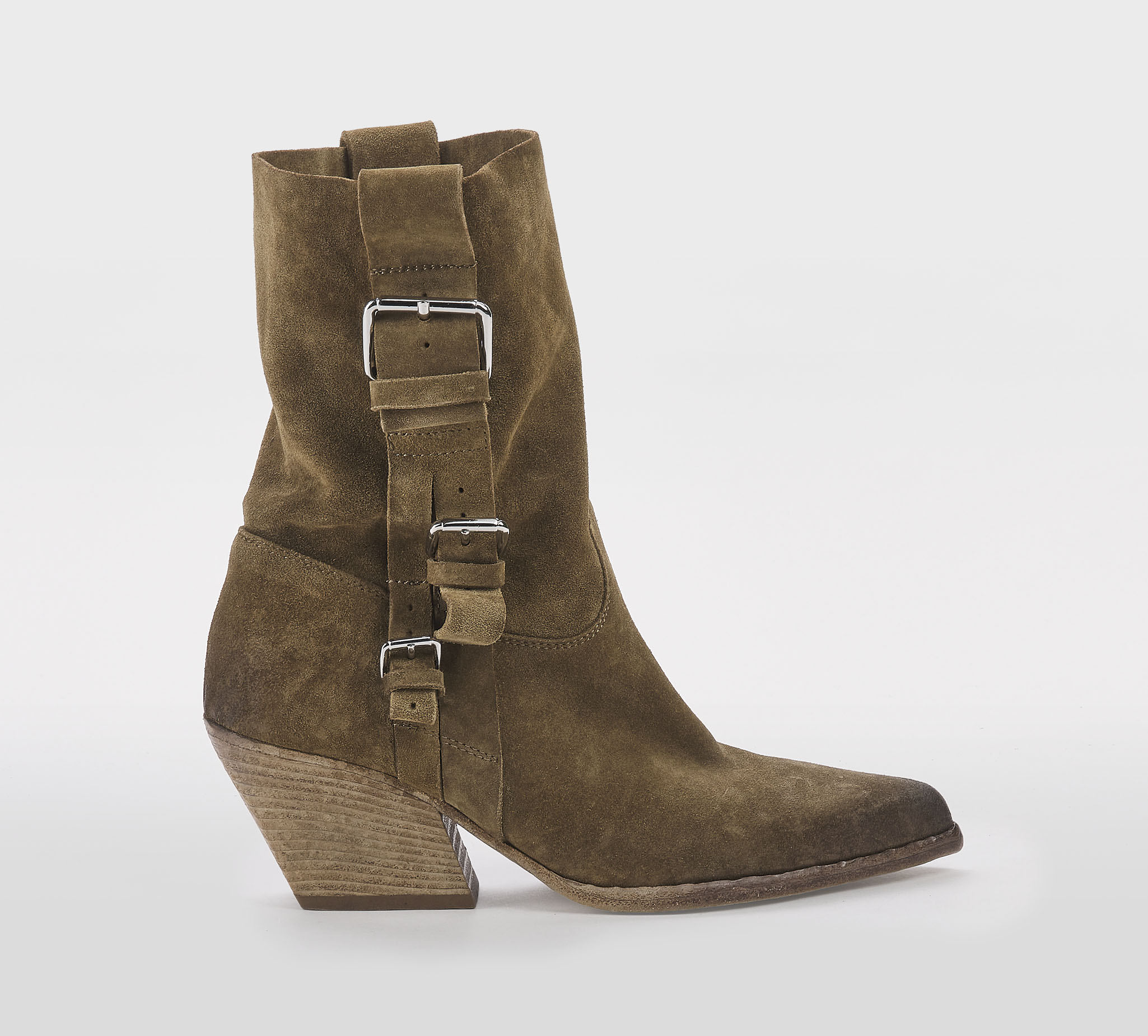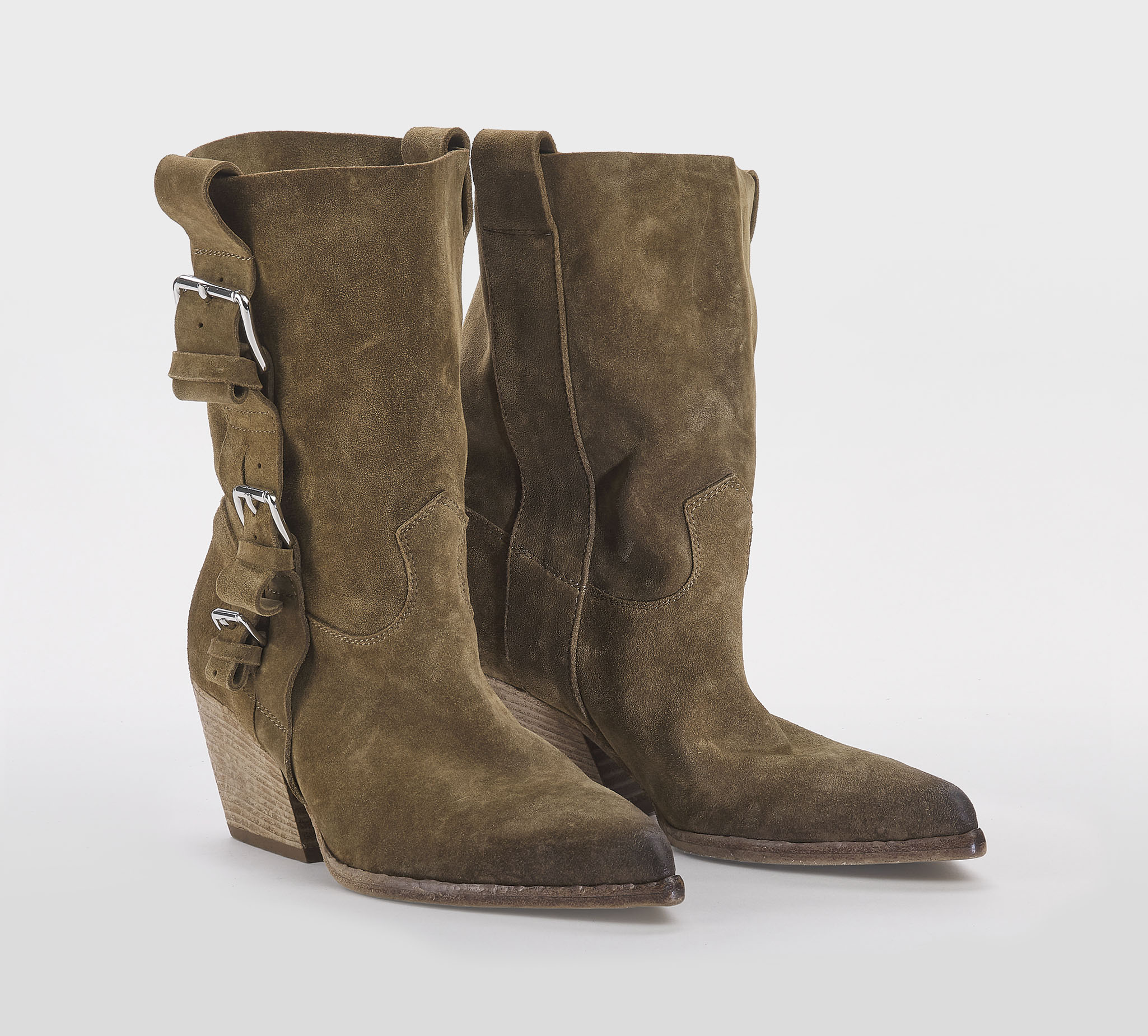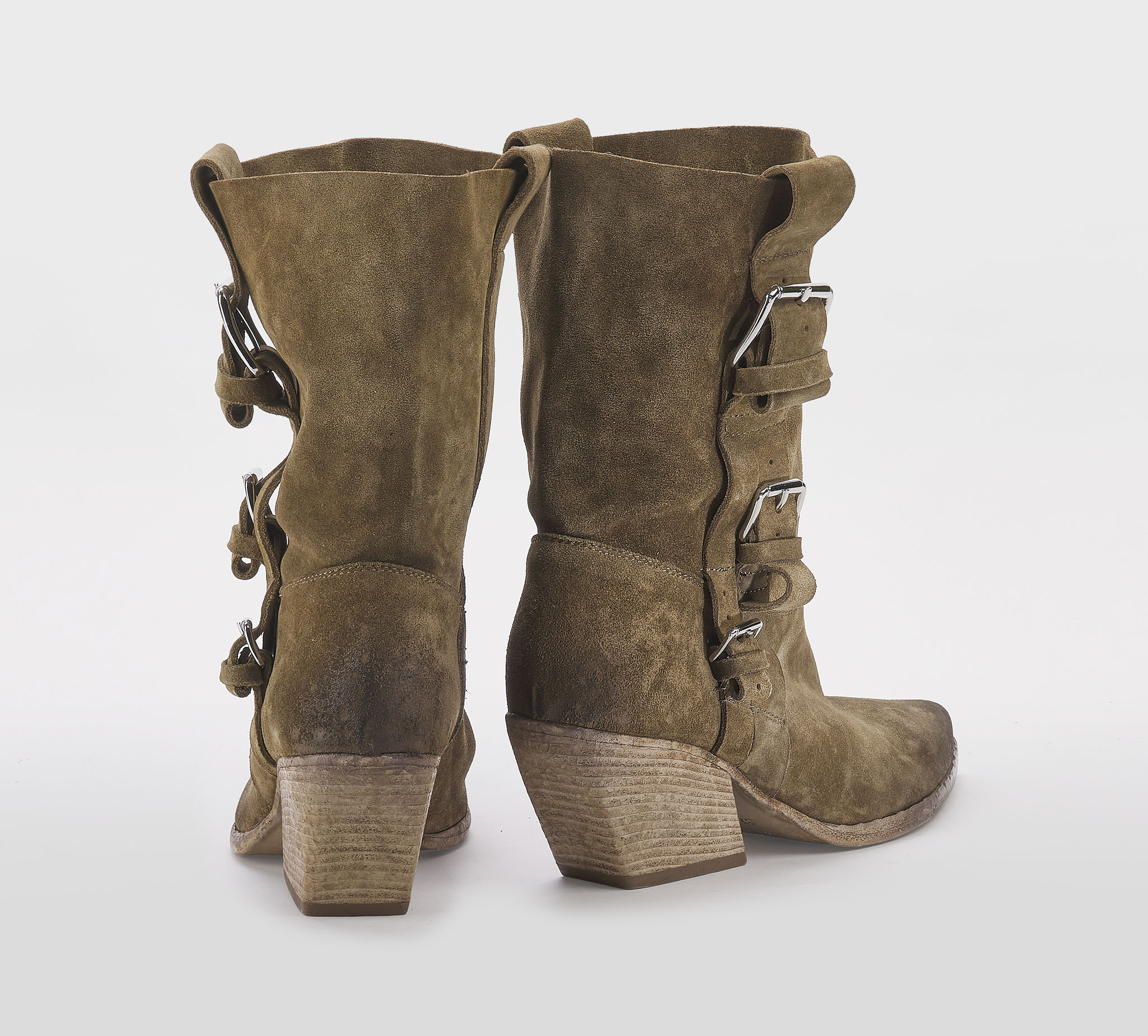 Texano in morbido camoscio fango -gambale a tubo -fibbie argento -tacco cm 8 -calzata regolare Fondo cuoio Made in Italy SS 26