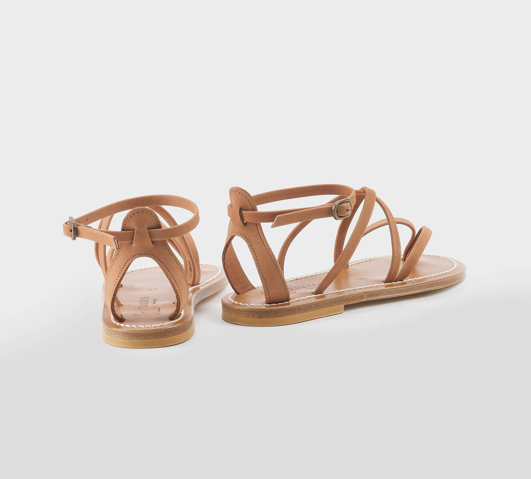 Sandalo infradito pelle cuoio -tallone semi chiuso -cinturino alla caviglia -fibbietta oro antico -tacco cm 1,5 -calzata regolare Fondo cuoio Made in S.Tropez SS 26