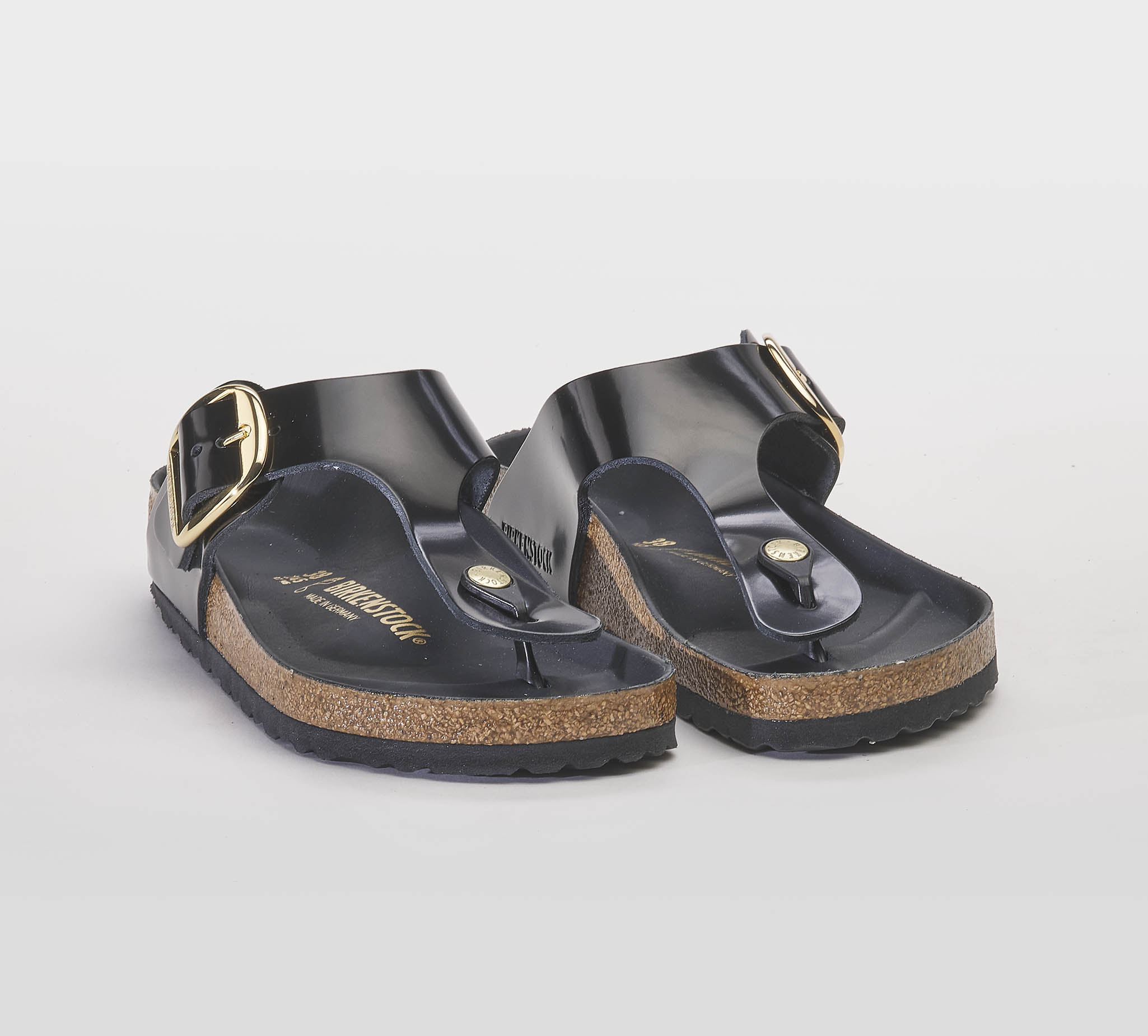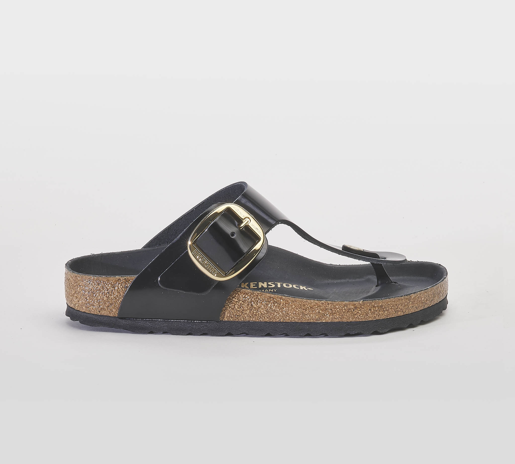 Gizeh Big Buckle in spazzolato nero -fibbia grande oro -plantare nero anatomico -calzata regolare Fondo gomma nero Made in Germany