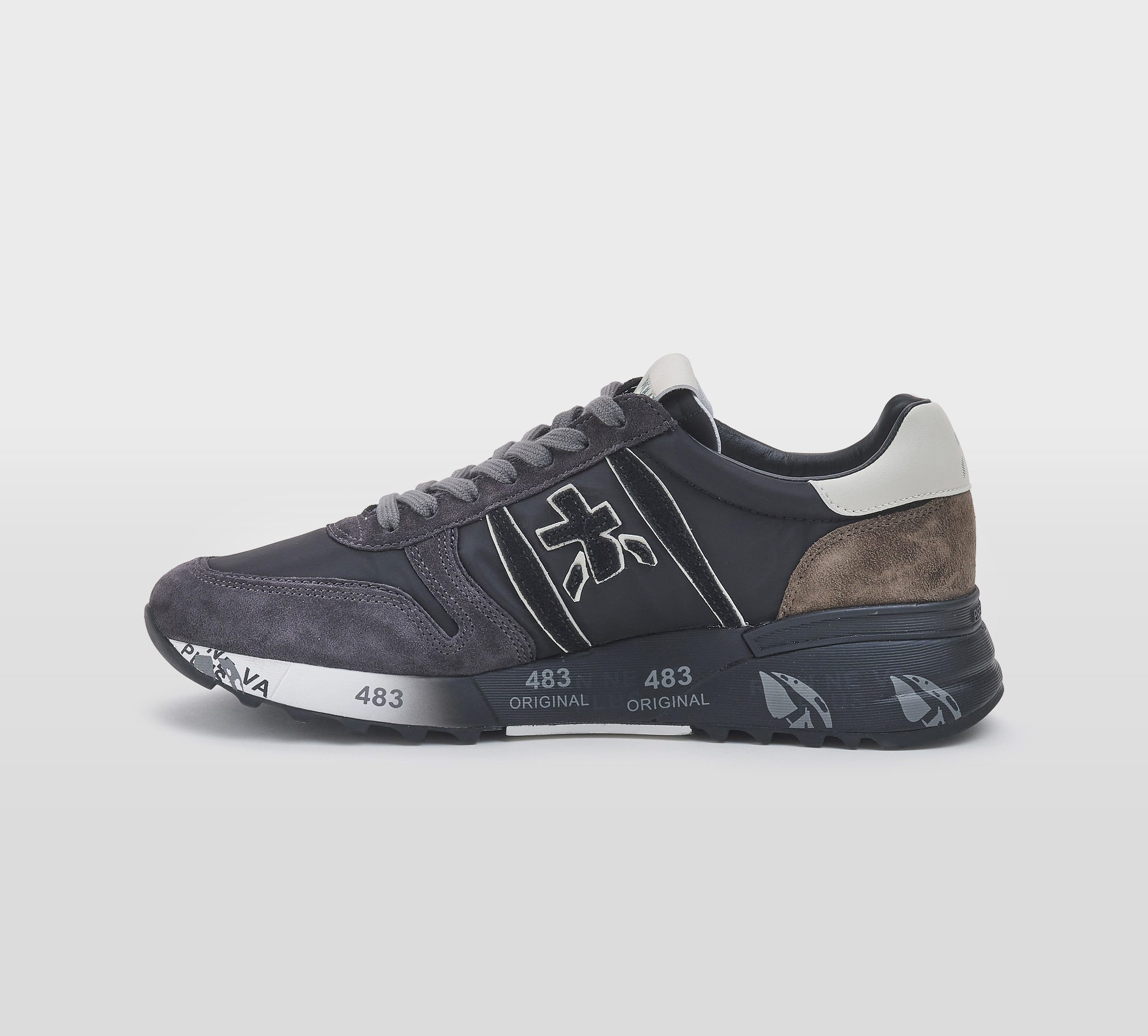 Sneakers Lander in camoscio fumo -inserti in tessuto nero -tallone cuoio bianco -laccio grigio -calzata regolare Fondo gomma logato FW 25
