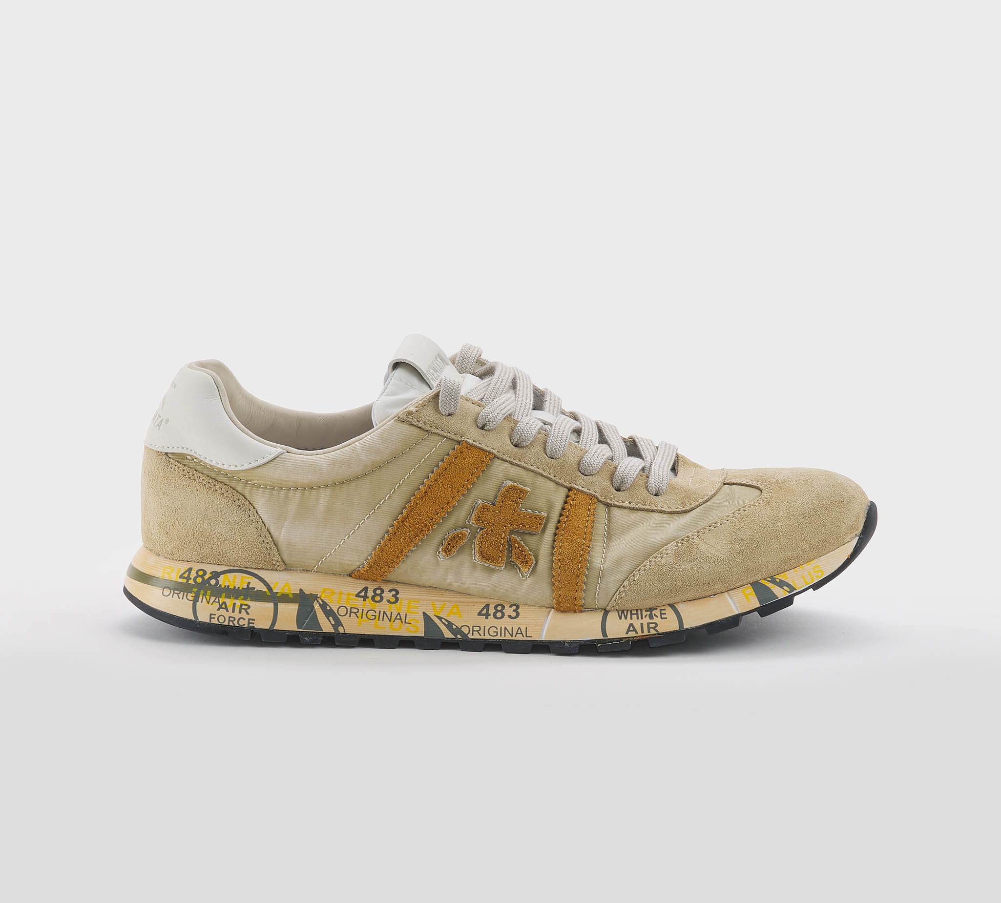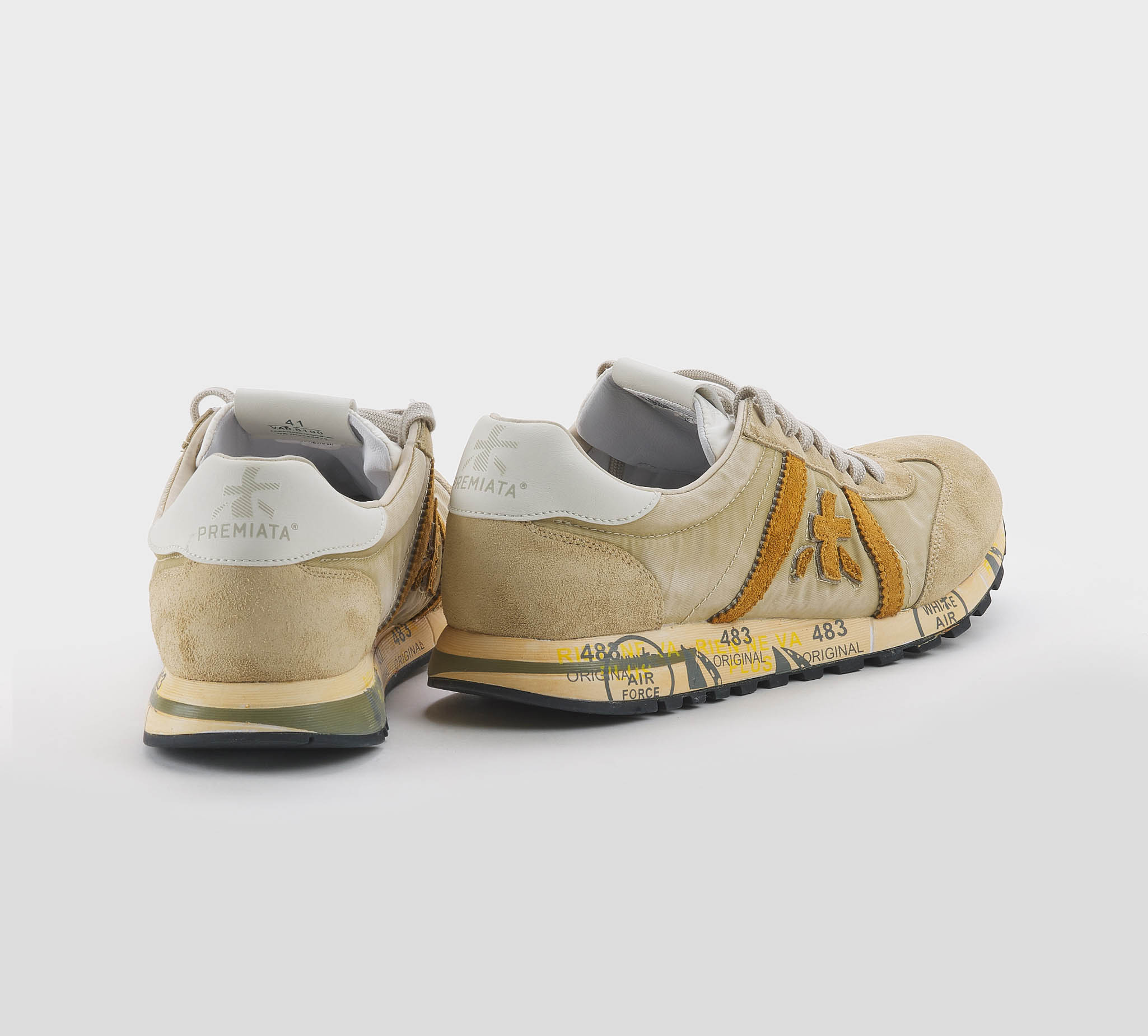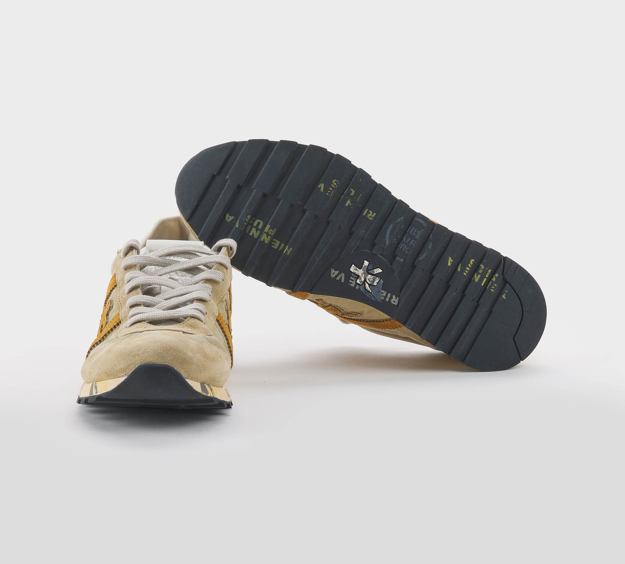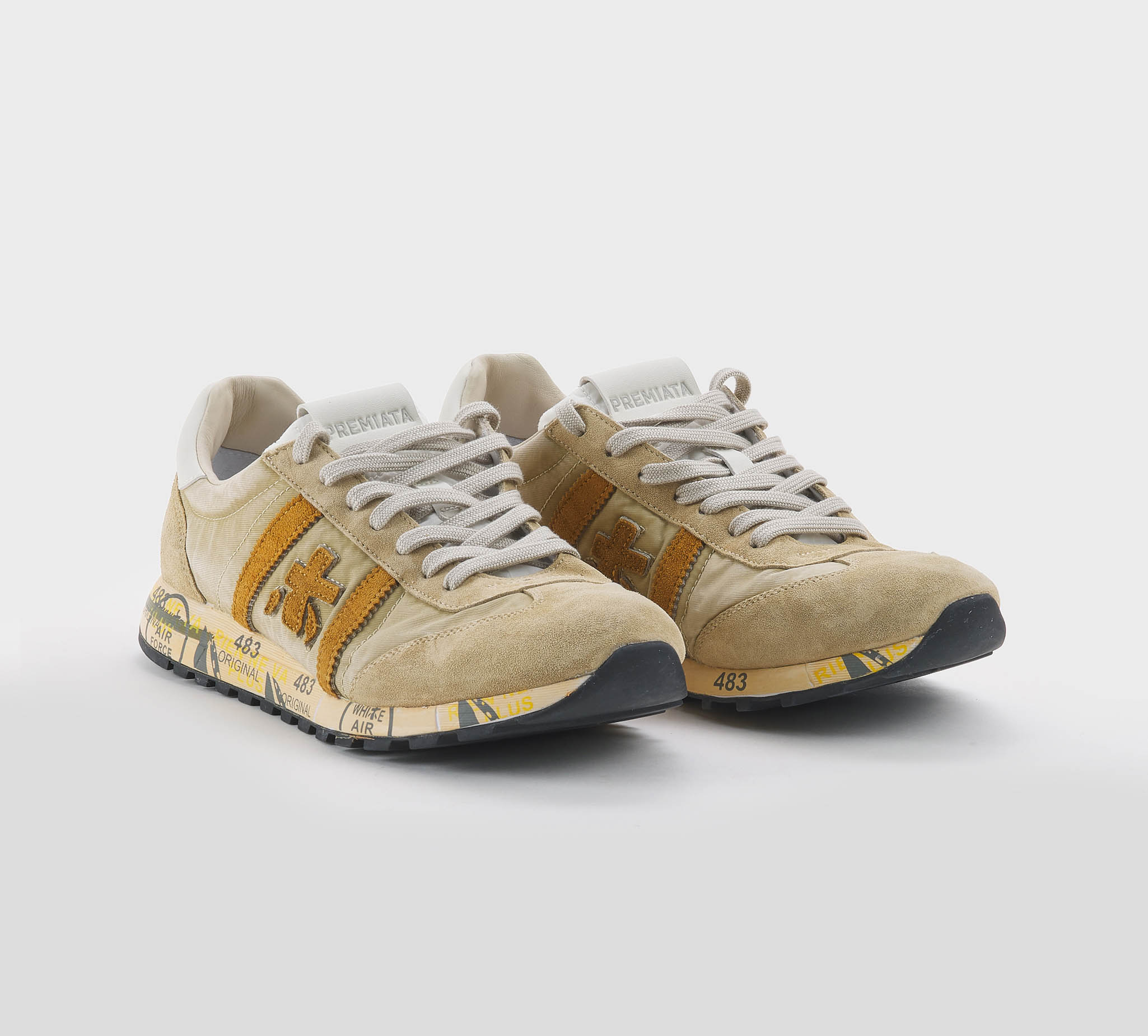 Sneakers Lucy in camoscio senape -inserti tessuto tecnico beige -logo camoscio cuoio -talloncino pelle bianco -laccio corda -plantare anatomico -calzata regolare Fondo gomma Made in Vietnam SS 26