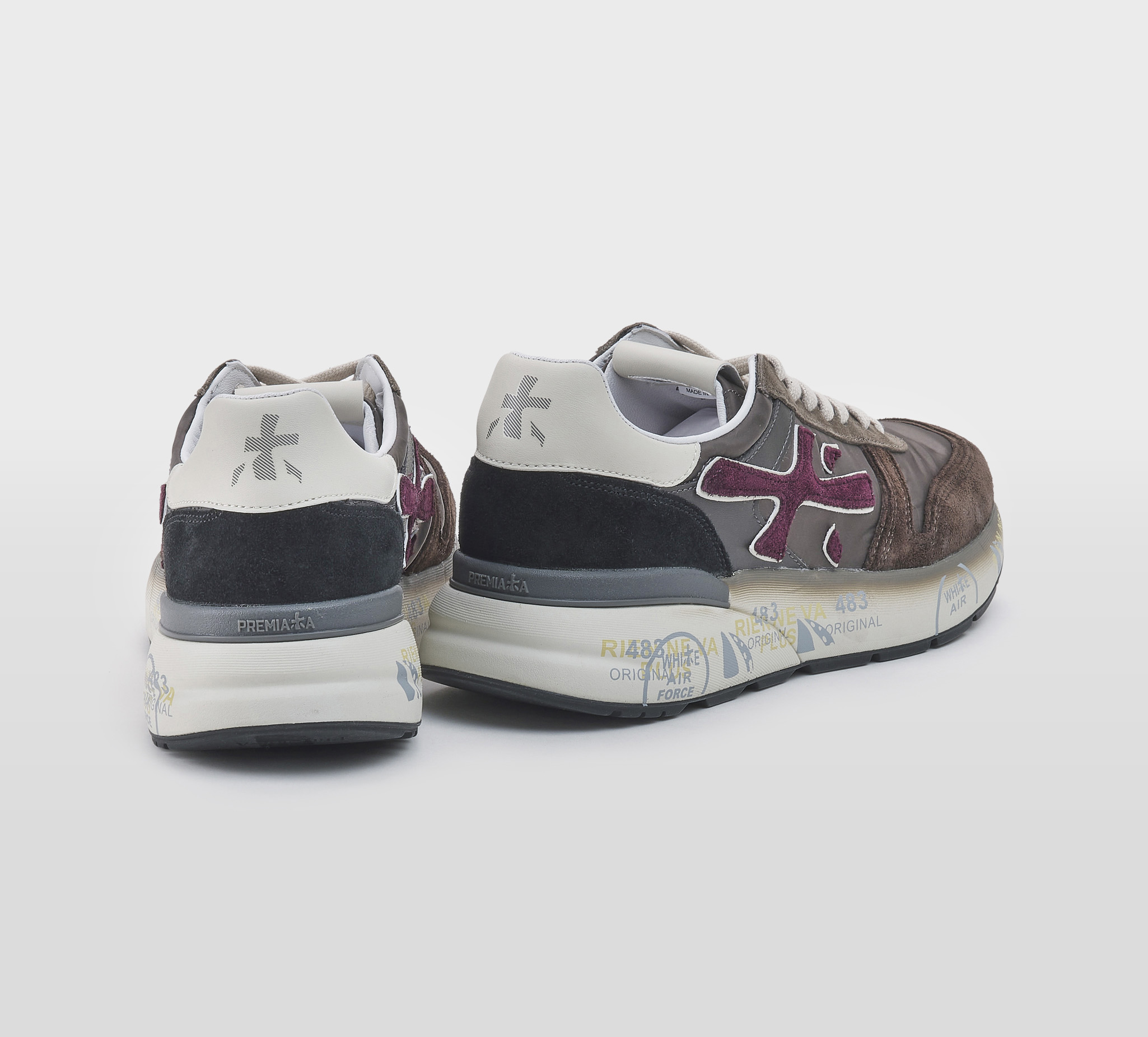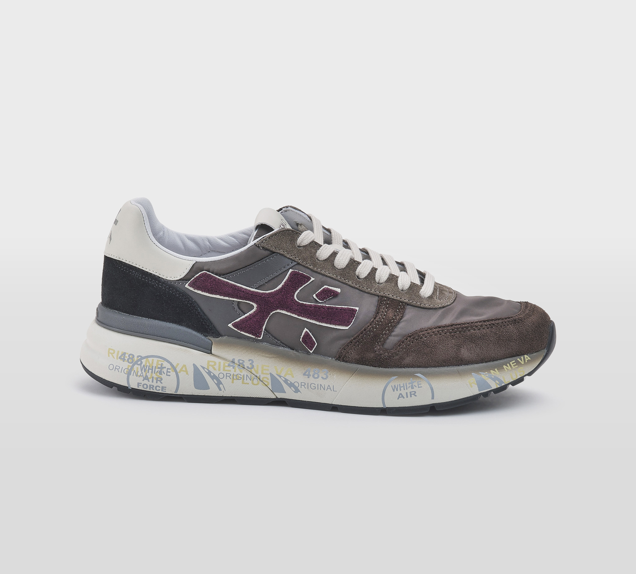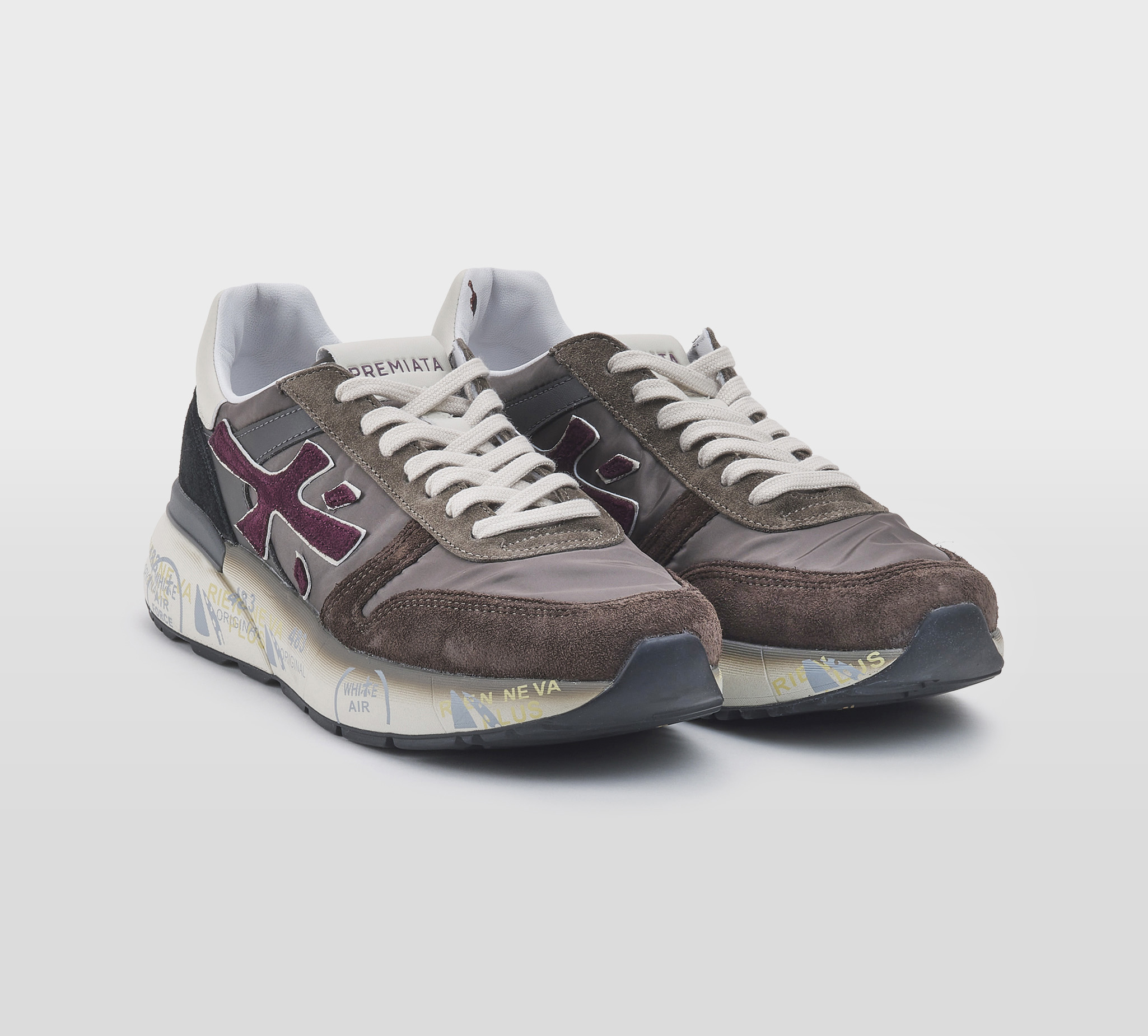 Sneakers Mick in camoscio marrone -inserti in tessuto tecnico caffè -logo vinaccia -talloncino pelle bianco sporco -laccio bianco -calzata regolare Fondo gomma logato FW 25