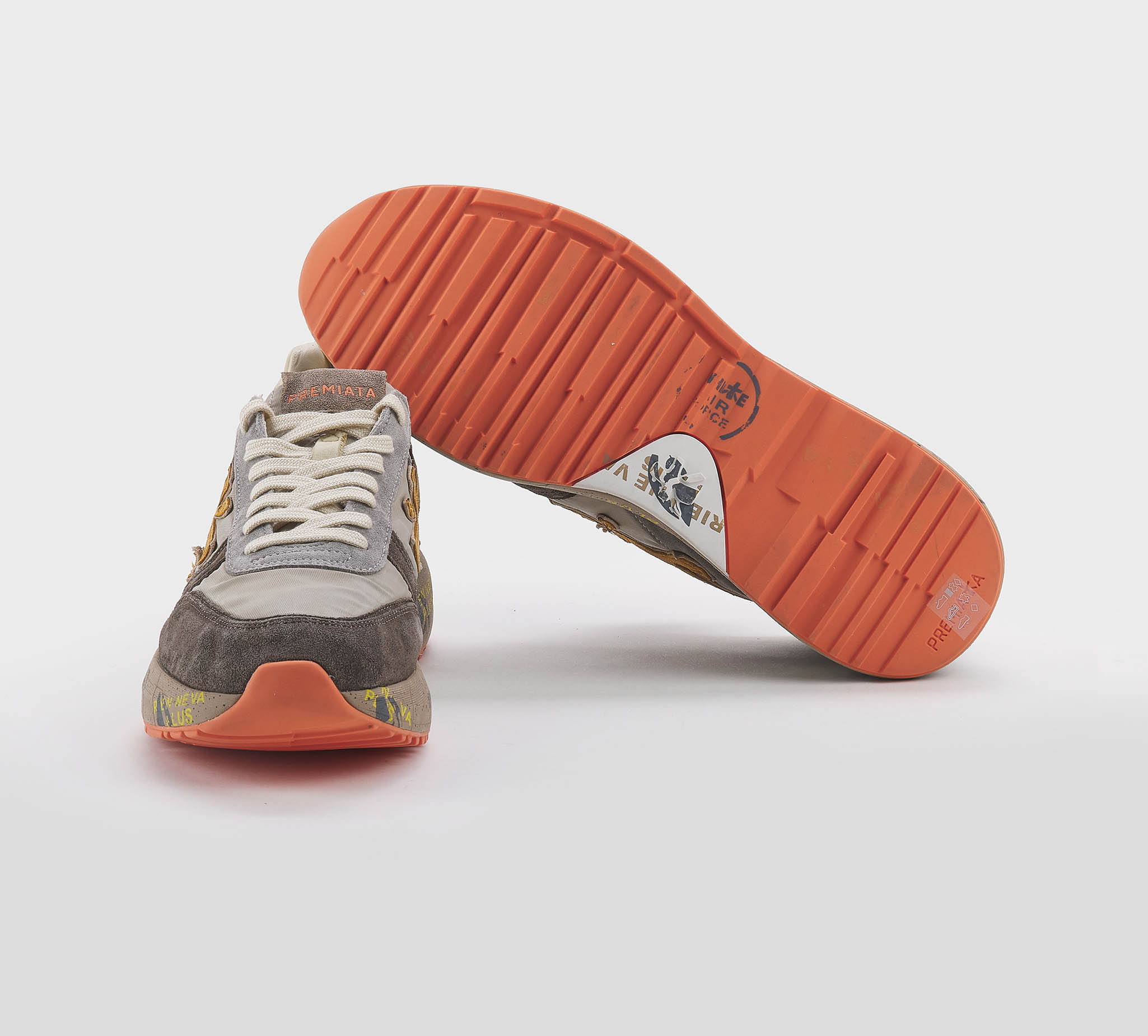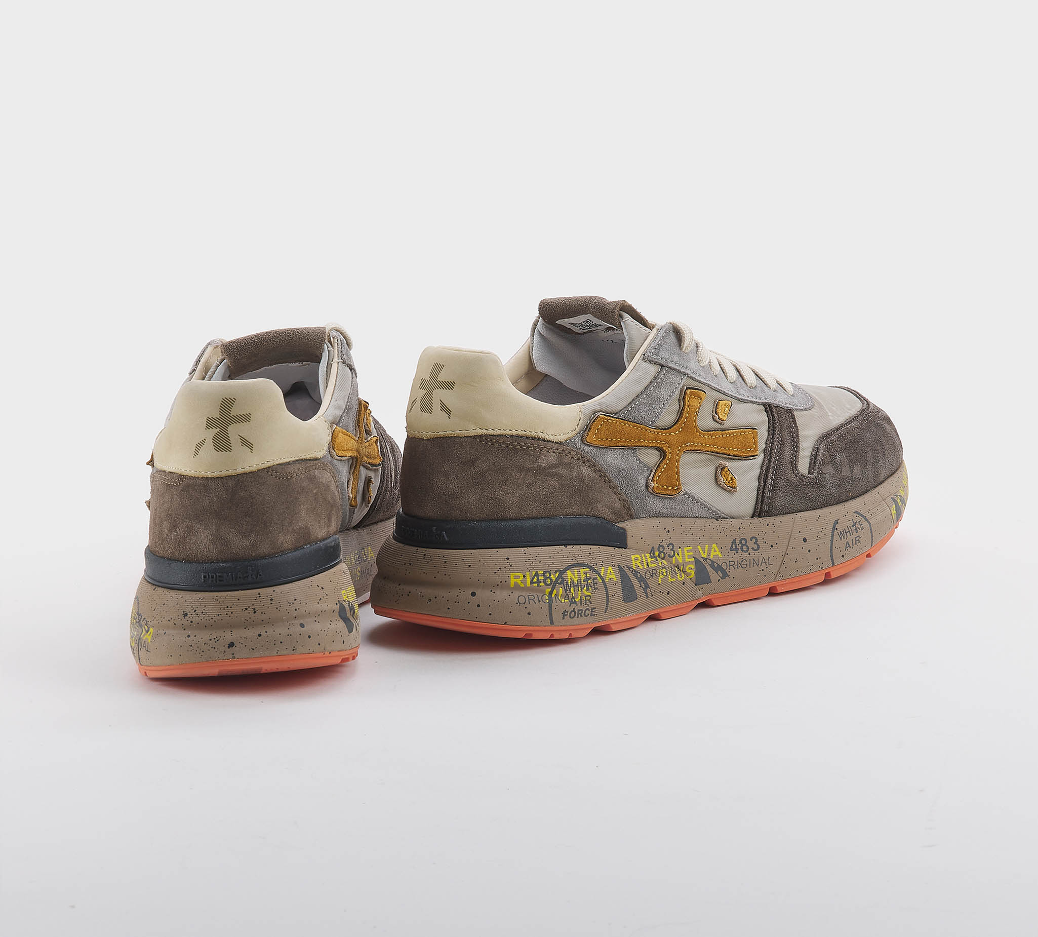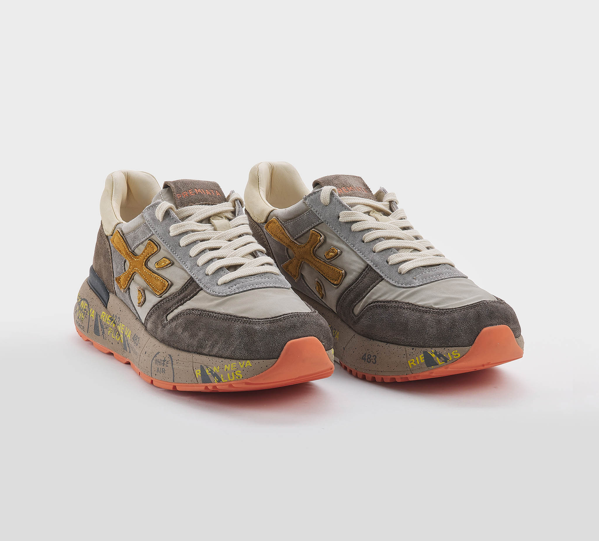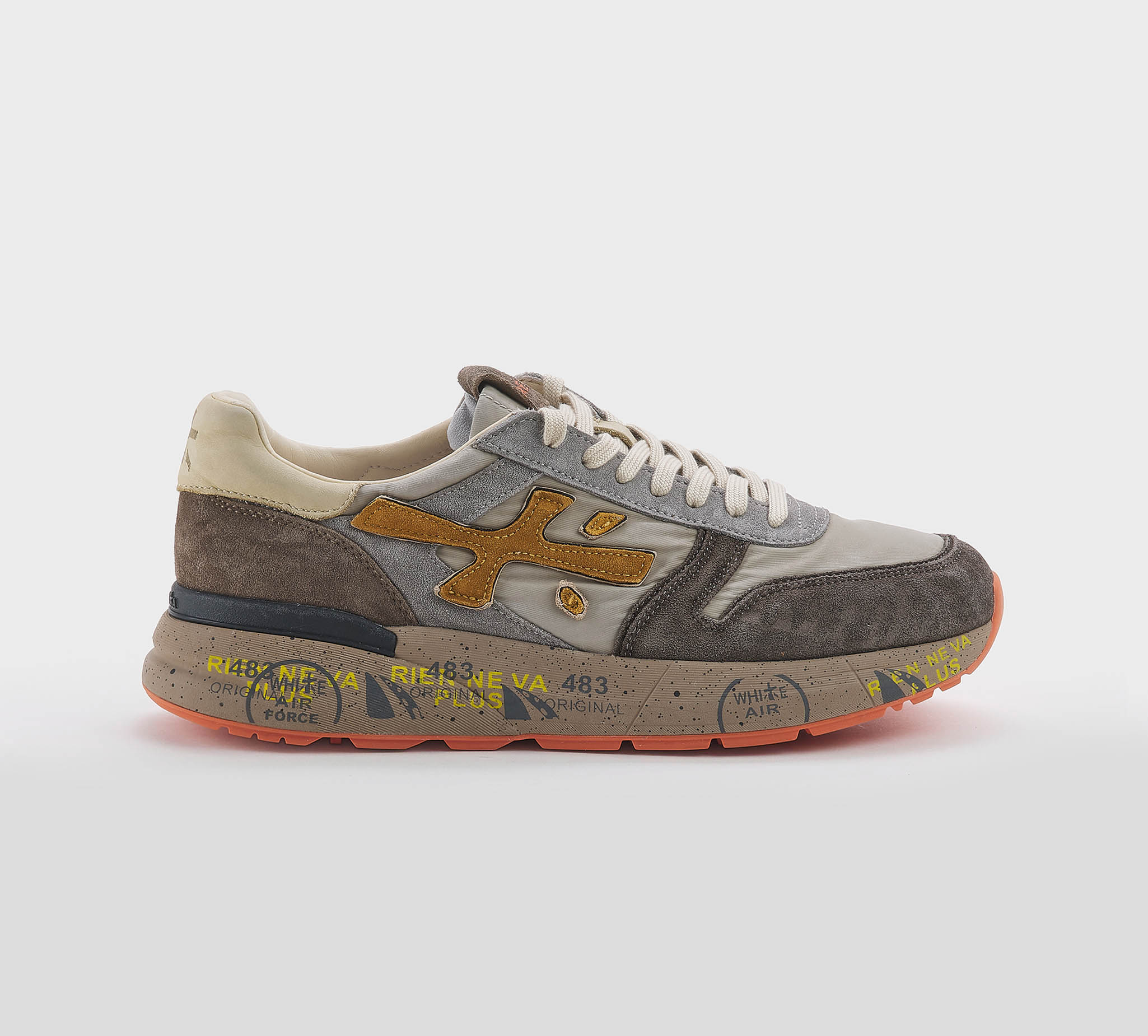 Sneakers Lucy in camoscio moro grigio -inserti tessuto tecnico ncciola -logo camoscio cuoio -talloncino pelle beige -laccio corda -plantare anatomico -calzata regolare Fondo gomma Made in Vietnam SS 26