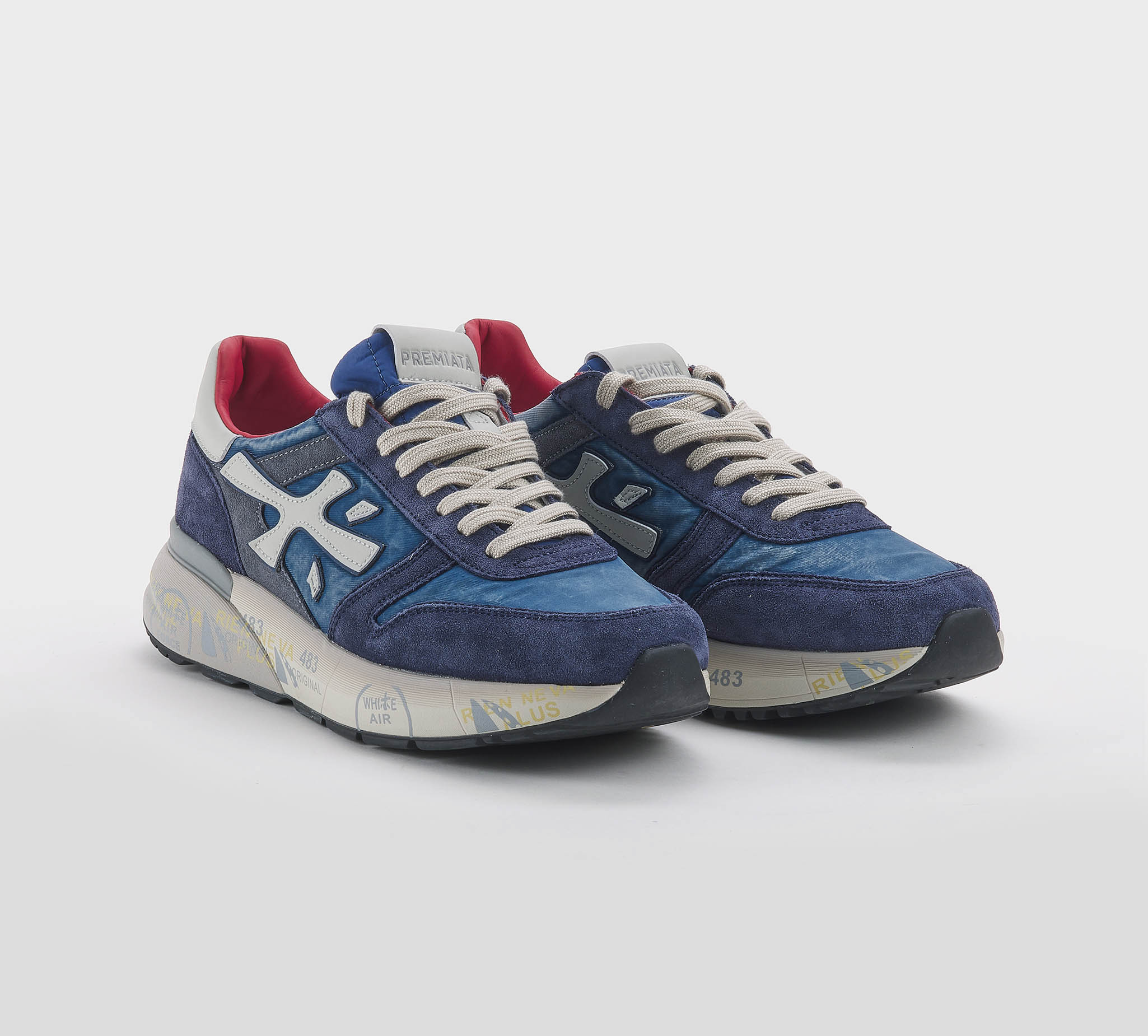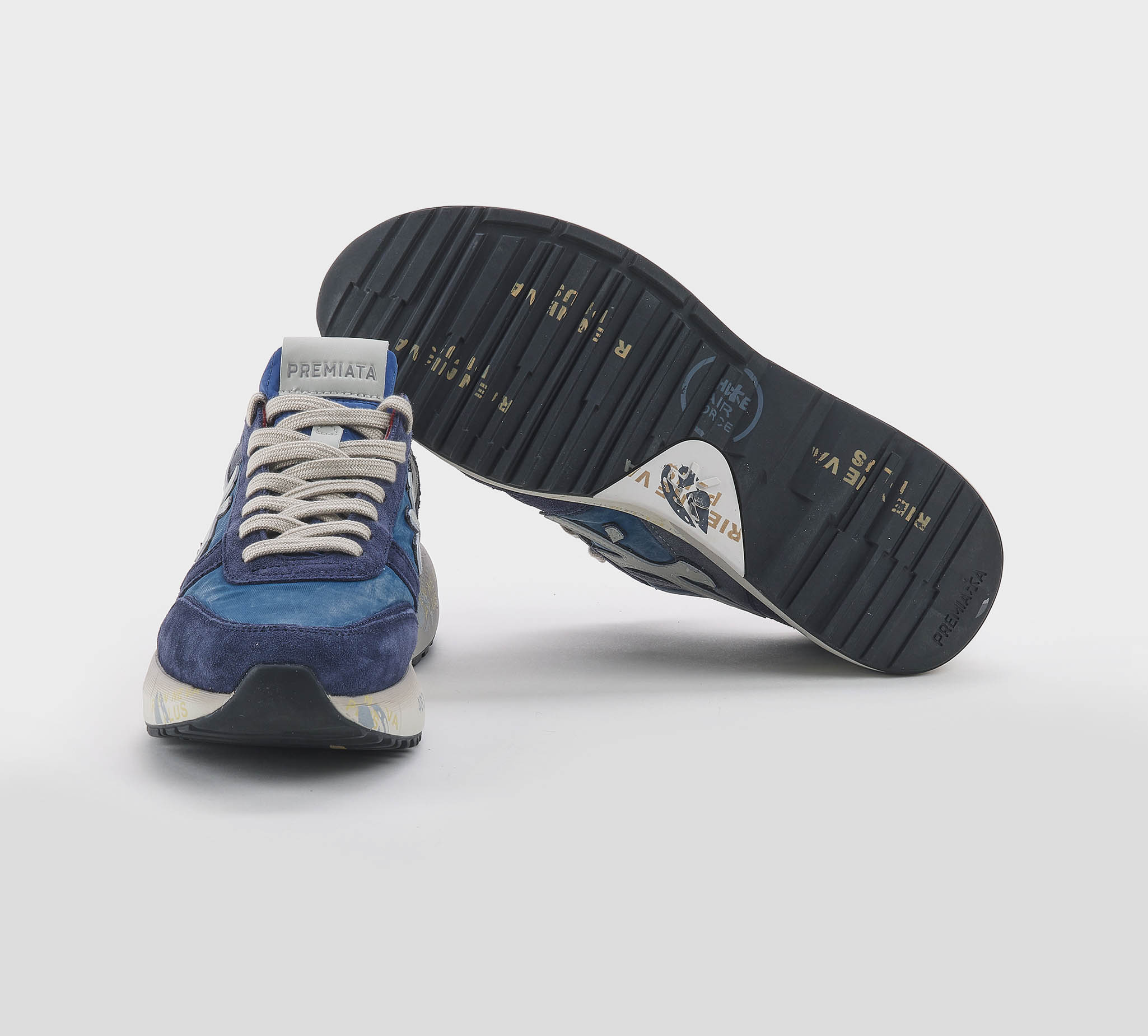 Sneakers Lucy in camoscio blu -inserti tessuto tecnico blu delavè -logo pelle ghaccio -talloncino pelle ghiaccio -laccio corda -plantare anatomico -calzata regolare Fondo gomma Made in Vietnam SS 26