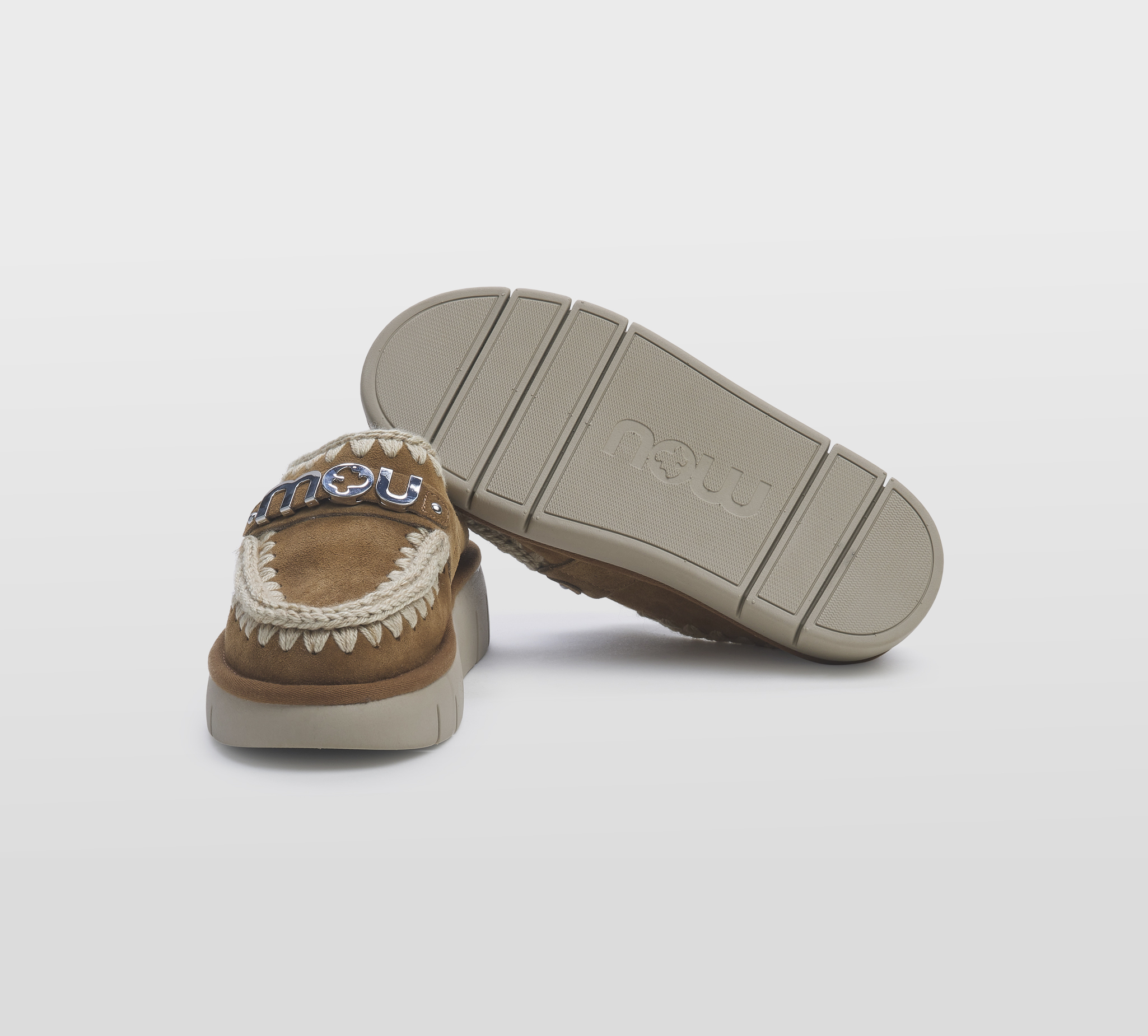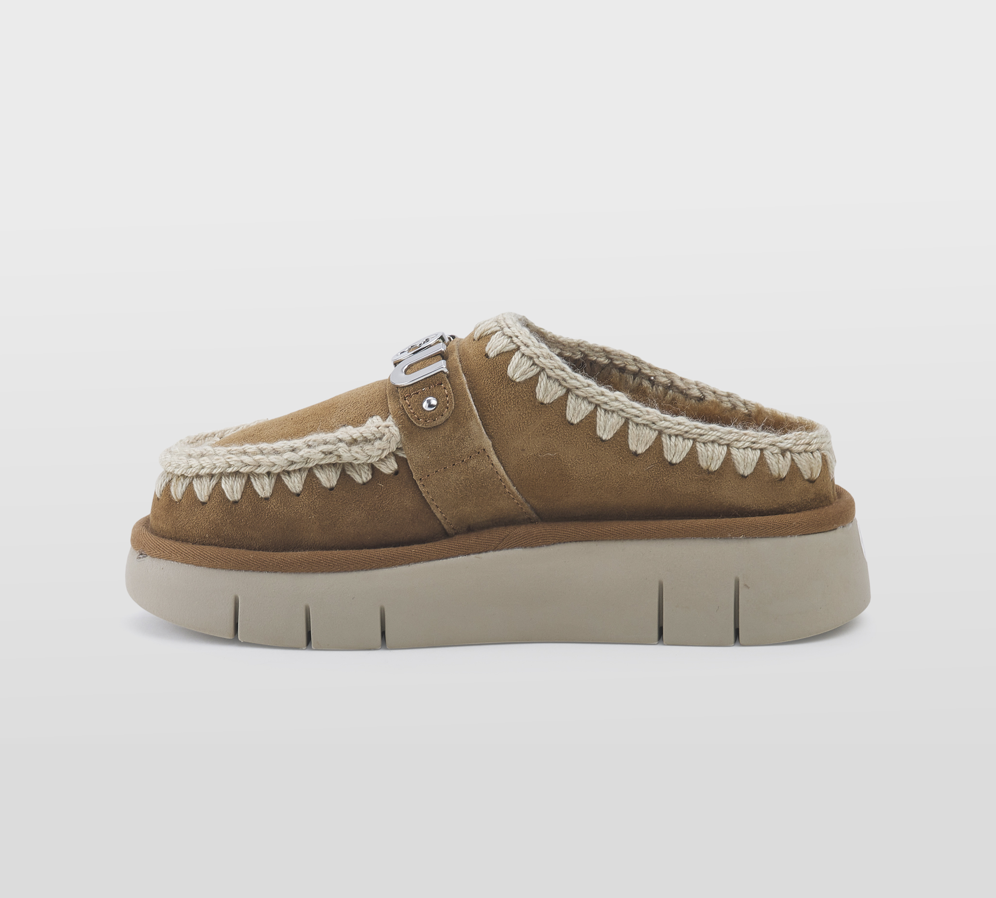 Sabot in montone cuoio -impunture a vista -barretta con logo argento -pelo interno fango -calzata scarsa Fondo gomma alto Made in China FW 25