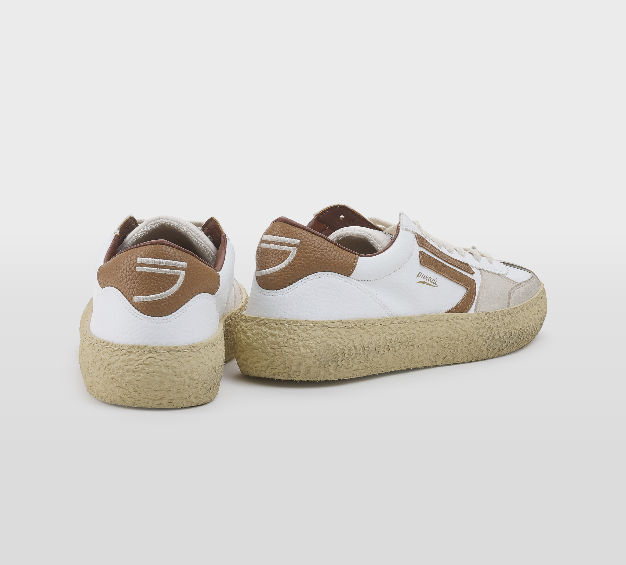 Sneakers in pelle bianco -talloncino pelle cuoio -inserti in camoscio tortora -bande pelle cuoio -laccio panna -calzata regolare Fondo gomma FW 25